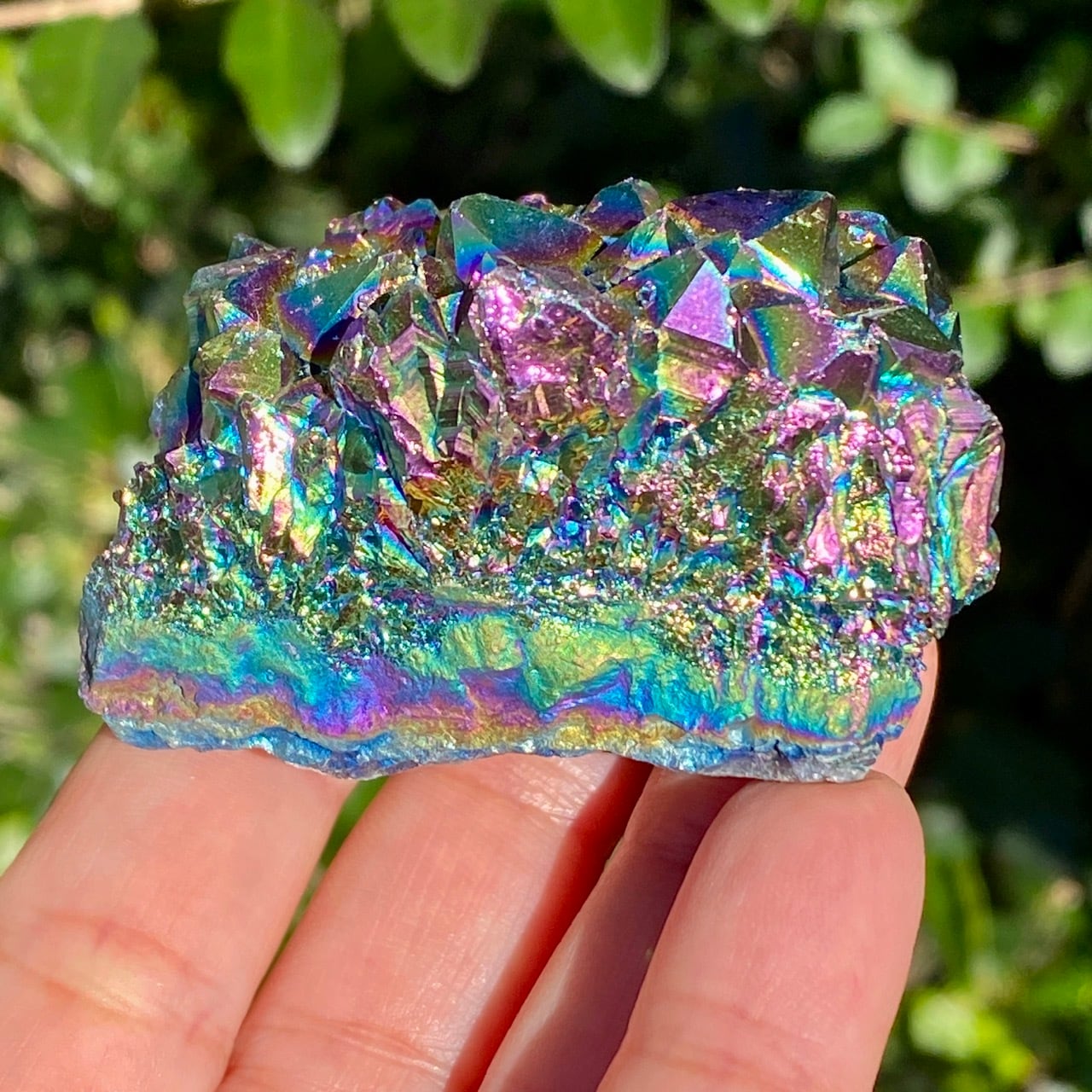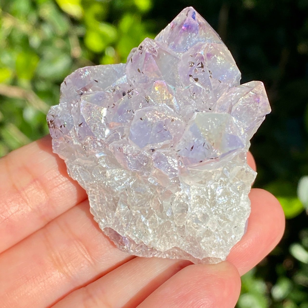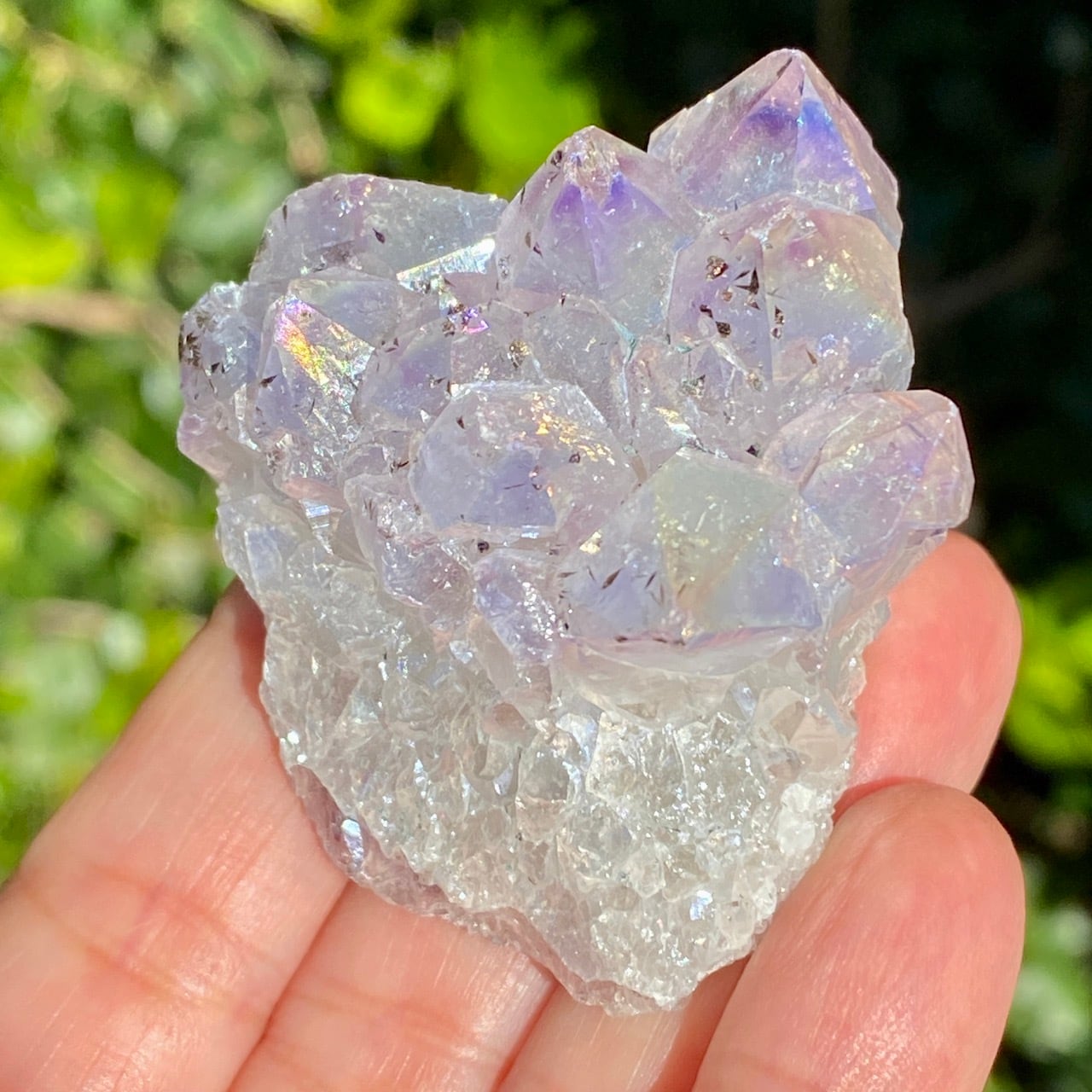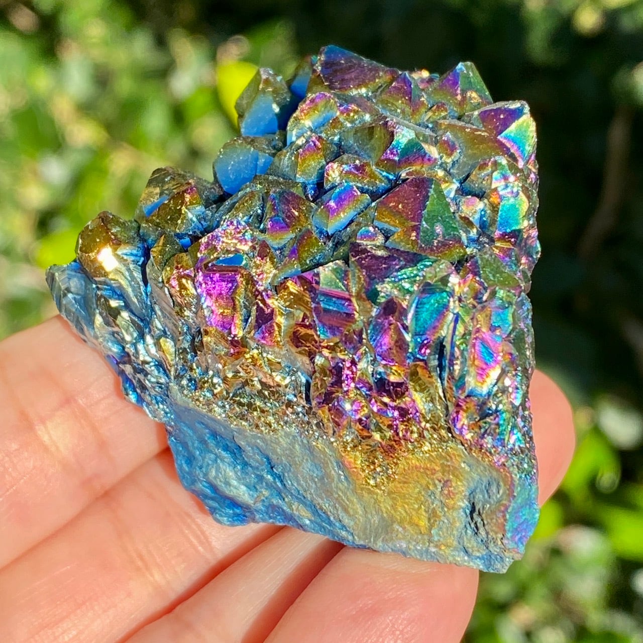 ブラジル産アメジストクラスターの天然石に酸化チタンを蒸着させること(金属コーティングを施すこと)により美しい虹色の輝きや玉虫色を作り出しています。
