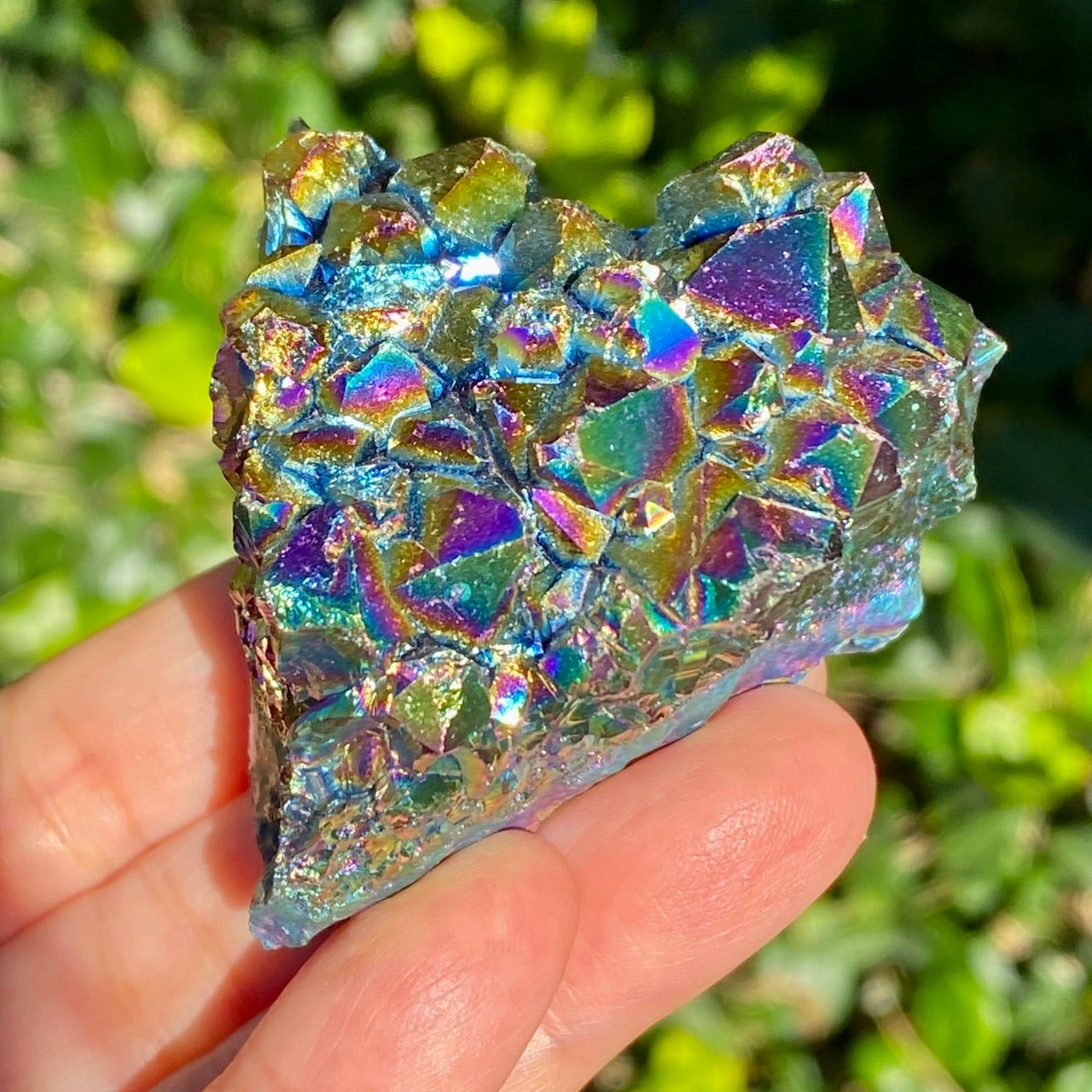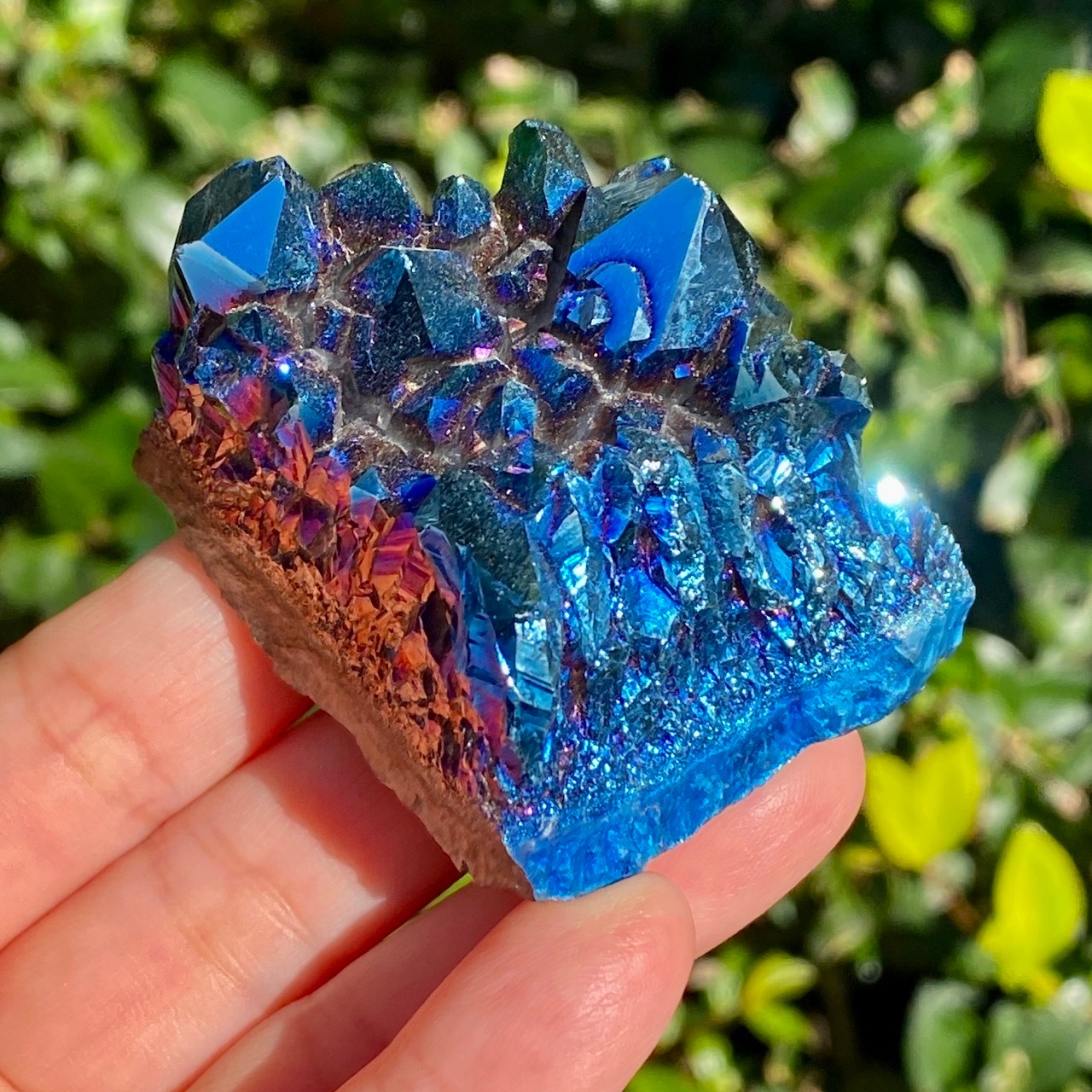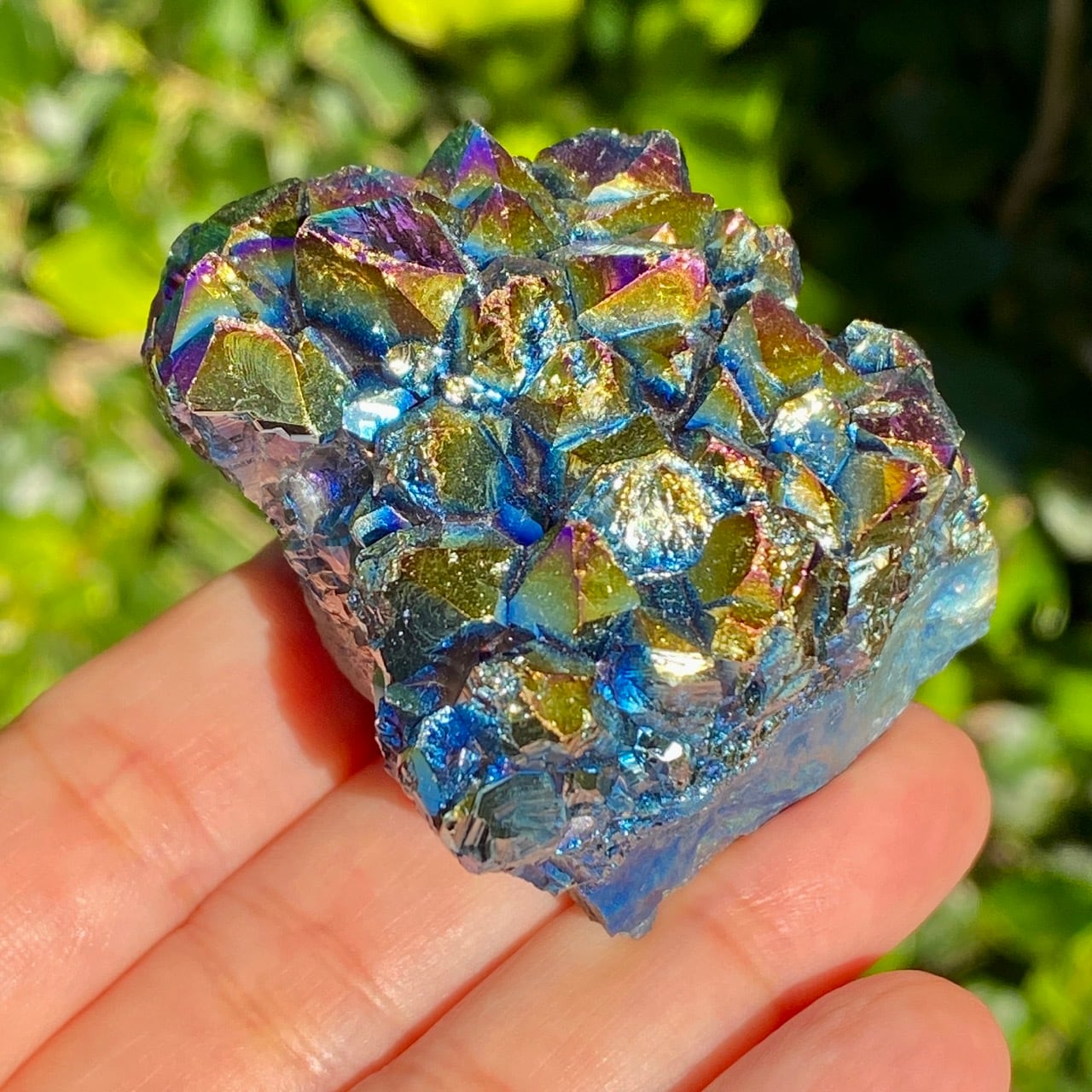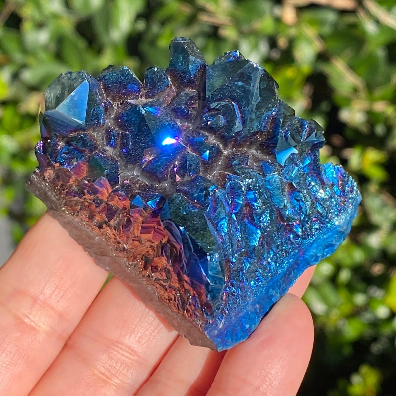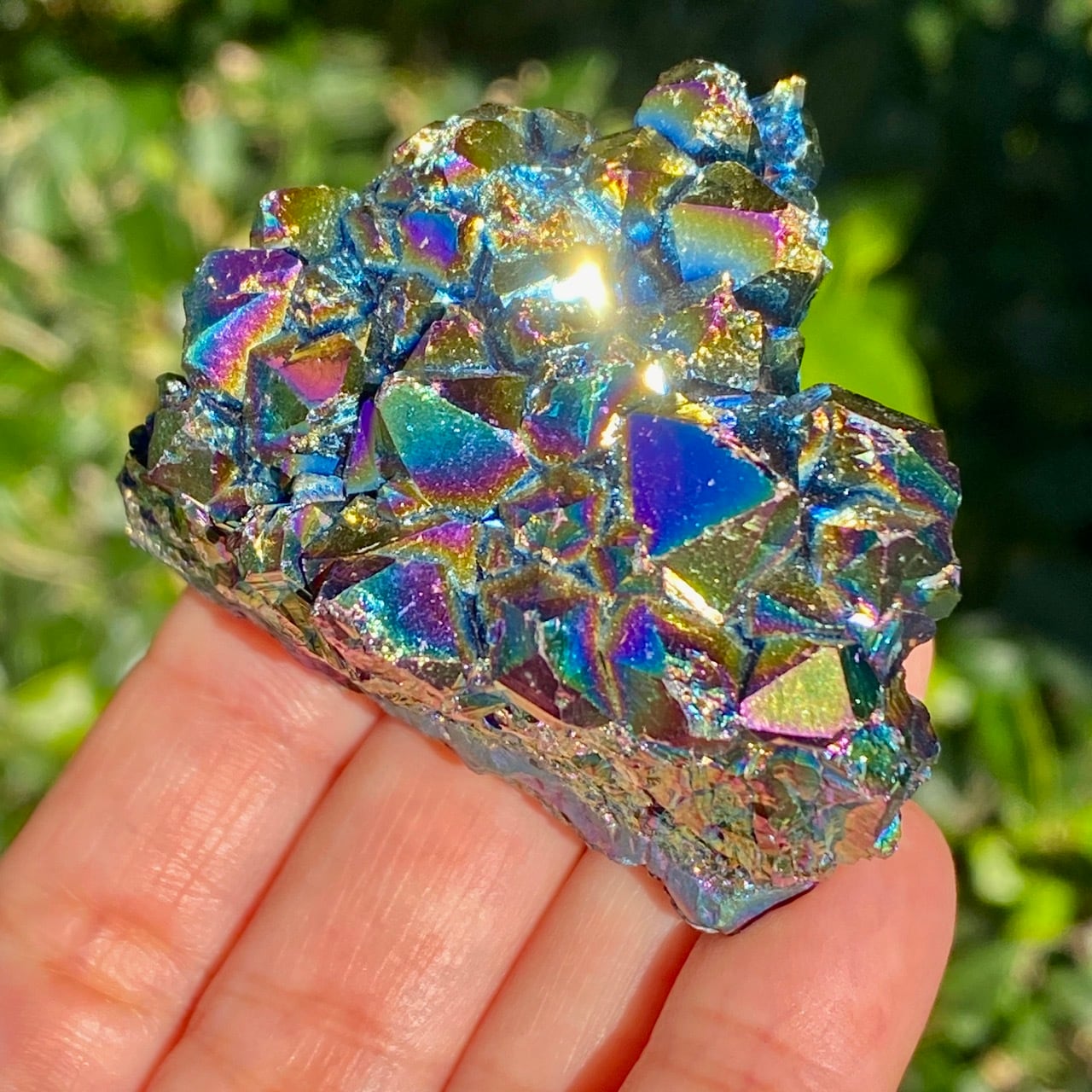ブラジル産アメジストクラスターの天然石に酸化チタンを蒸着させること(金属コーティングを施すこと)により美しい虹色の輝きや玉虫色を作り出しています。