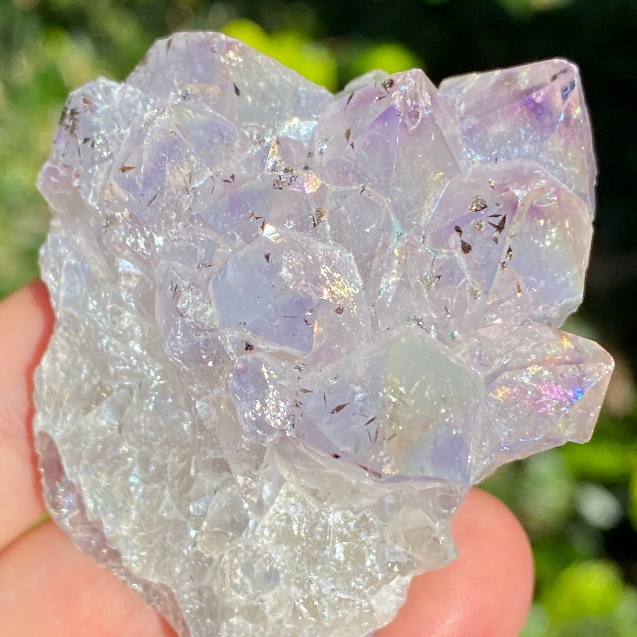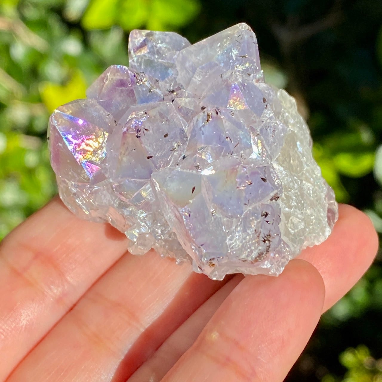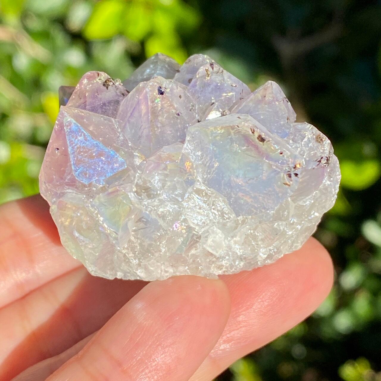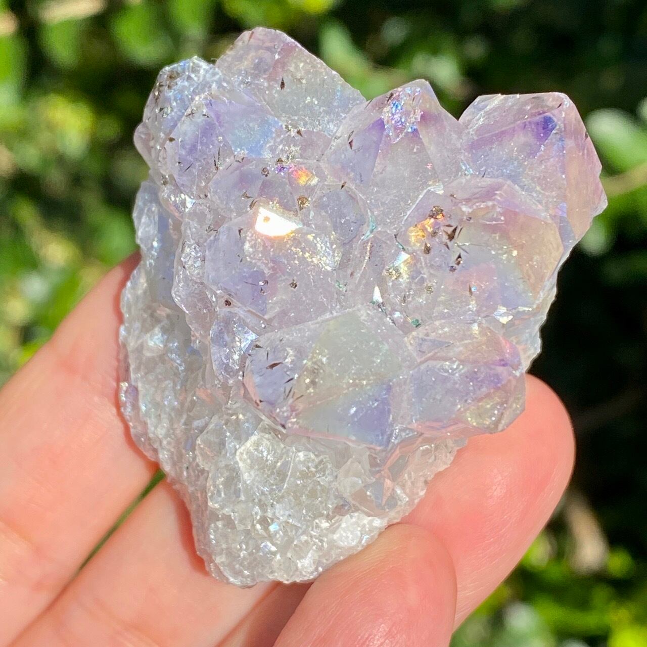 名前の如くまさしくアンジェリックな雰囲気を醸し出している、優しい虹色のきらめきが見られるエンジェルオーラ。エンジェルオーラアメジストは、クラウンチャクラとサードアイに働きかけ、直感と高次の意識を目覚めさせながら、同時にリラックスしたエネルギーを与え、内なる平和を保つストレス緩和剤と言われています。