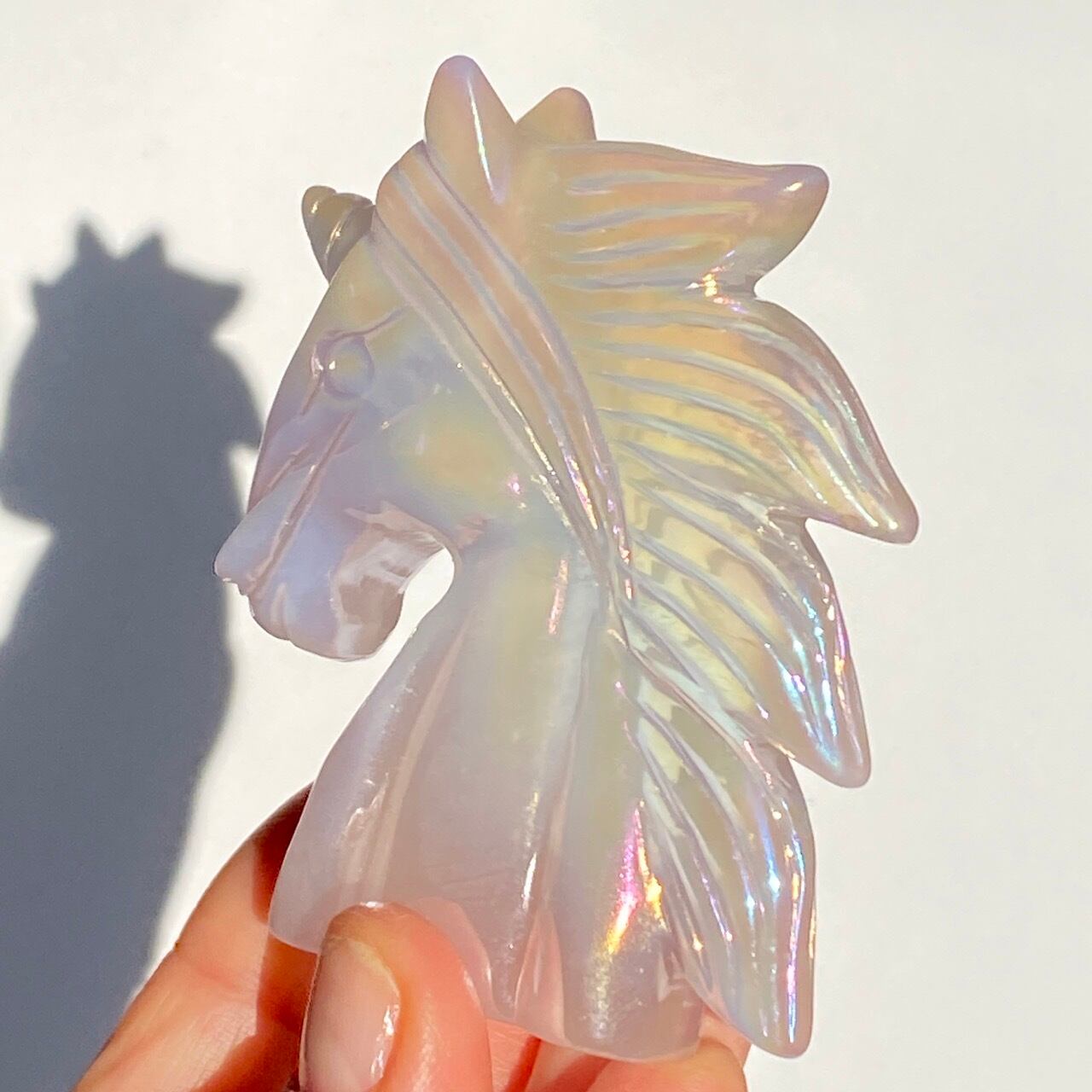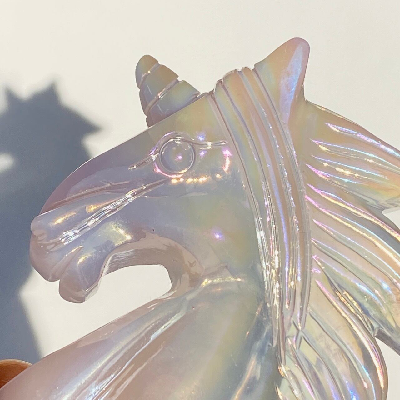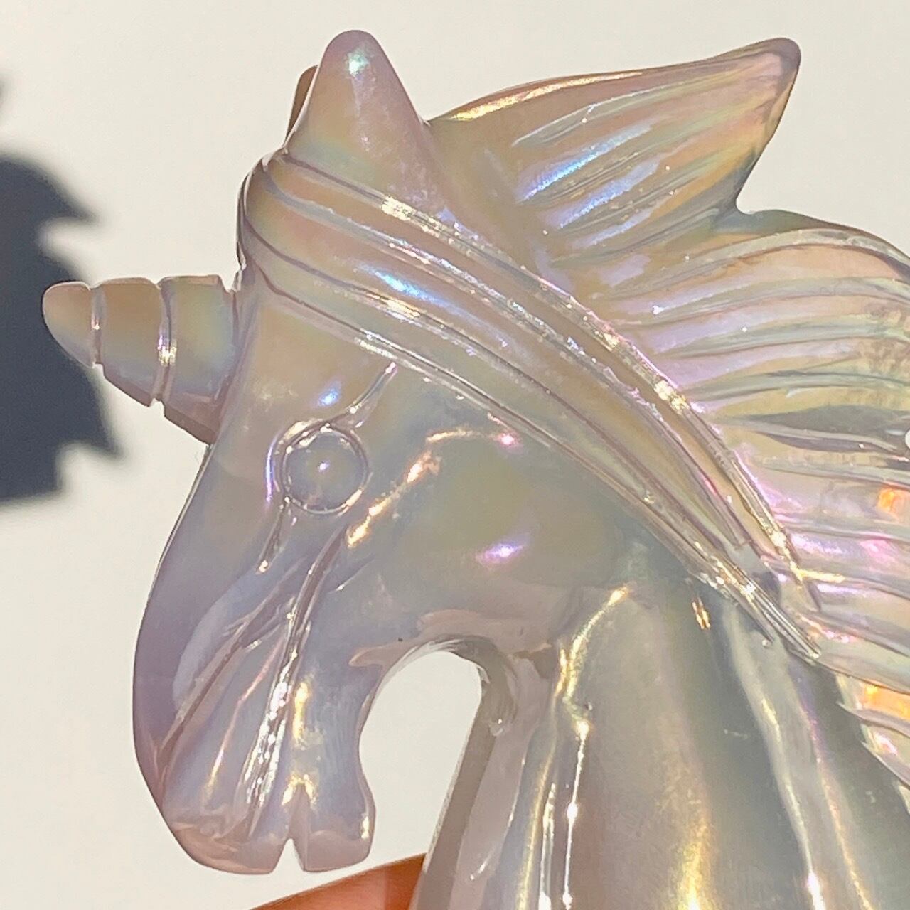 ユニコーンのカービングが施された天然のラベンダーフローライト(蛍石)の表面に酸化チタンを蒸着させる事で柔らかい虹色のオーラを纏っています。