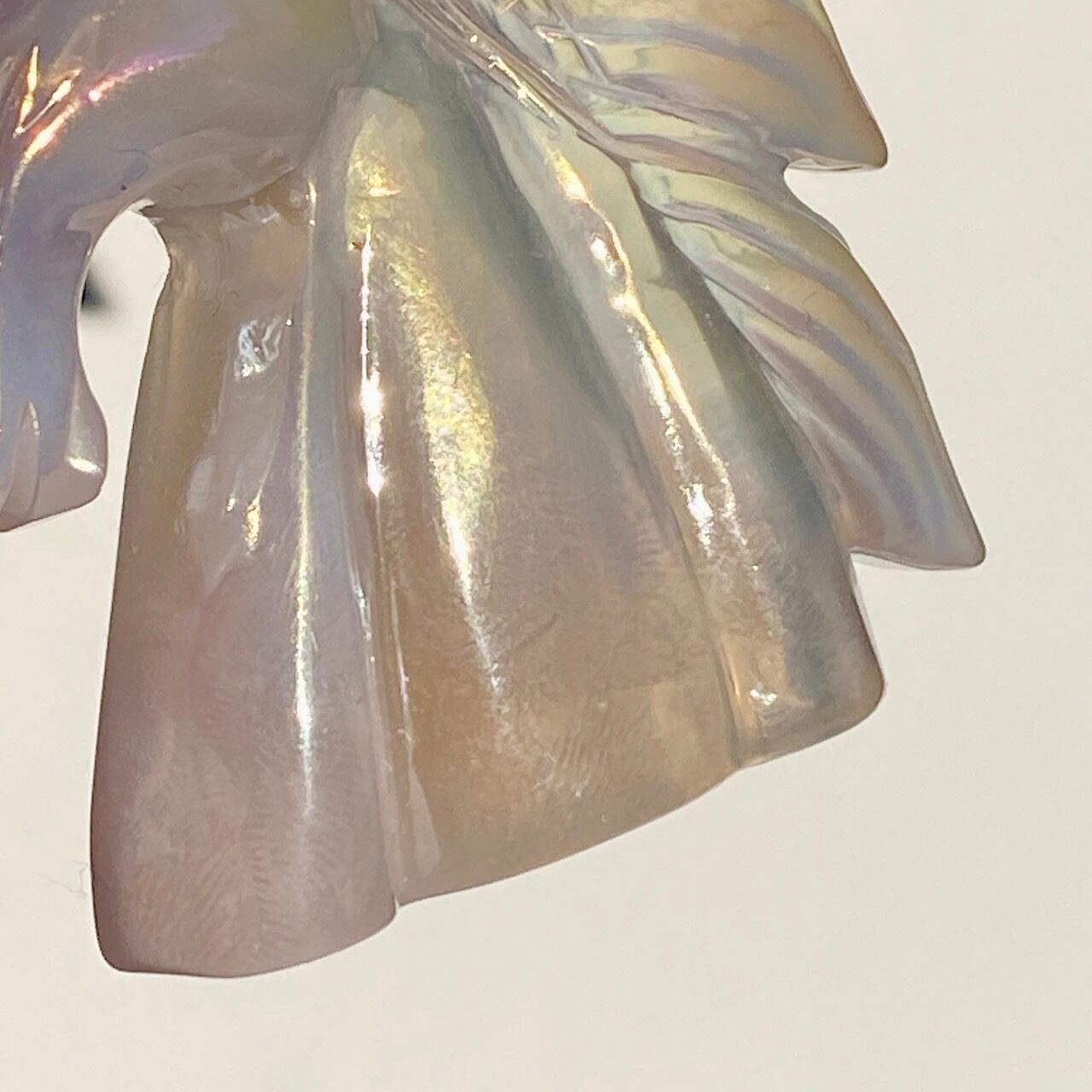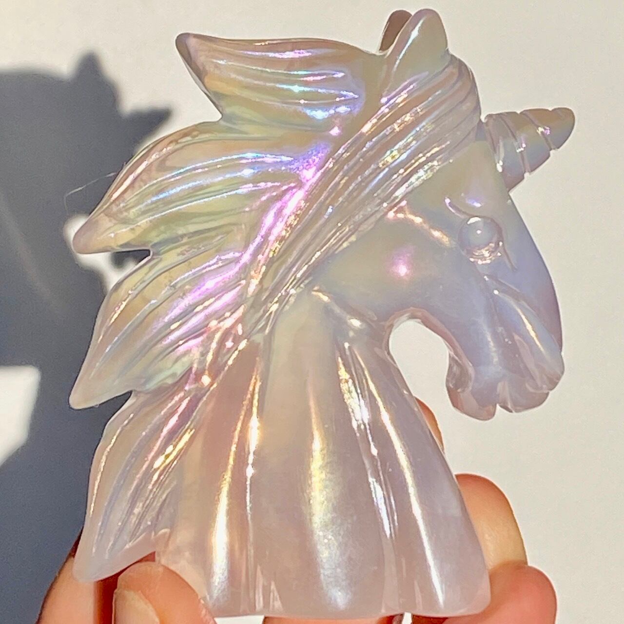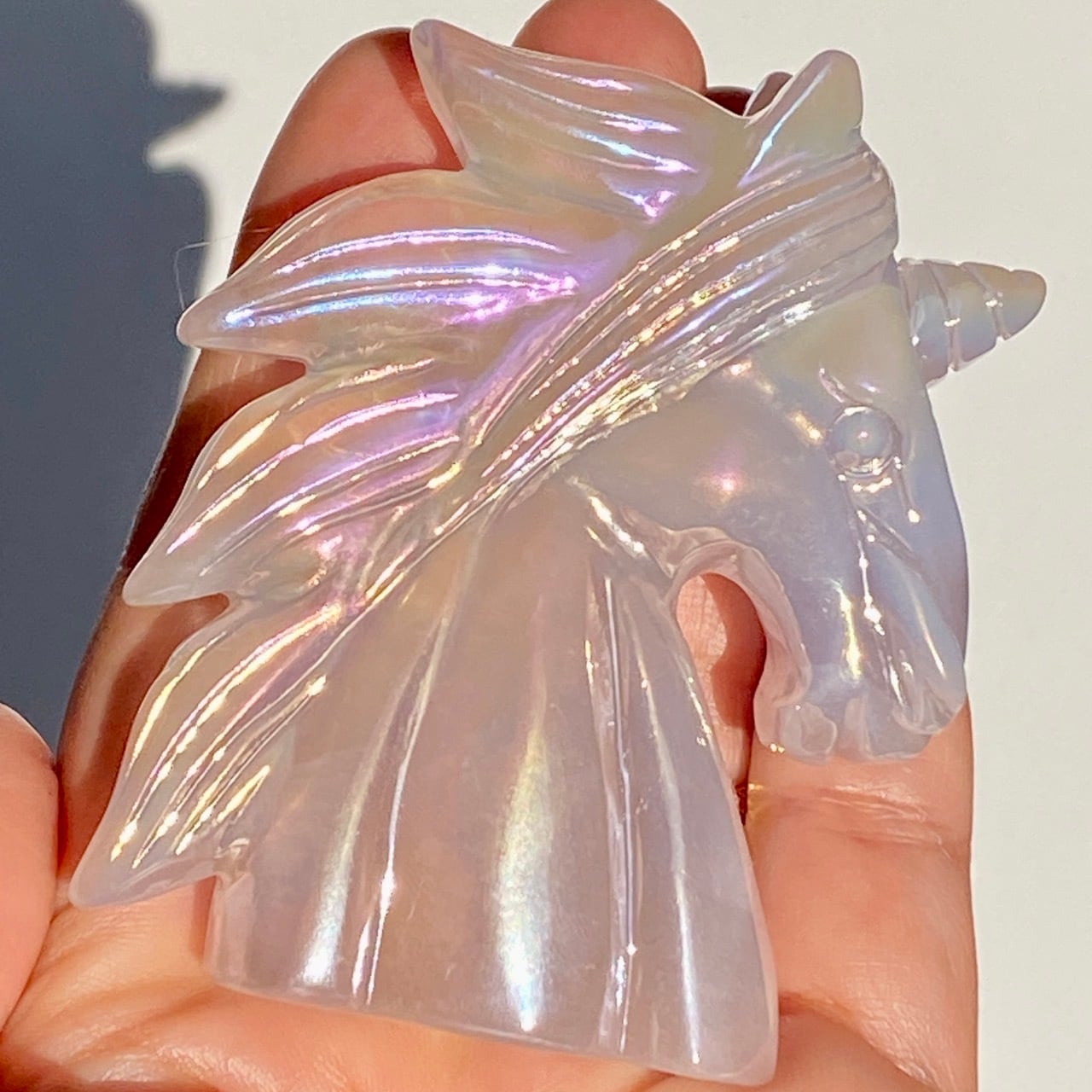 ユニコーンのカービングが施された天然のラベンダーフローライト(蛍石)の表面に酸化チタンを蒸着させる事で柔らかい虹色のオーラを纏っています。