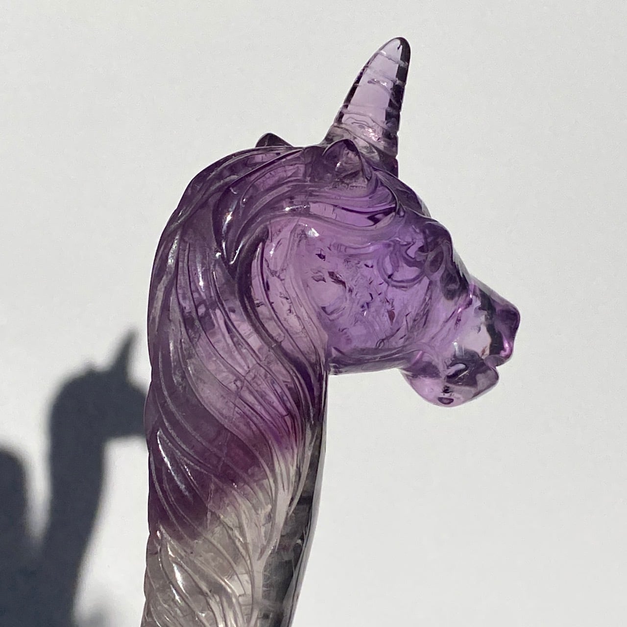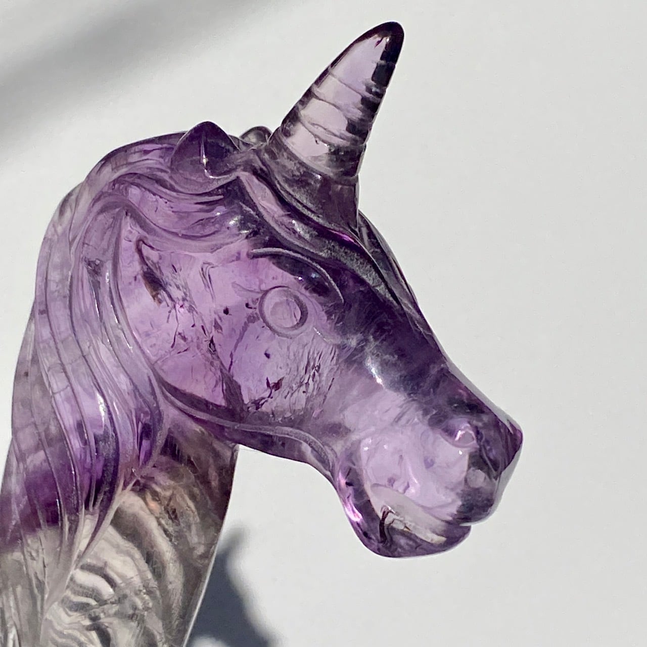 首部分にファントム(バンディングのような帯状の模様も有)が入った、透明感のある良質なアメジストで、スティック部分に虹が浮かびます。ユニコーンの表情にあどけなさがありつつも見る角度によっては獅子のような凛々しさまでもが見て取れます。立髪も美しく、可愛い子です。