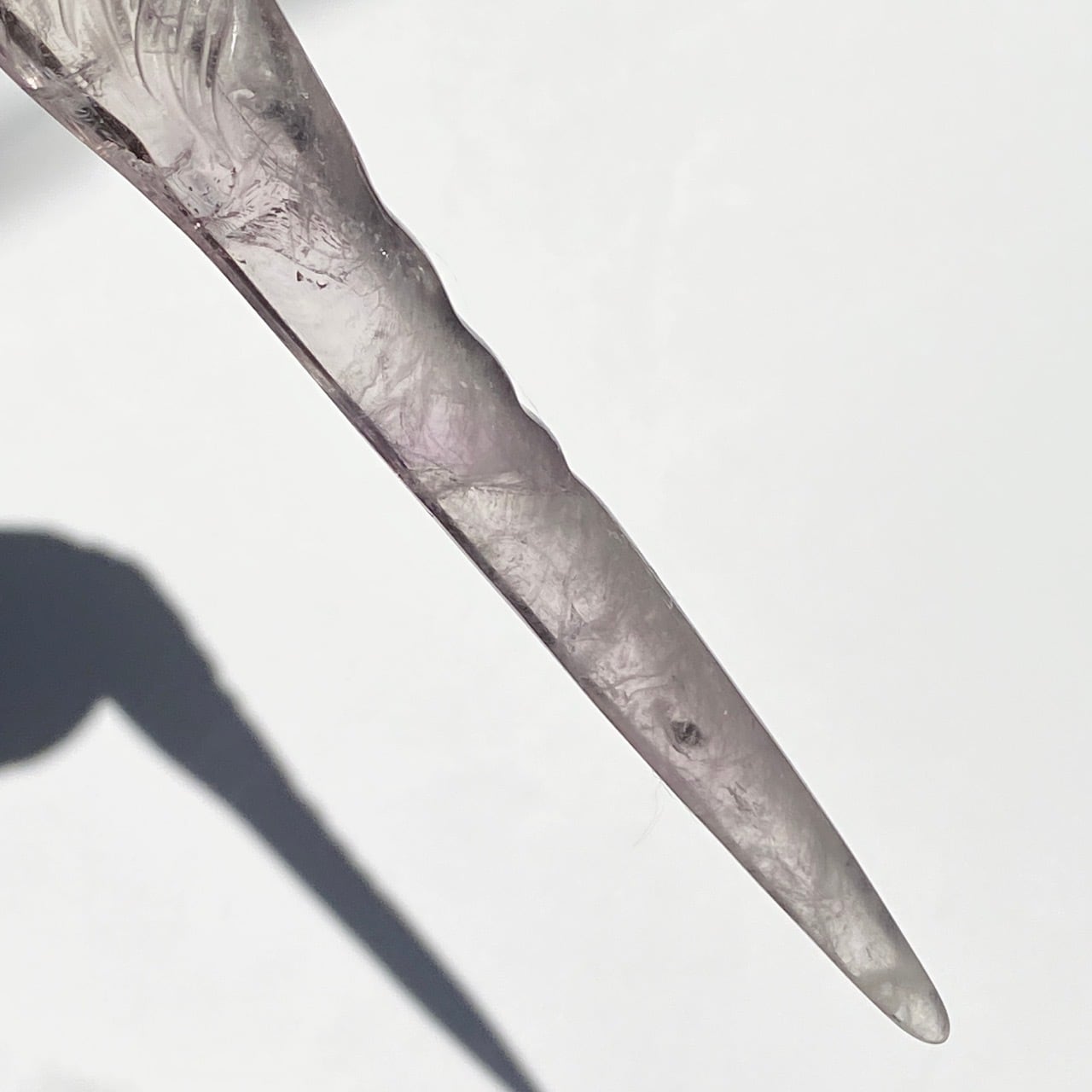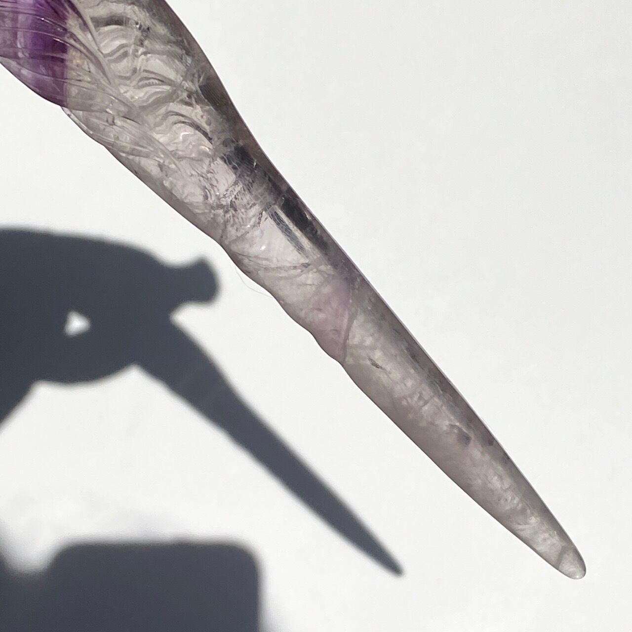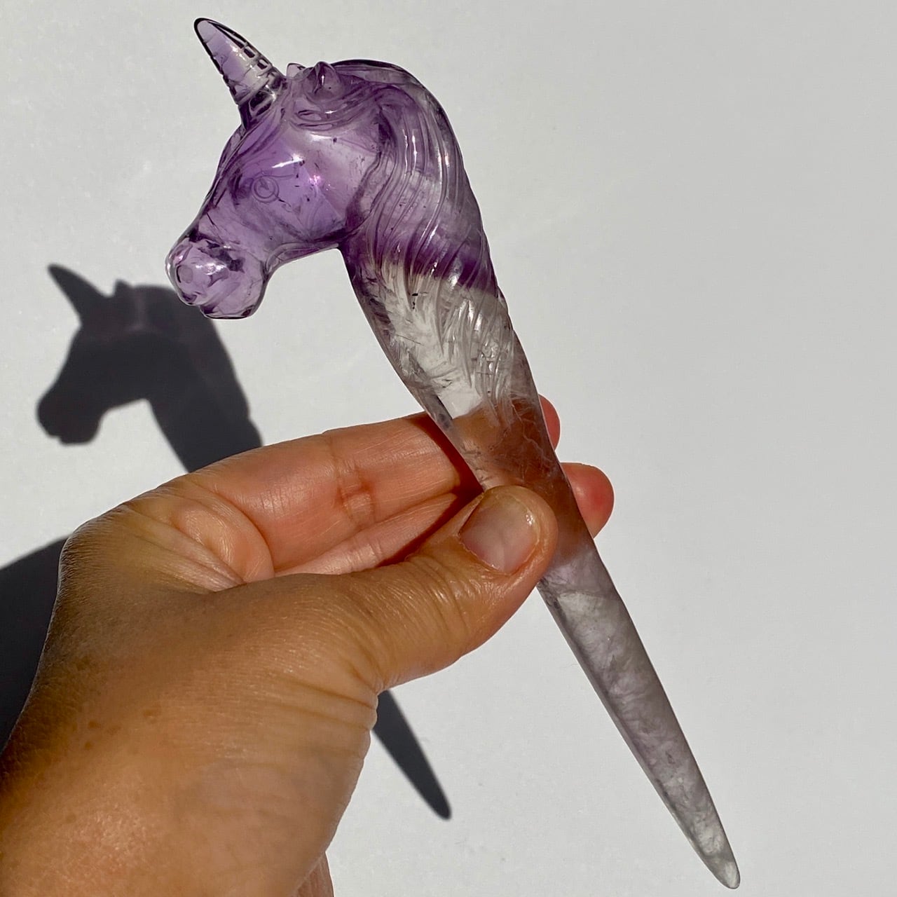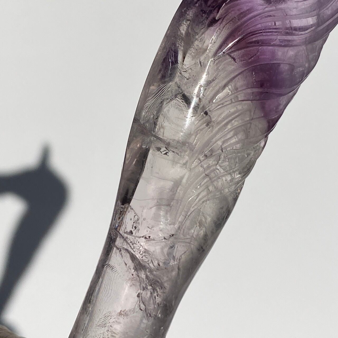 ブラジルで採掘されたファントム入りアメジストの原石を使用して中国で手彫りされたユニコーンのワンドです。