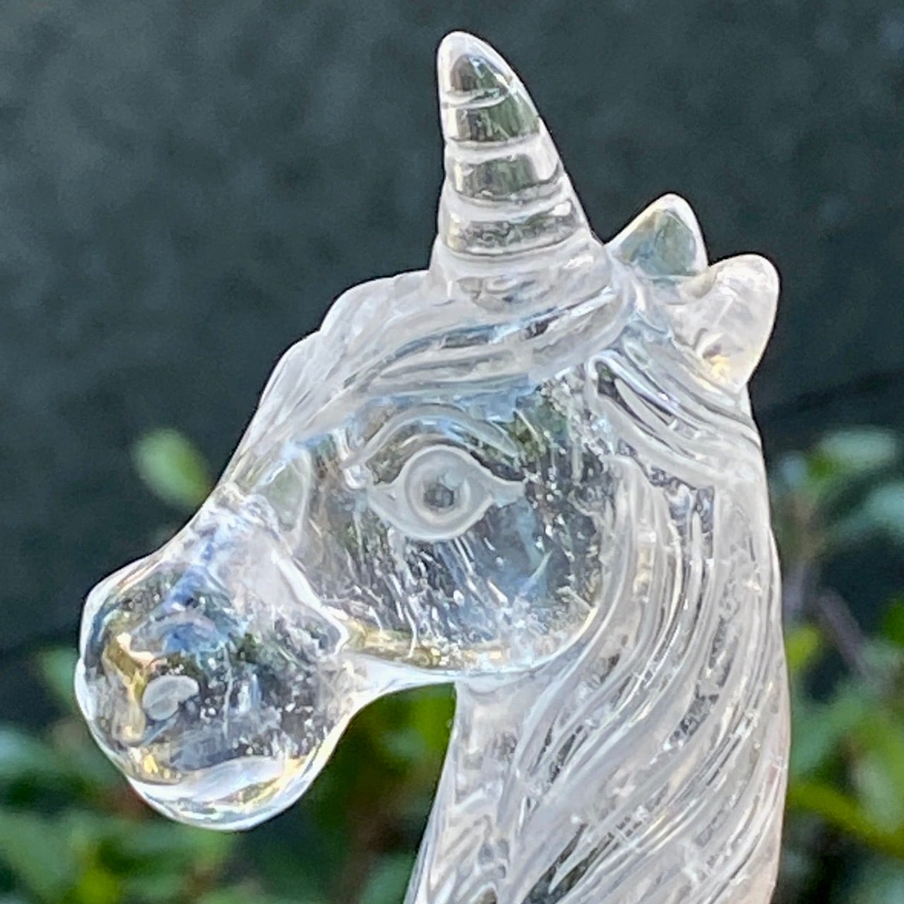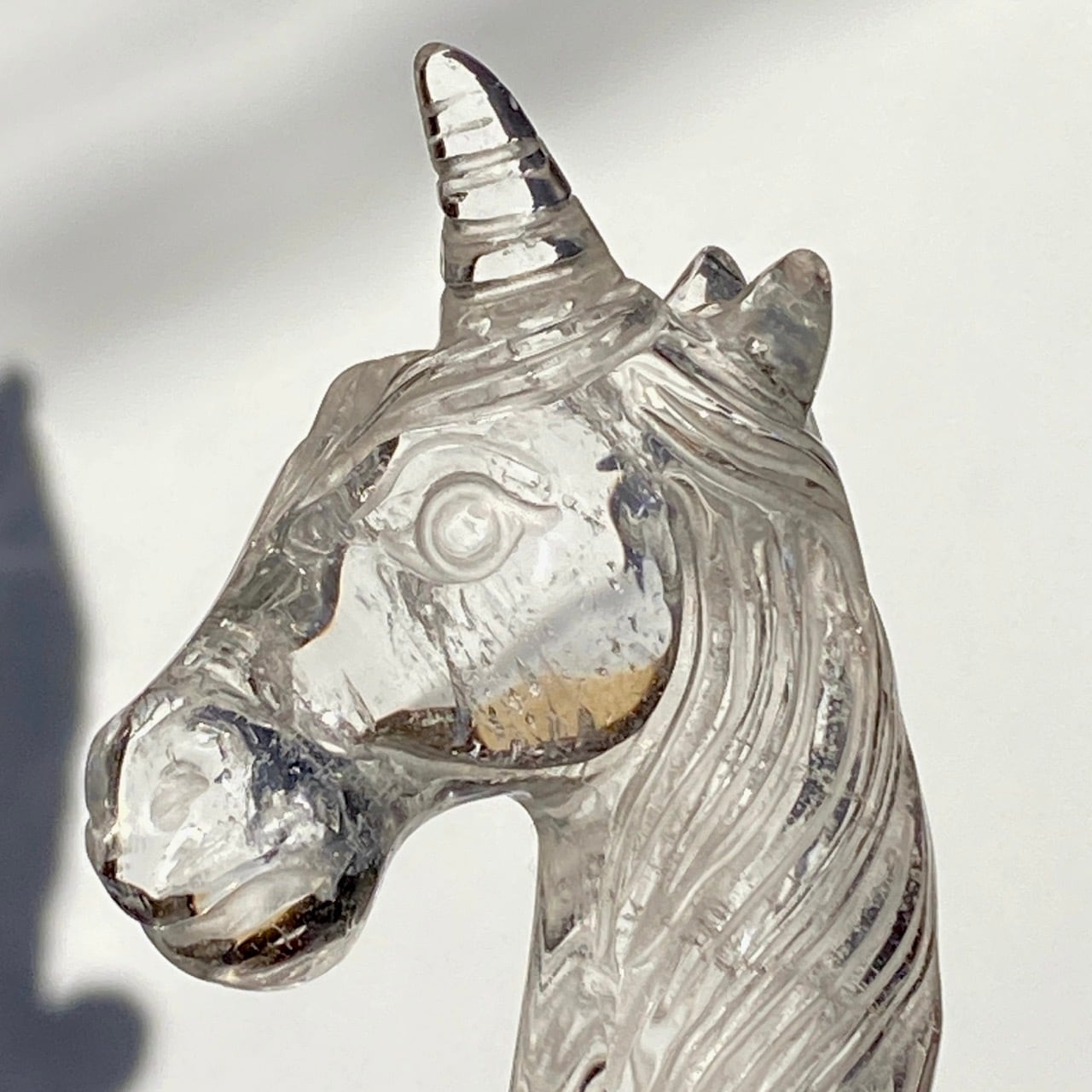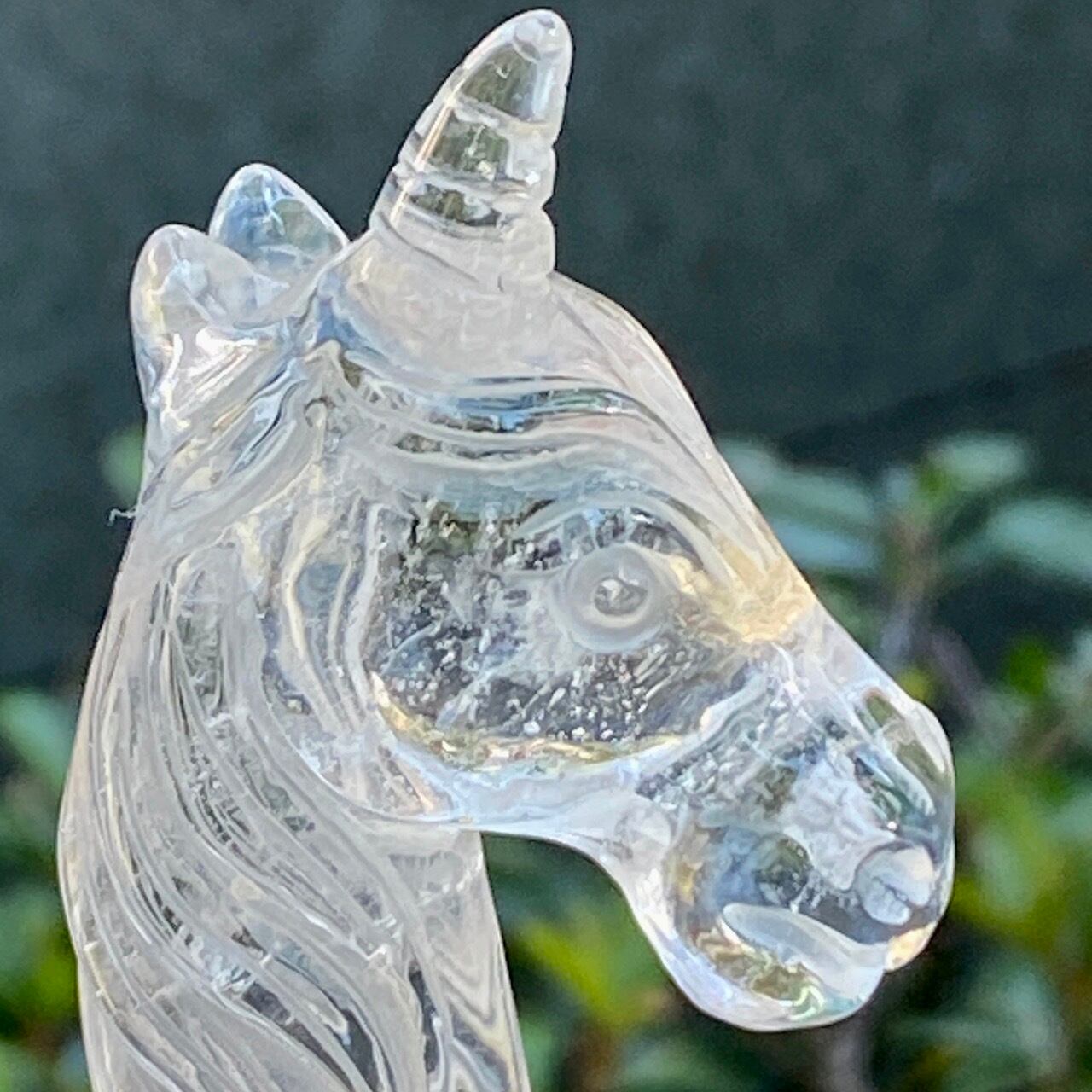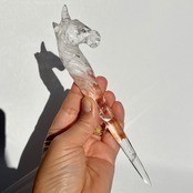 透明度の高いクリアクォーツでできた、divine feminineもしくは少年のようなあどけなさを感じさせる、流れるような長い立髪が美しい子です。クリアクォーツのワンドへのこだわりが強い店主が製作をお願いして現実化しました。画像で見ると陰影やクォーツ内部の模様がコントラストで強調されていますが、とてもラブリーな子です。スティック部分に虹も浮かびます♡