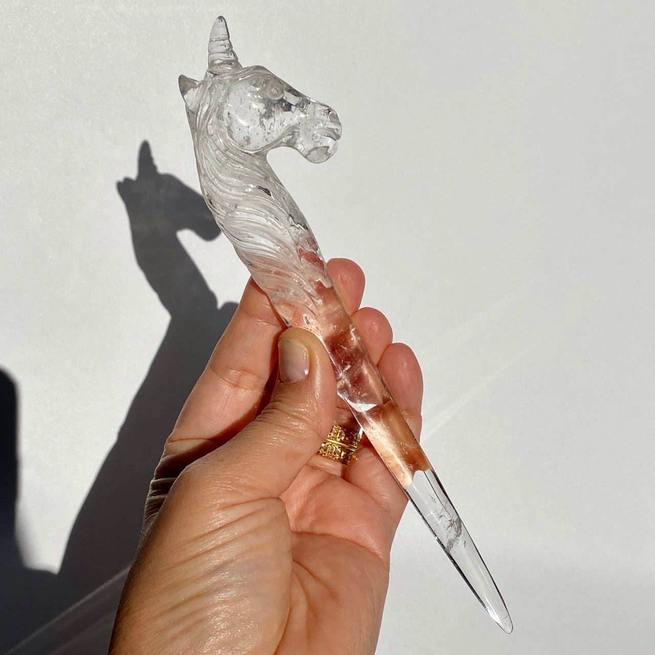 ブラジルで採掘されたクリアクォーツの原石を中国で手彫りしてユニコーンワンドに仕立てたものです。