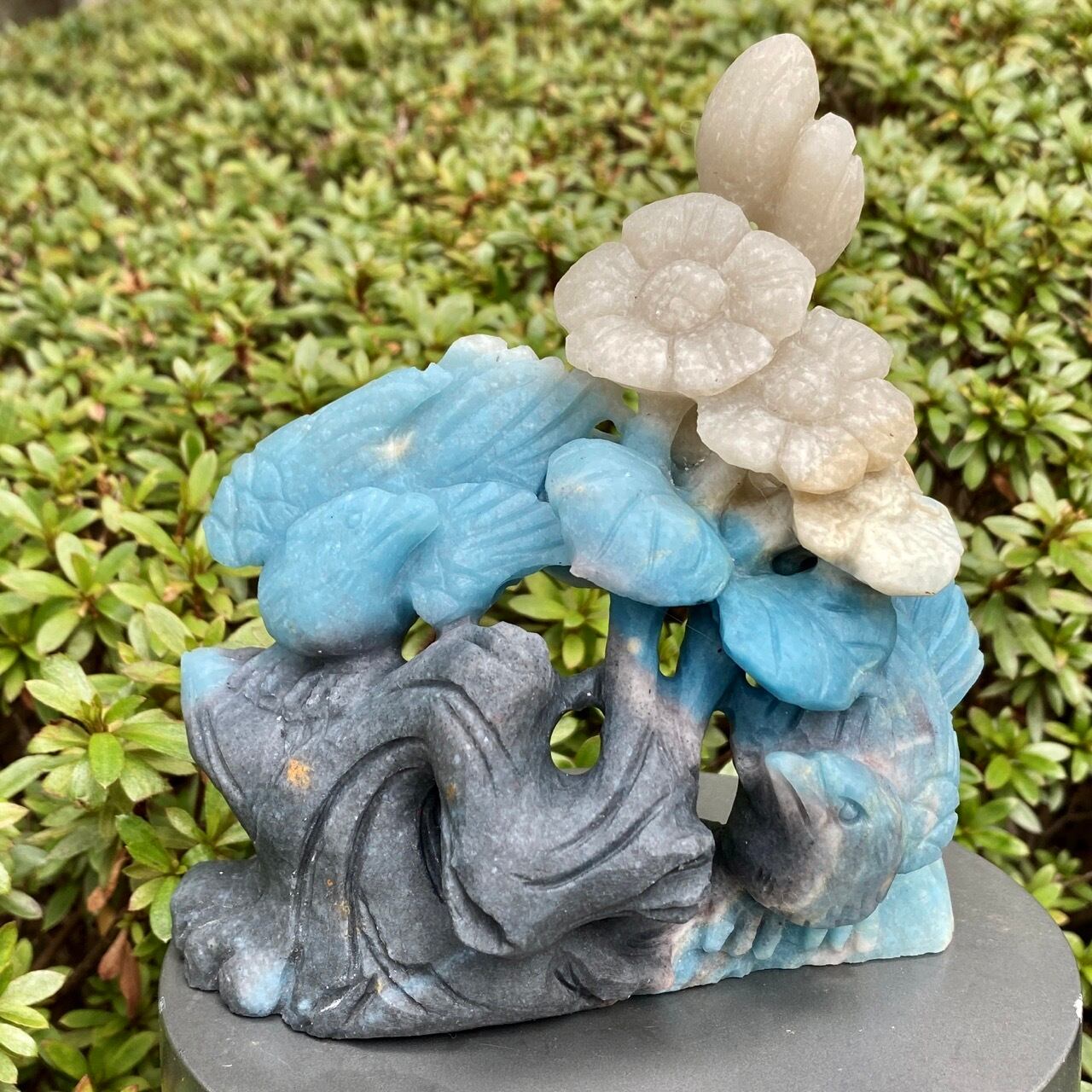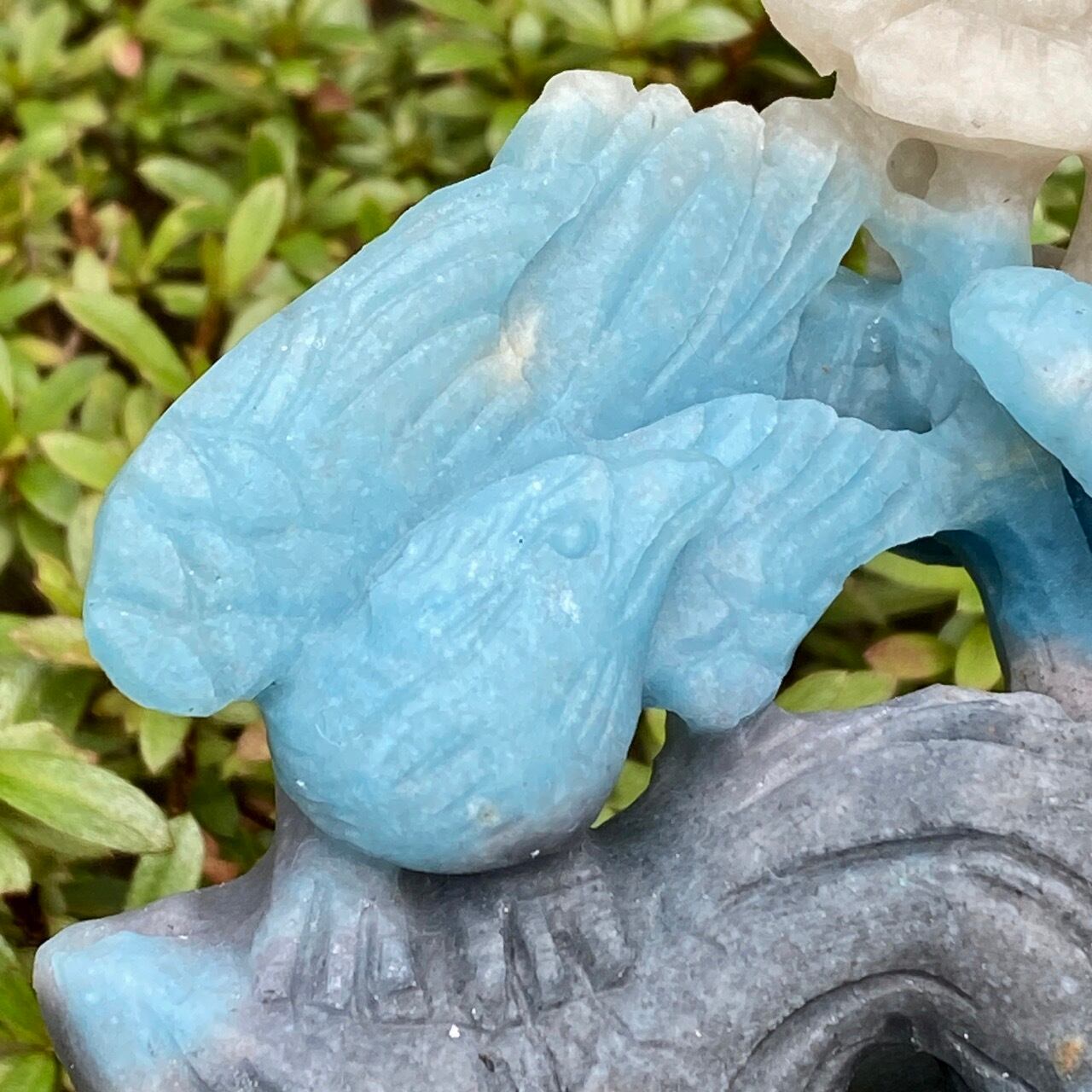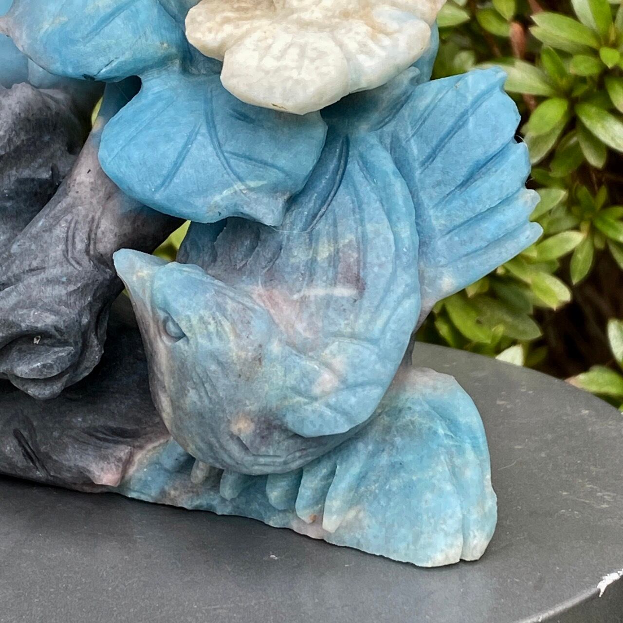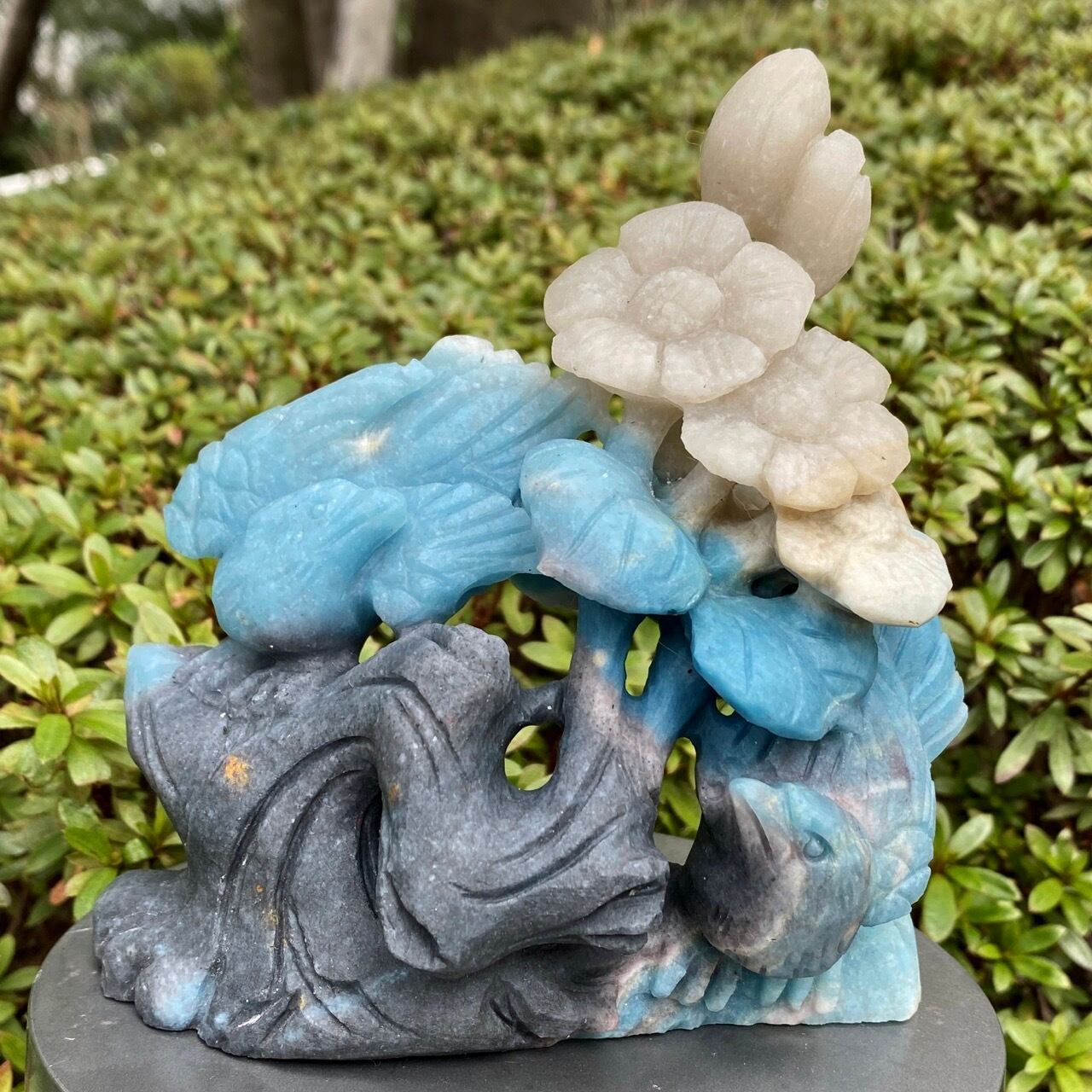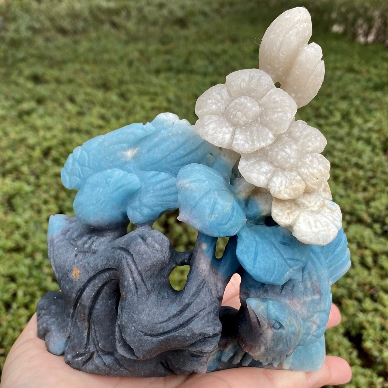 ブルーの濃淡とグレーがかったアイボリーの美しいカラーグラデーションを纏ったトロレアイトの石に、花々が咲く木にとまった2羽の鳥が手彫りされた置物になります。