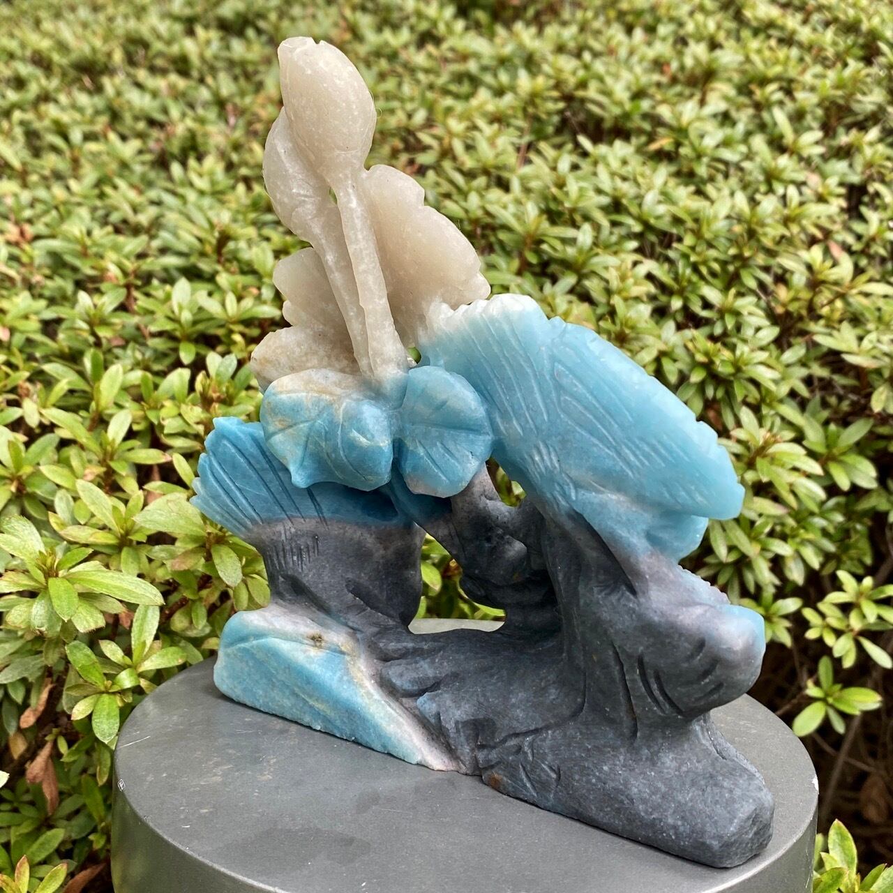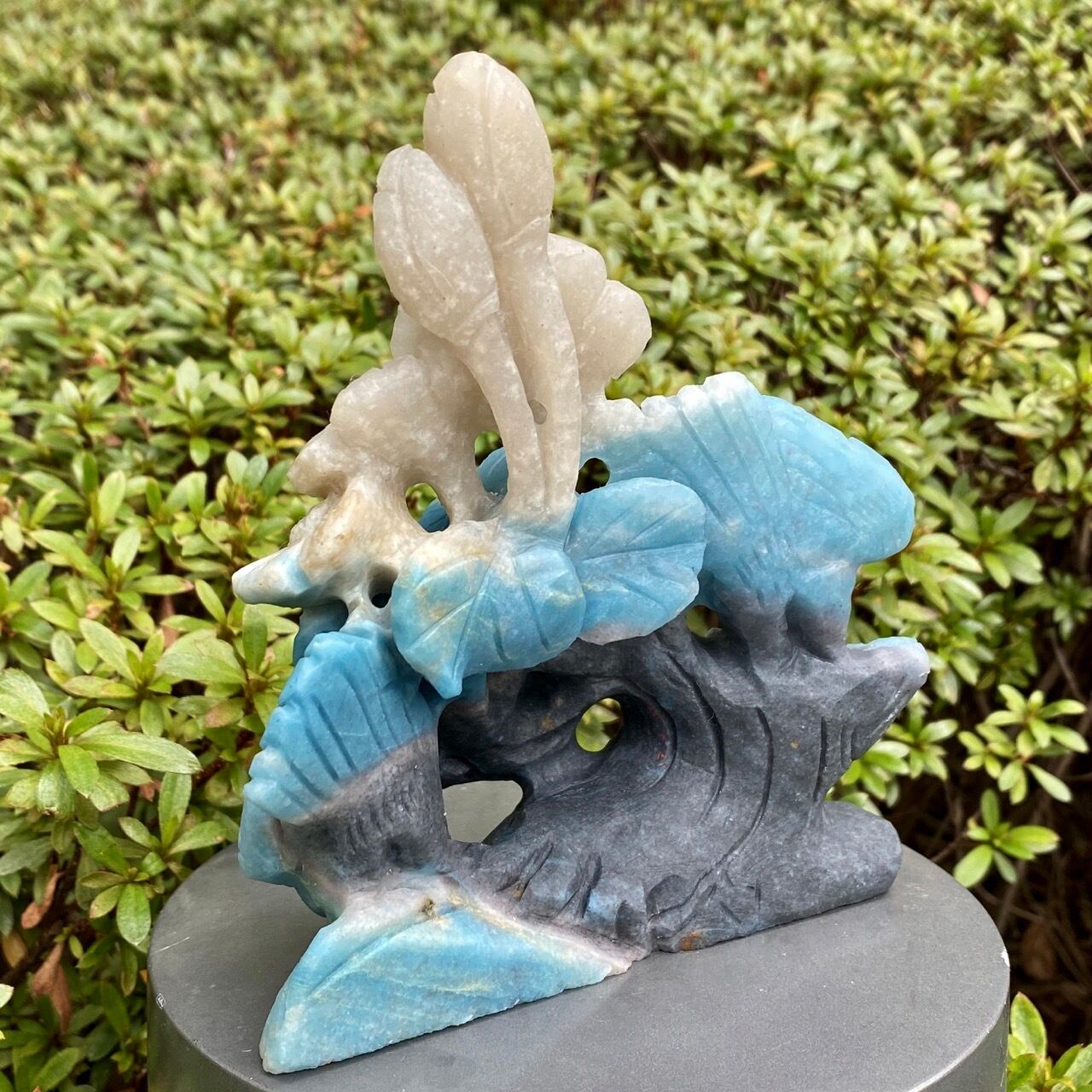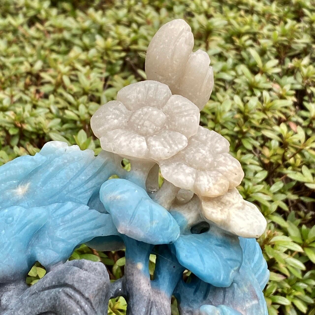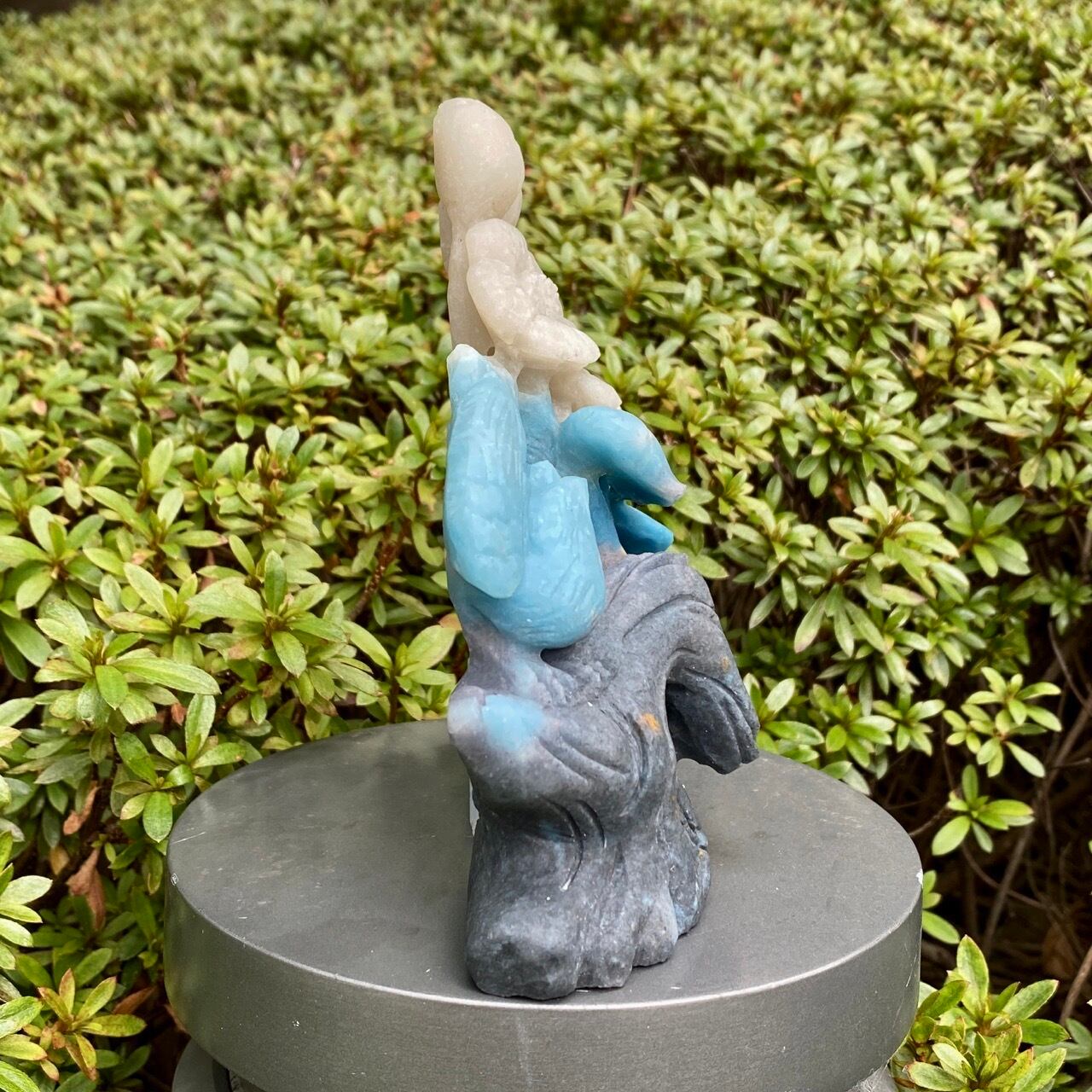 ブルーの濃淡とグレーがかったアイボリーの美しいカラーグラデーションを纏ったトロレアイトの石に、花々が咲く木にとまった2羽の鳥が手彫りされた置物になります。
