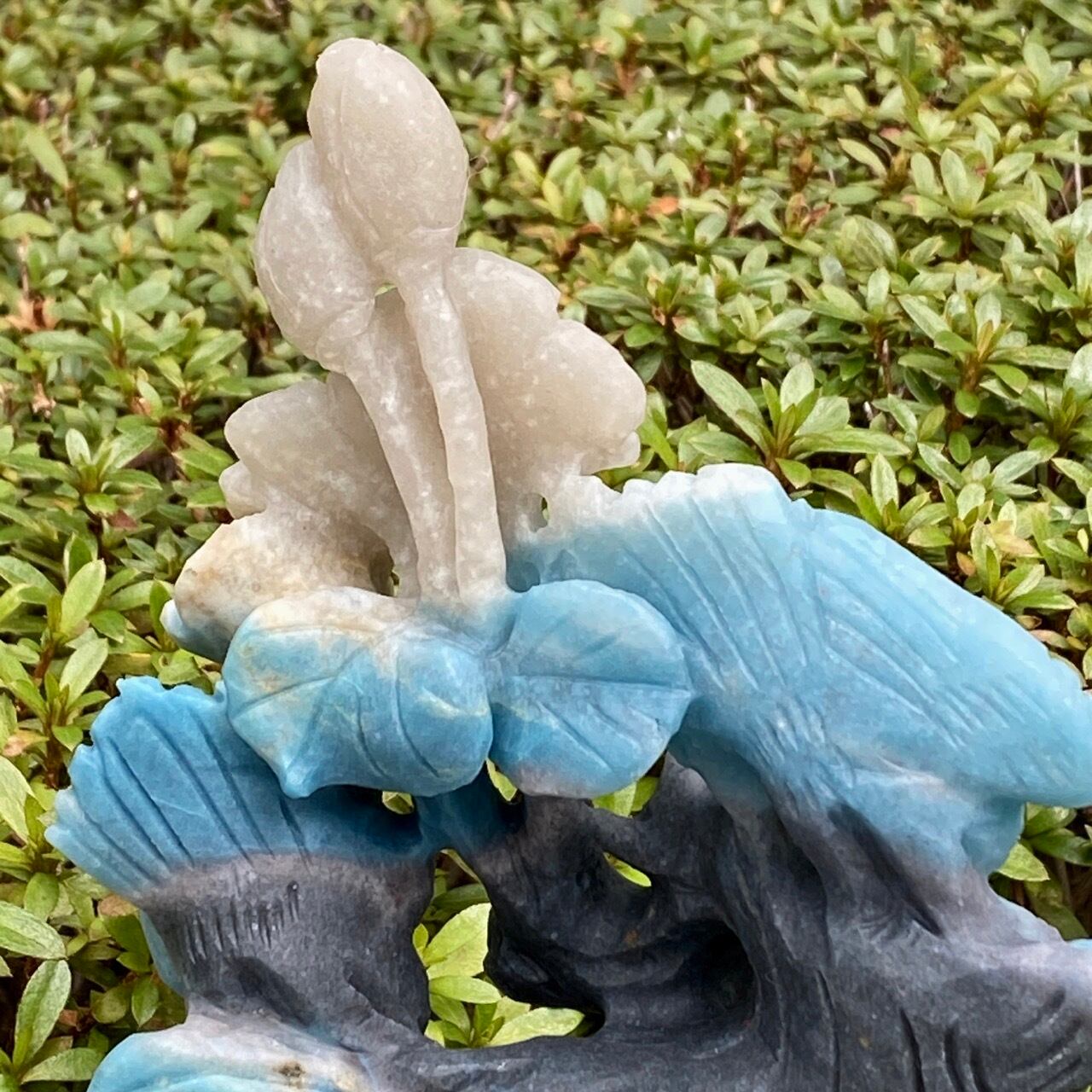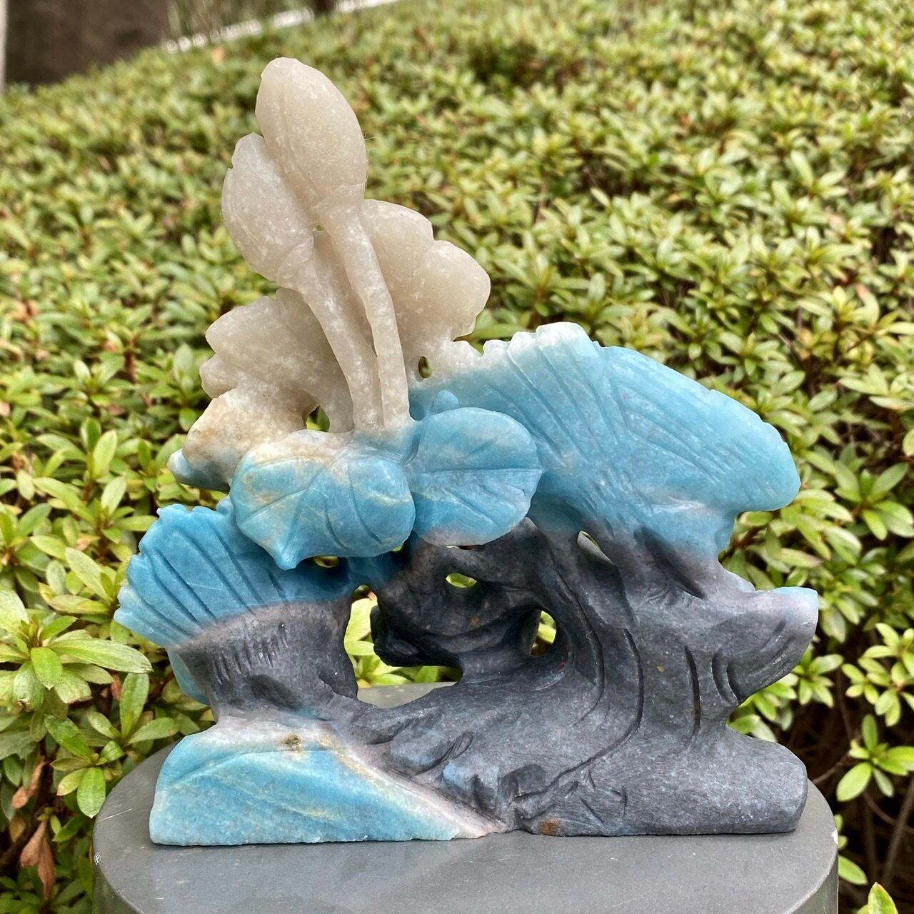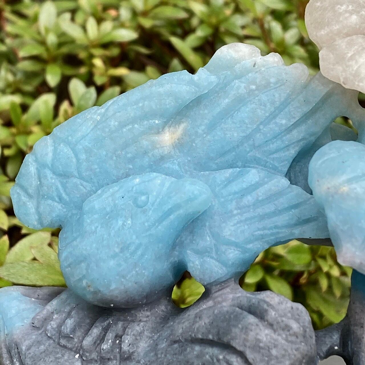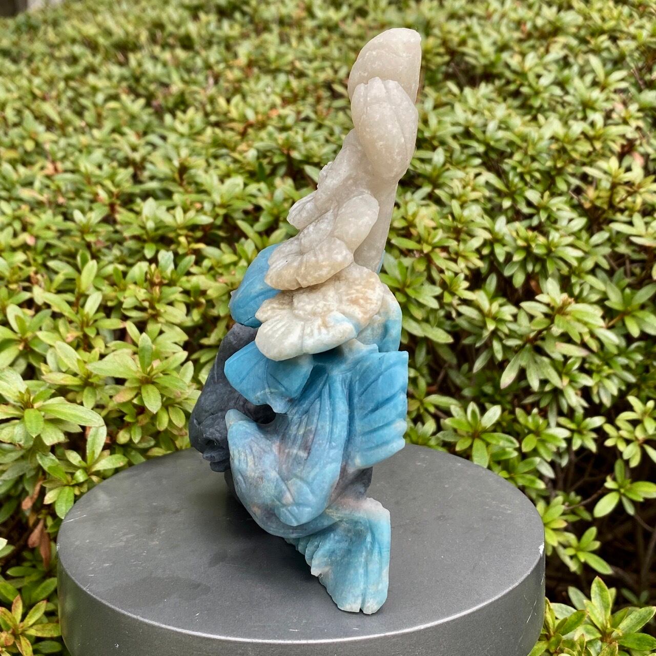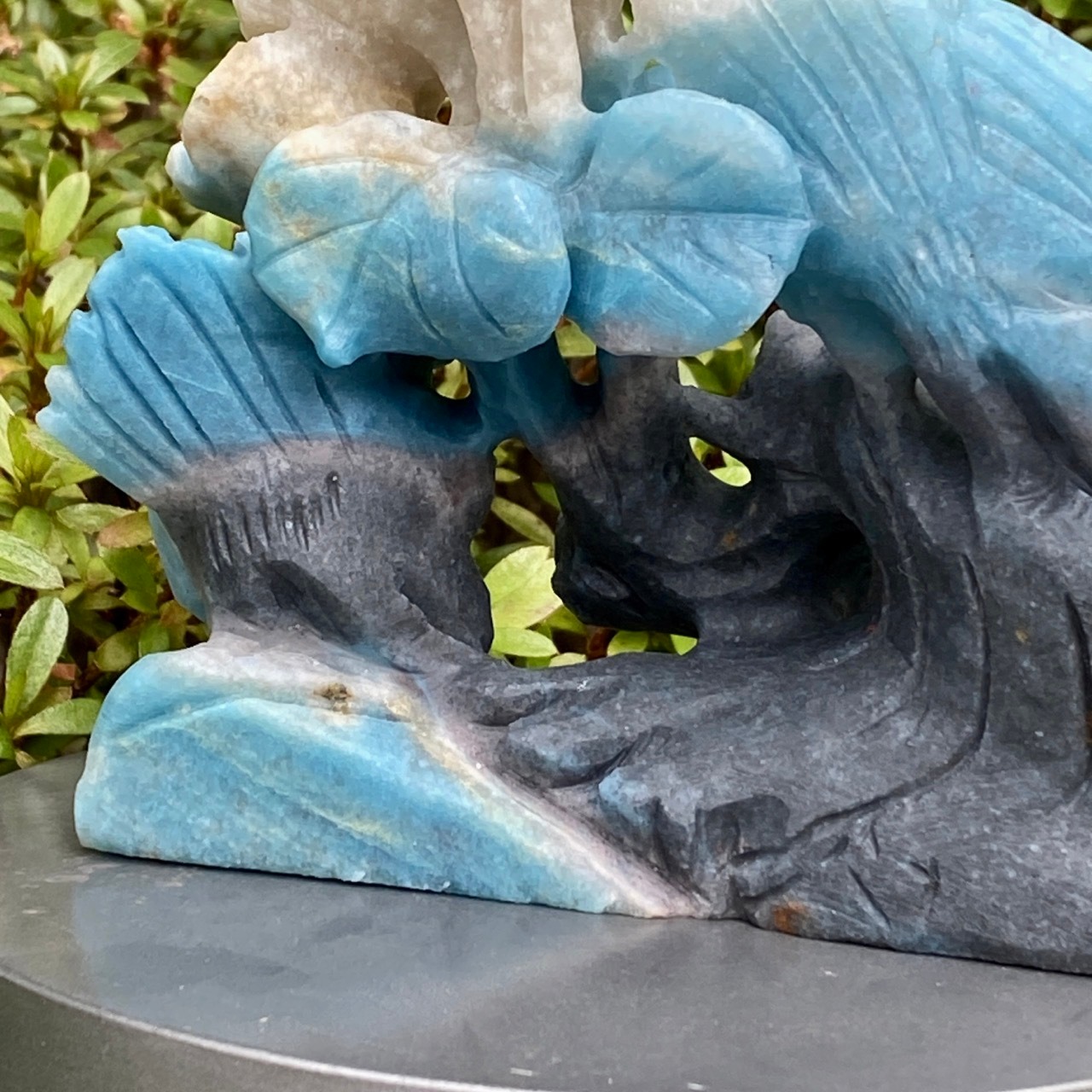 ブルーの濃淡とグレーがかったアイボリーの美しいカラーグラデーションを纏ったトロレアイトの石に、花々が咲く木にとまった2羽の鳥が手彫りされた置物になります。