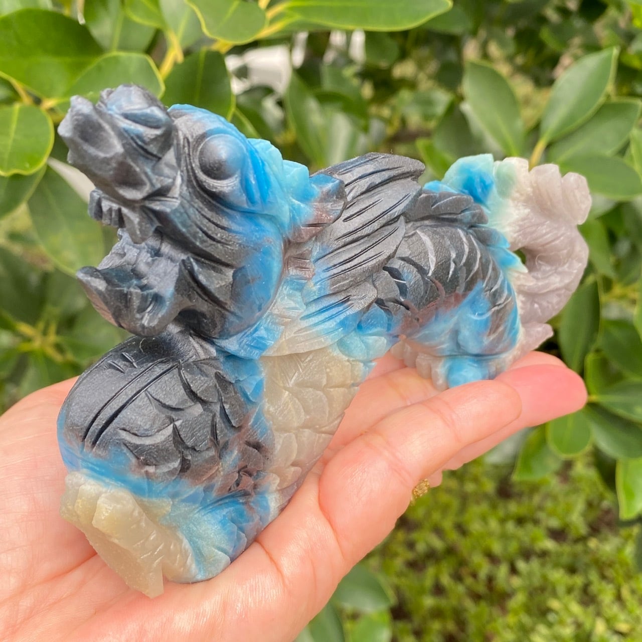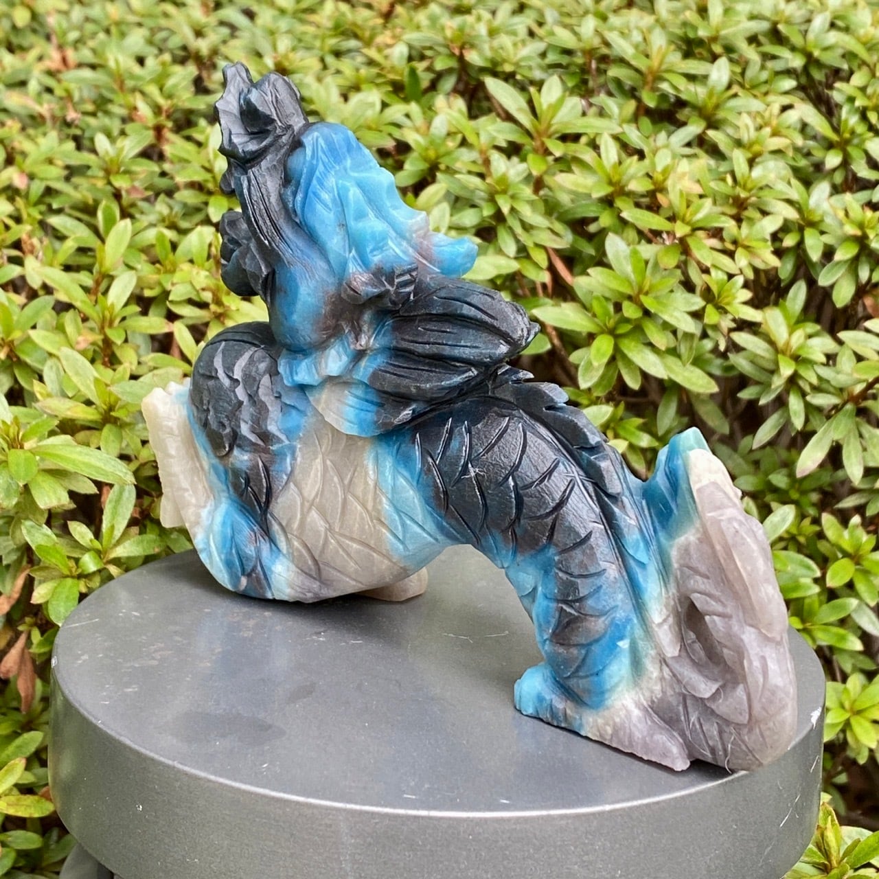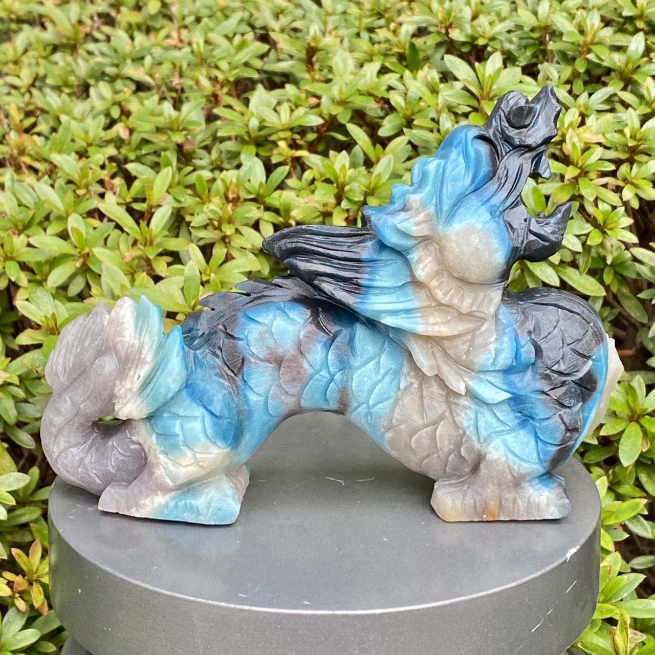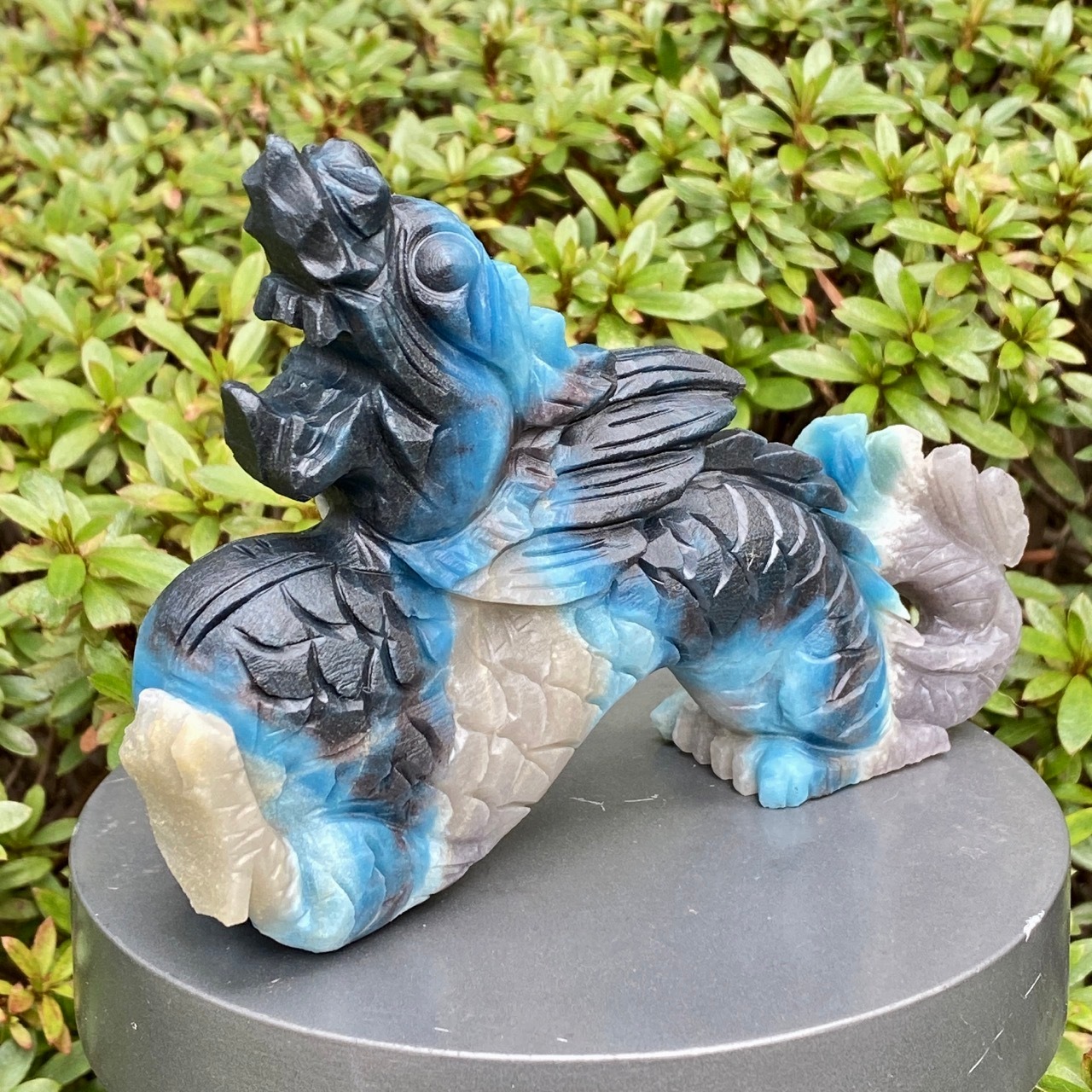 ブルーの濃淡3色とグレー、そして部分的にイエローのゴージャスな縞を纏った青龍です。