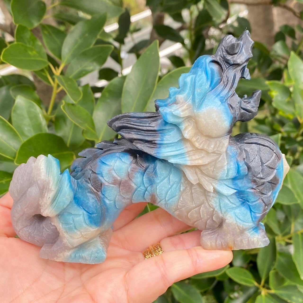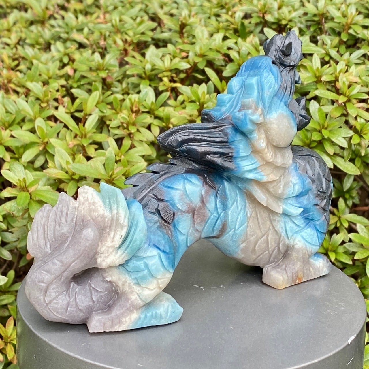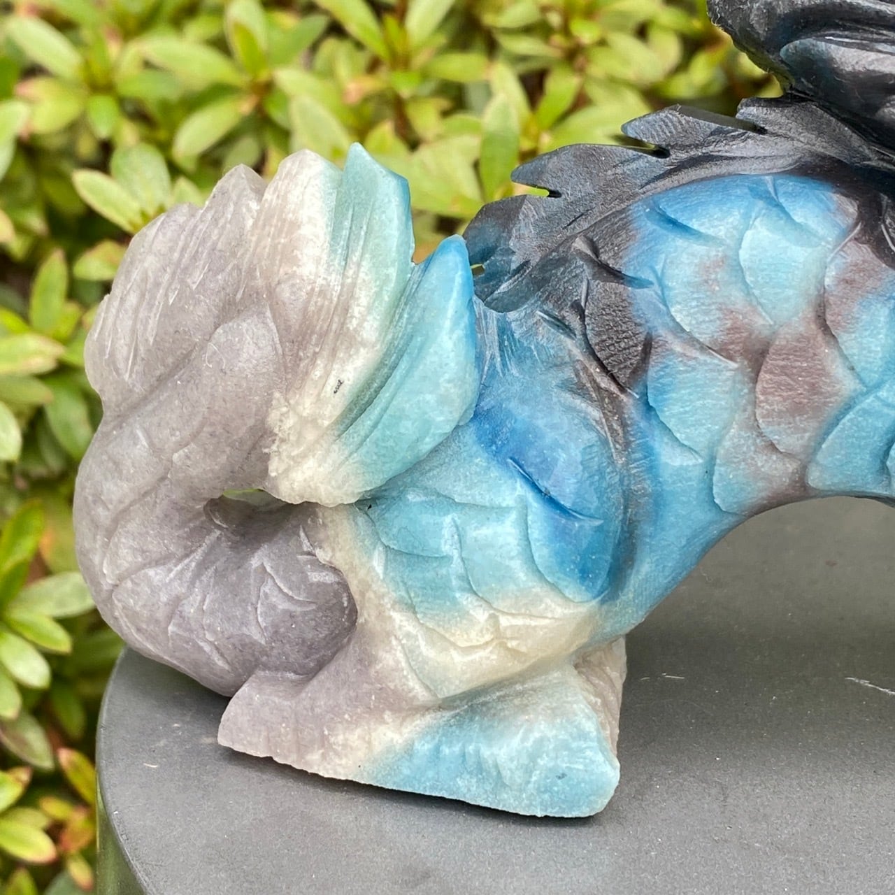 ブルーの濃淡3色とグレー、そして部分的にイエローのゴージャスな縞を纏った青龍です。