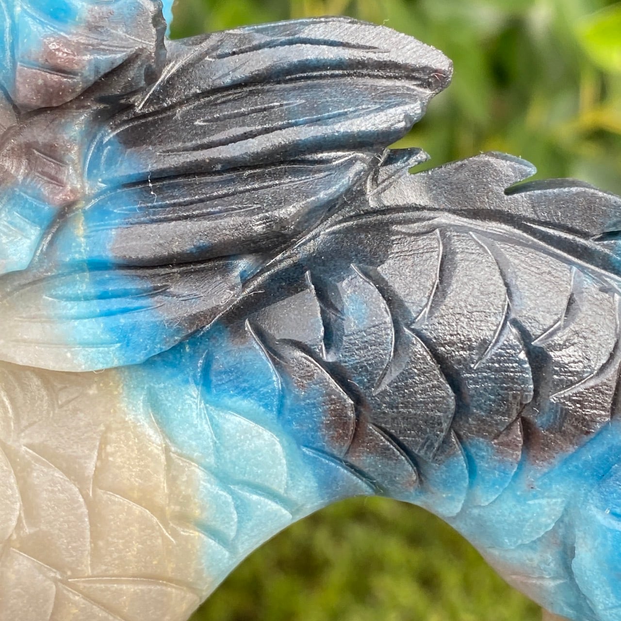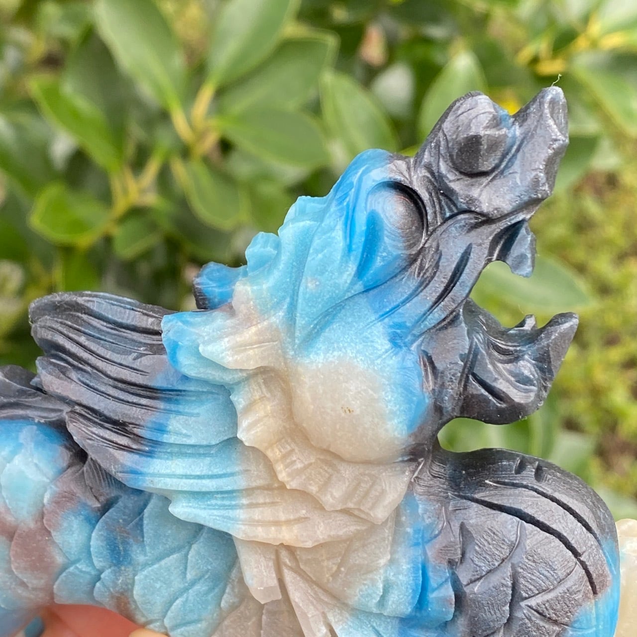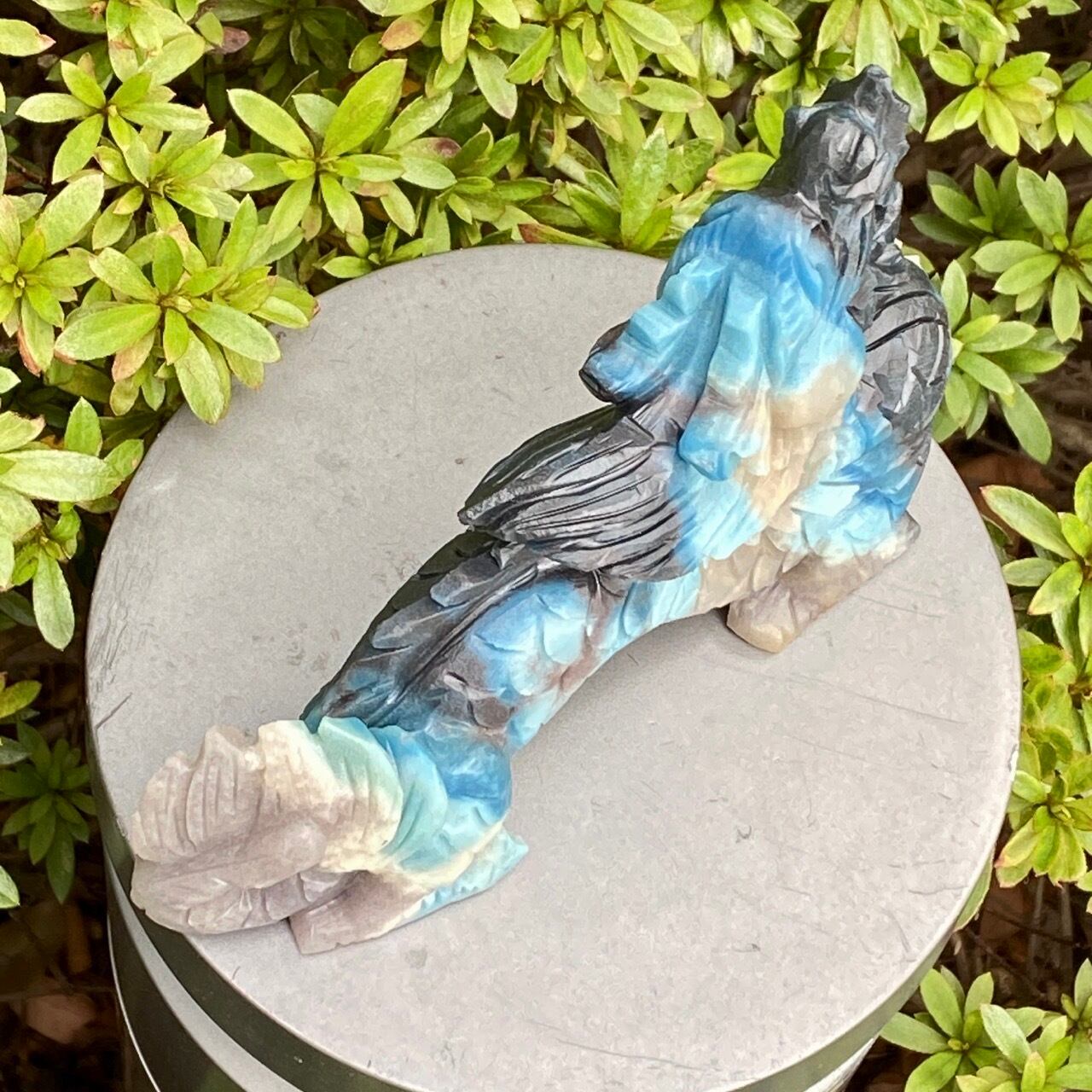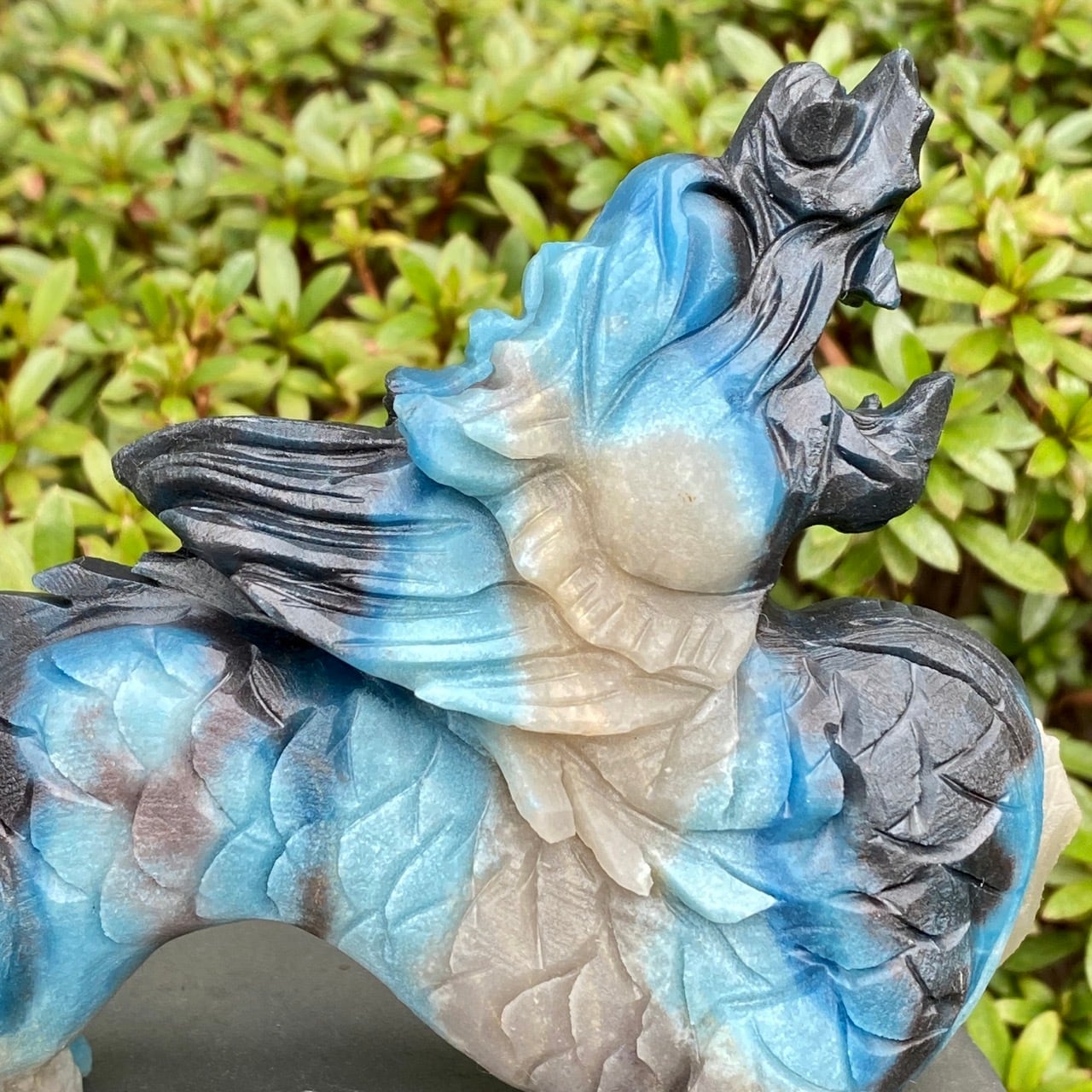 ブルーの濃淡3色とグレー、そして部分的にイエローのゴージャスな縞を纏った青龍です。