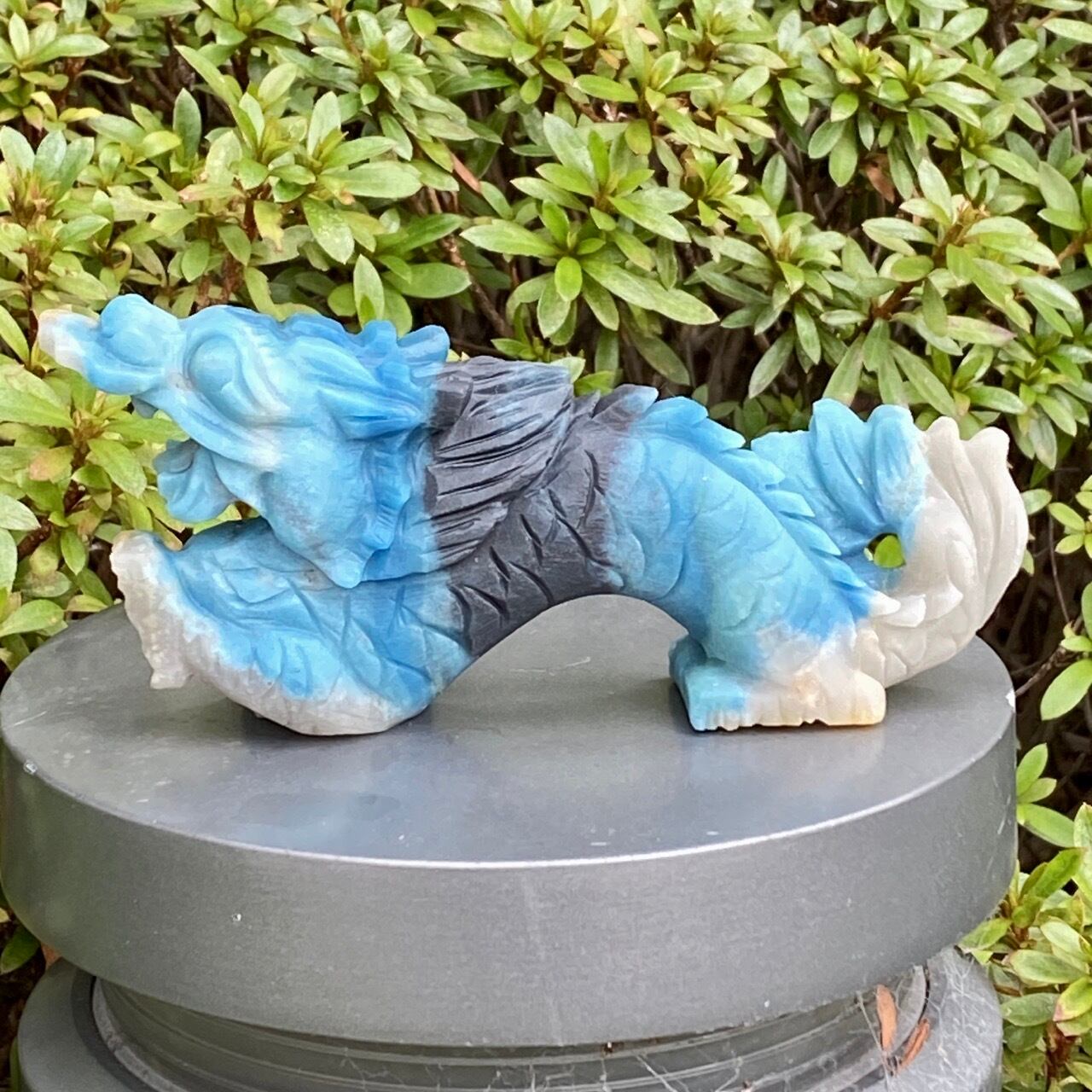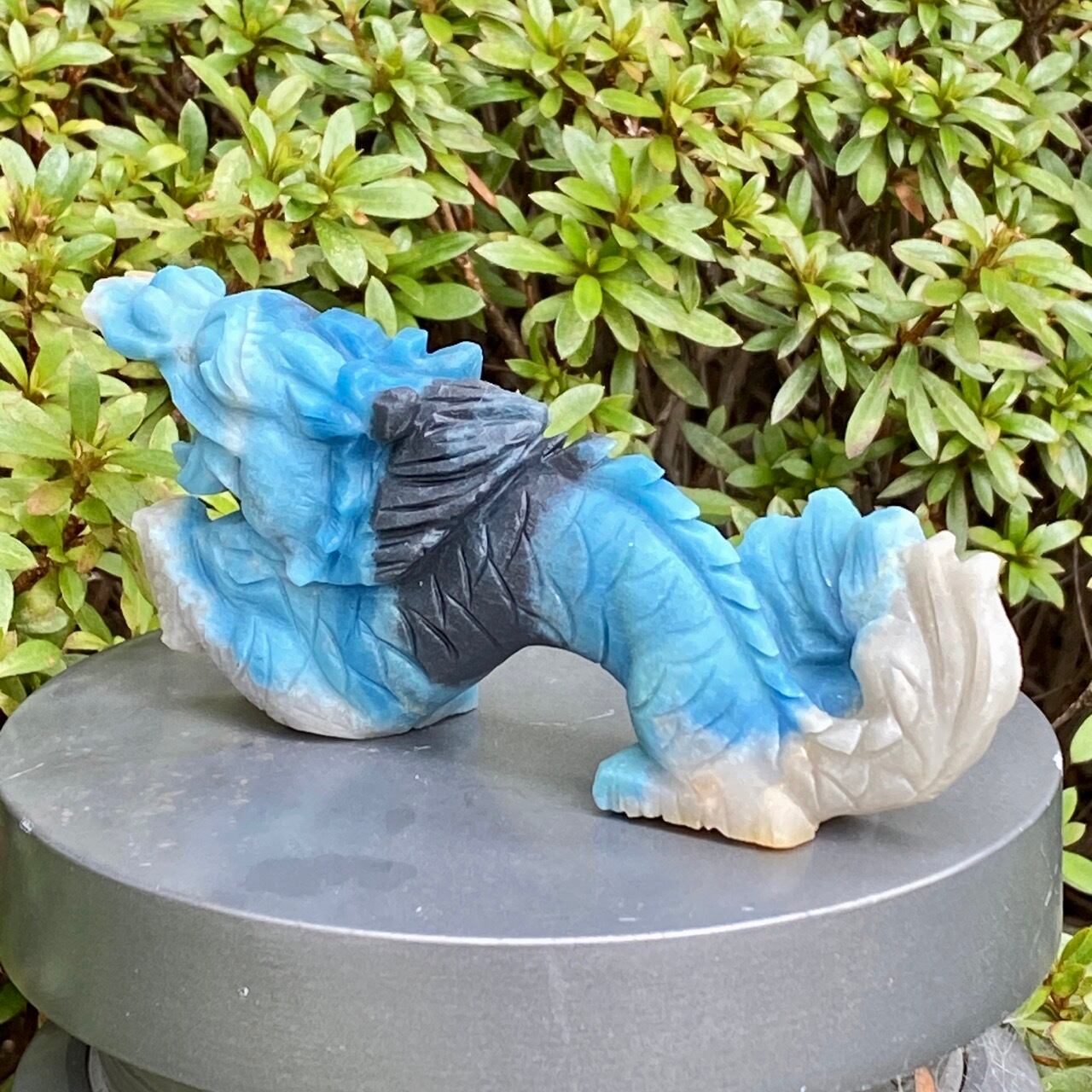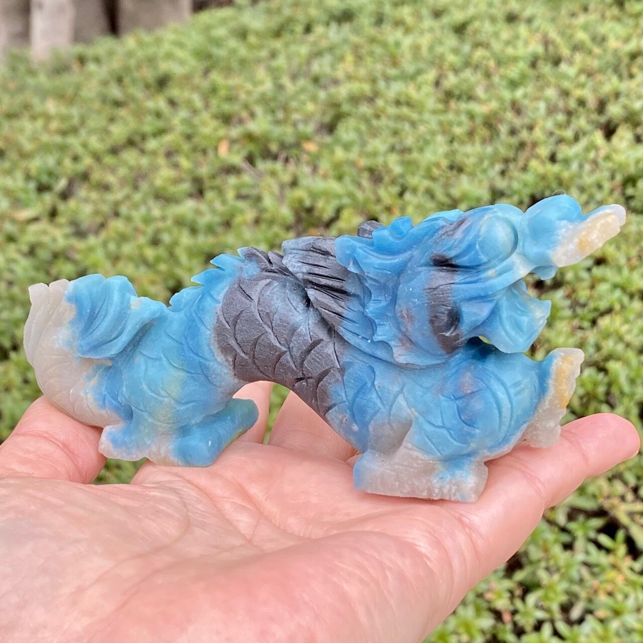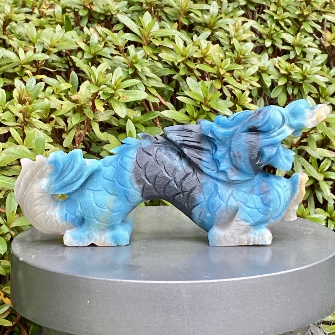 ブルーの濃淡3色とグレーの縞を纏った青龍です。