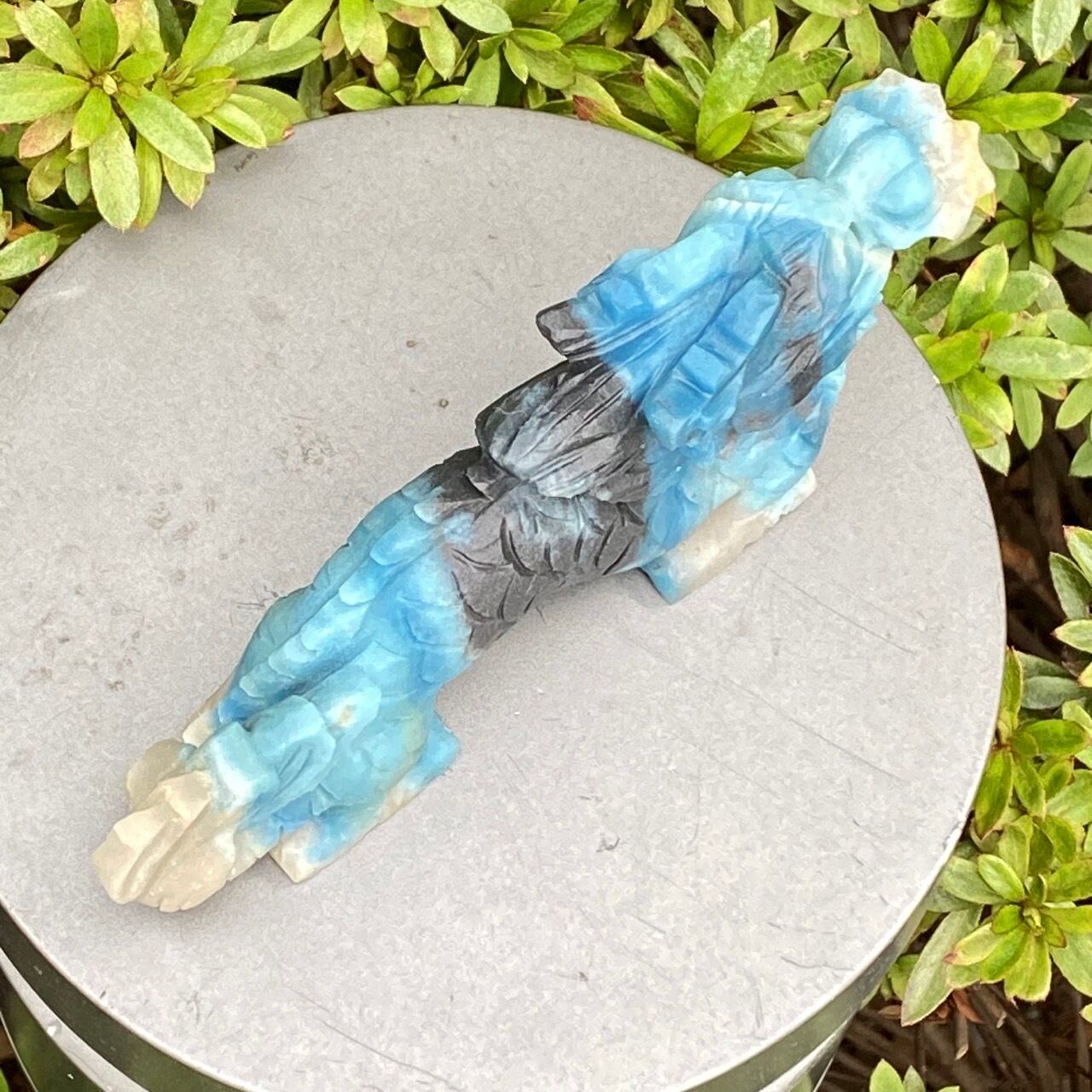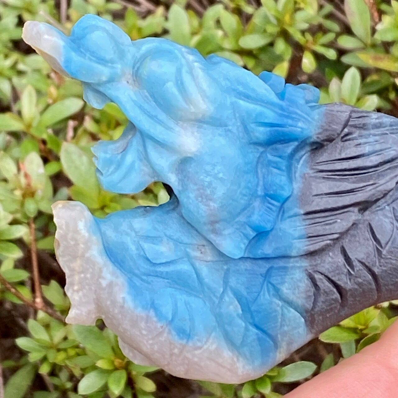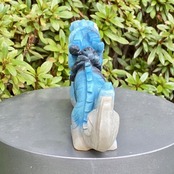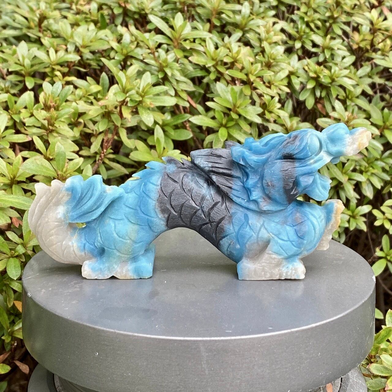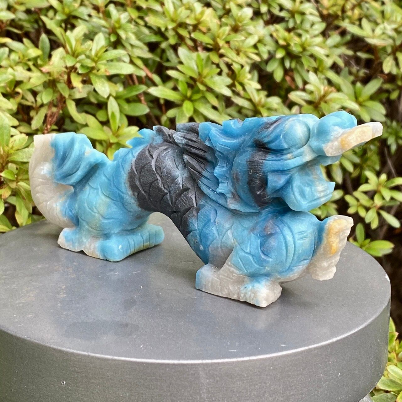ブルーの濃淡3色とグレーの縞を纏った青龍です。