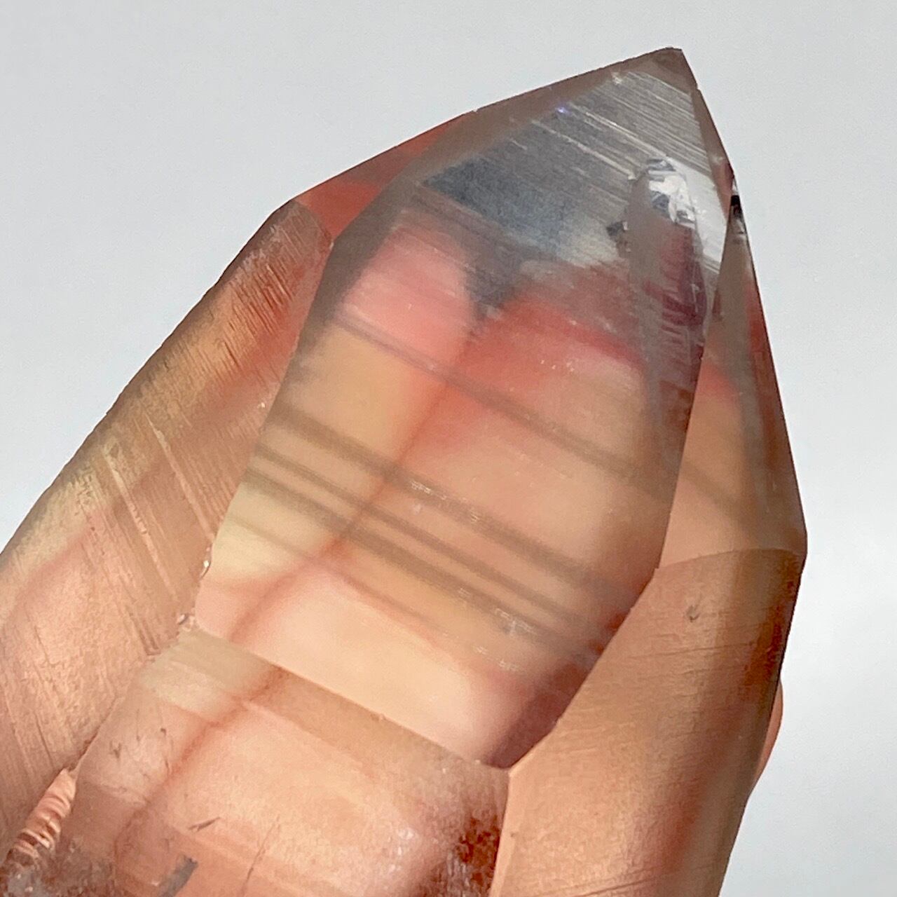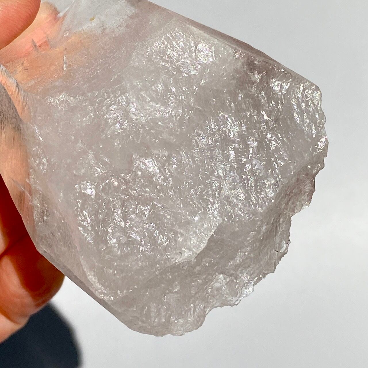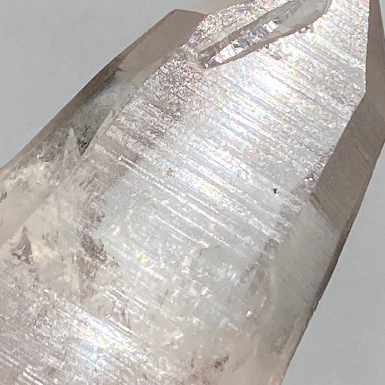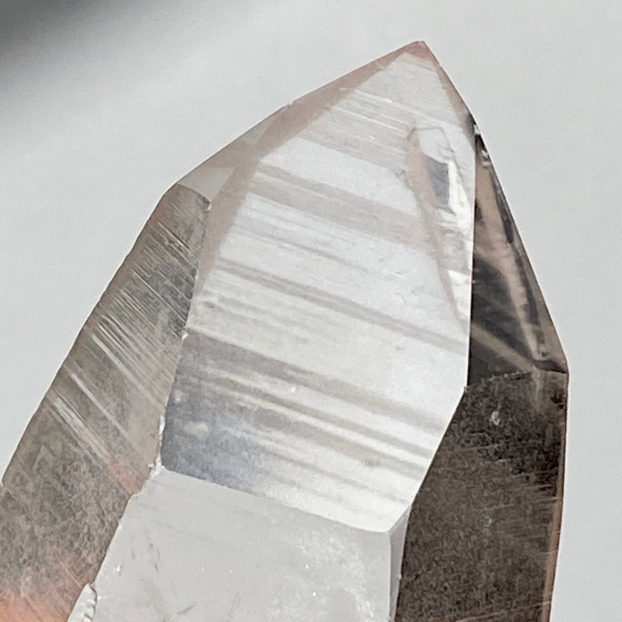 霜もしくは天使の羽の様な見た目の下部とそれ以外の高透明度のセクションのコントラストが魅力的な子です。磨かれた一番大きなファセットから見られる、手でなぞると段差を感じられる反対側の柱面のくっきりとしたレムリアンリッジ(横に入った条線)と、小さなポイントが付いていた箇所(剥離痕)も注目箇所です。