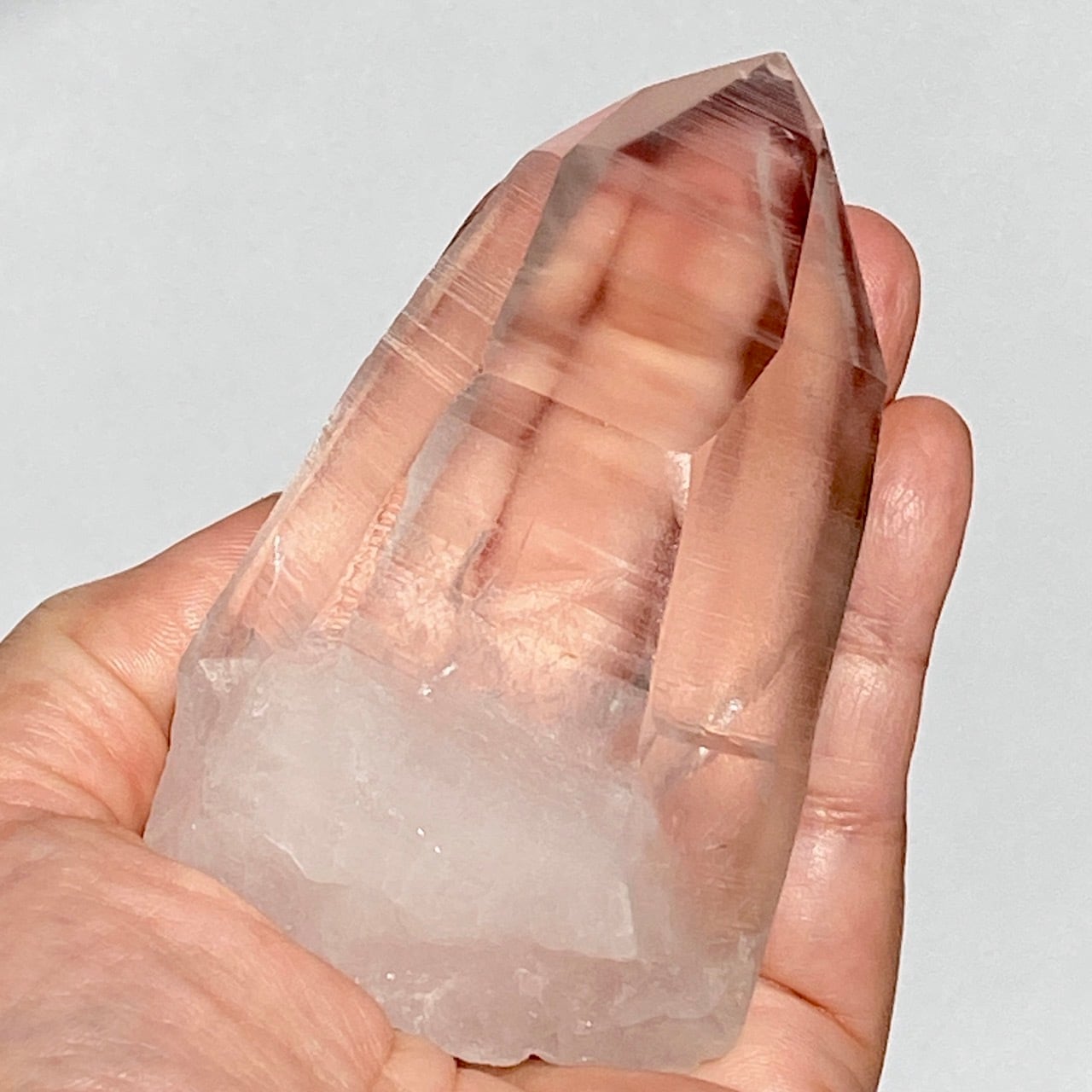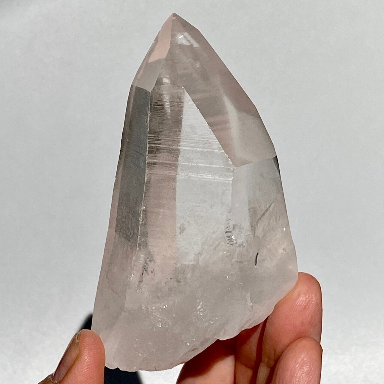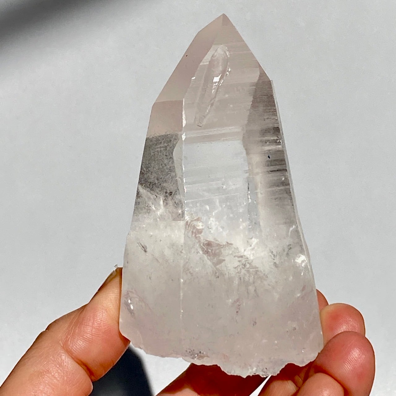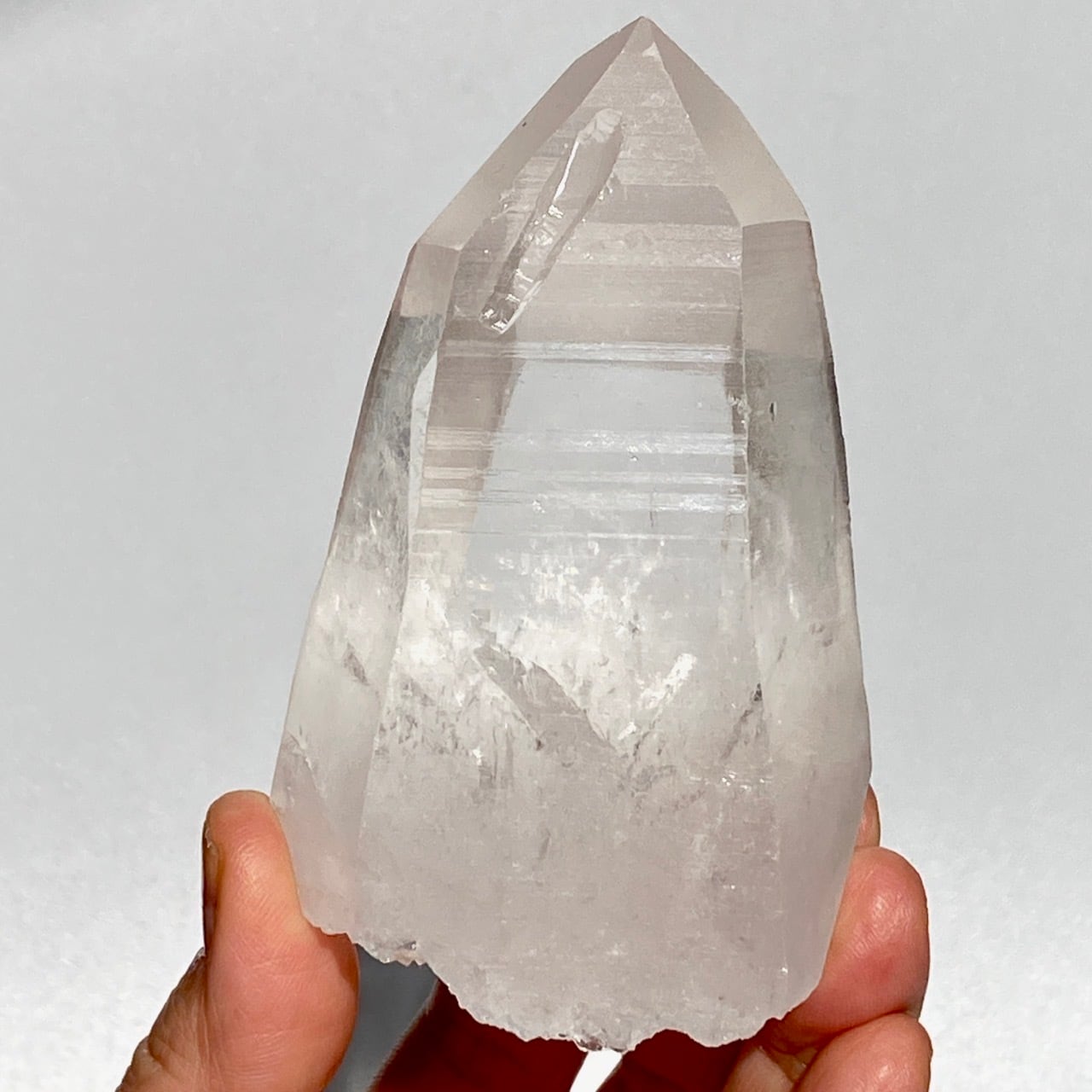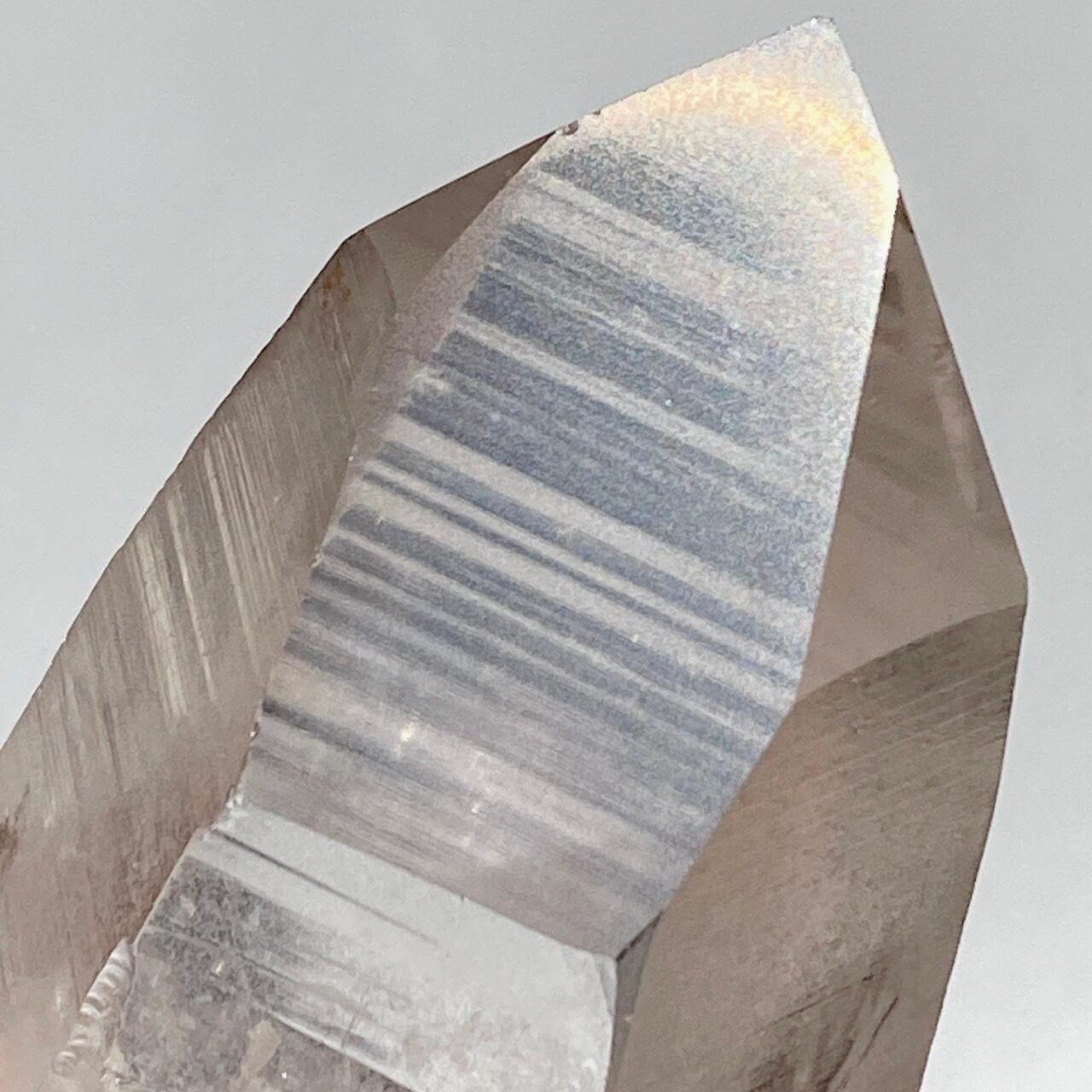 霜もしくは天使の羽の様な見た目の下部とそれ以外の高透明度のセクションのコントラストが魅力的な子です。磨かれた一番大きなファセットから見られる、手でなぞると段差を感じられる反対側の柱面のくっきりとしたレムリアンリッジ(横に入った条線)と、小さなポイントが付いていた箇所(剥離痕)も注目箇所です。