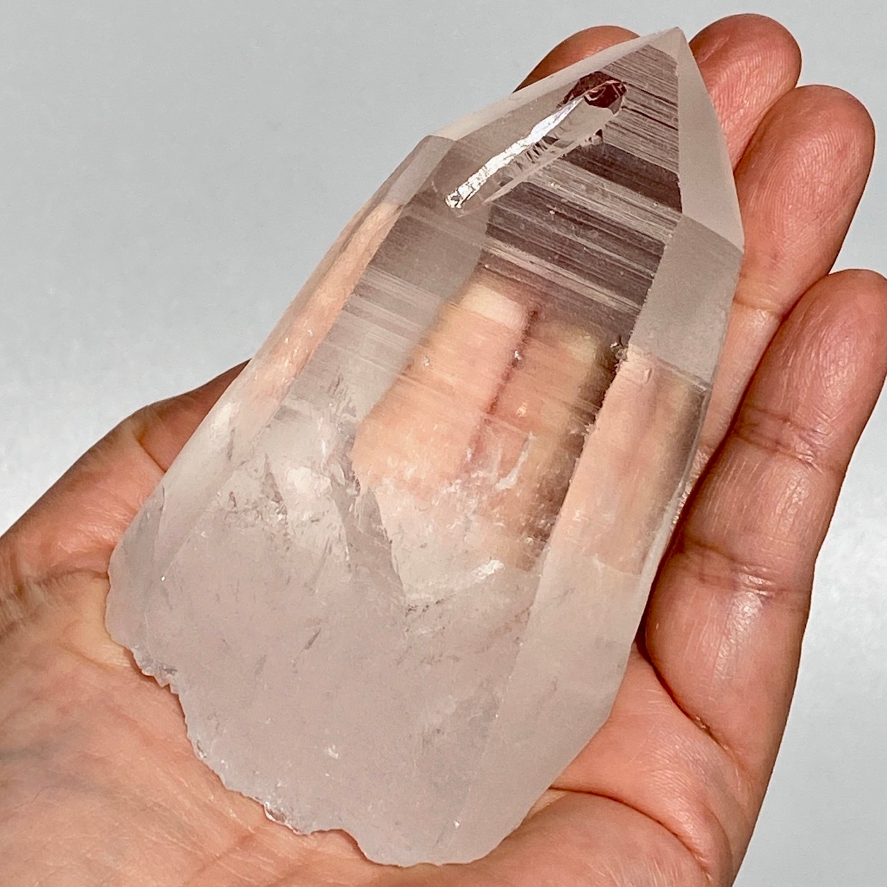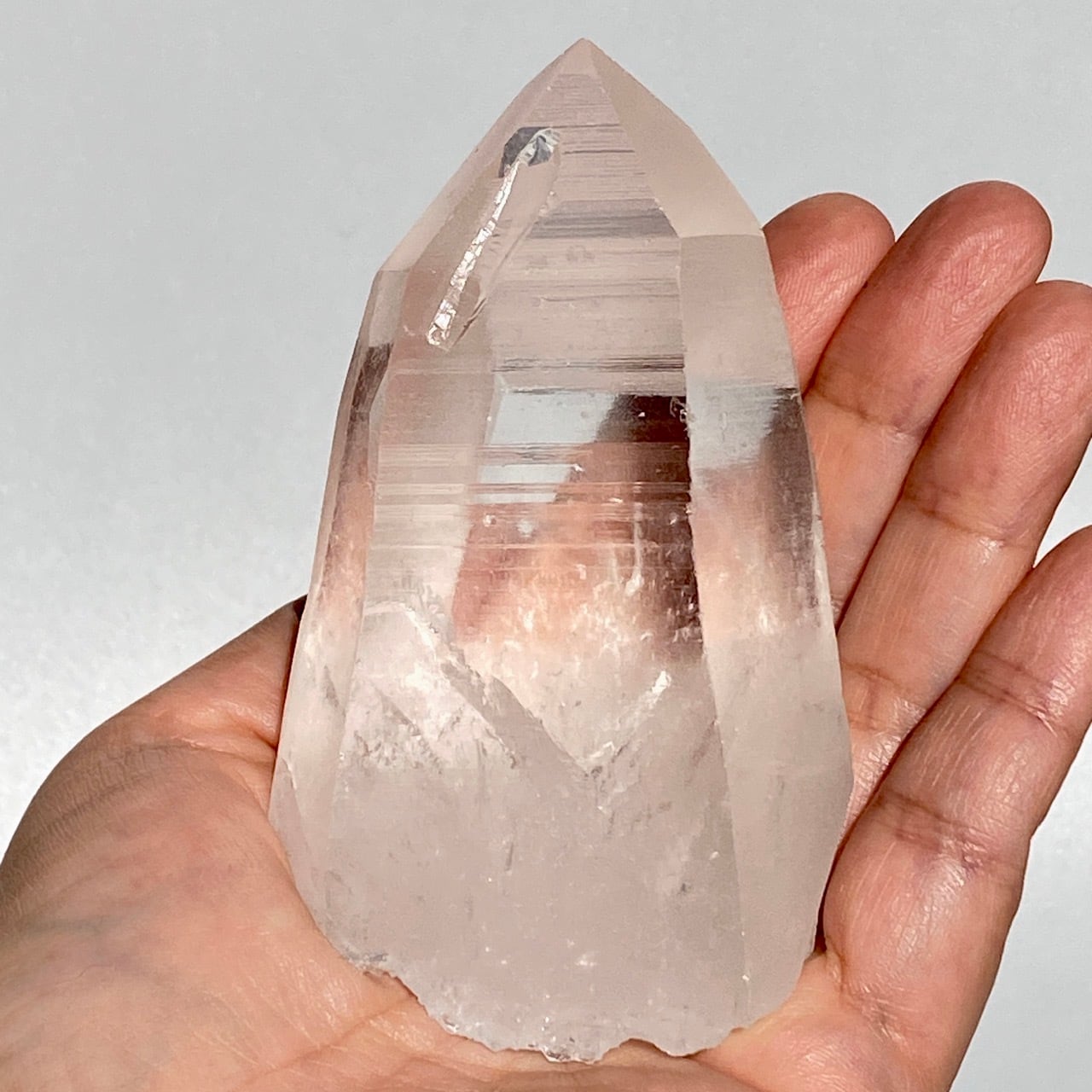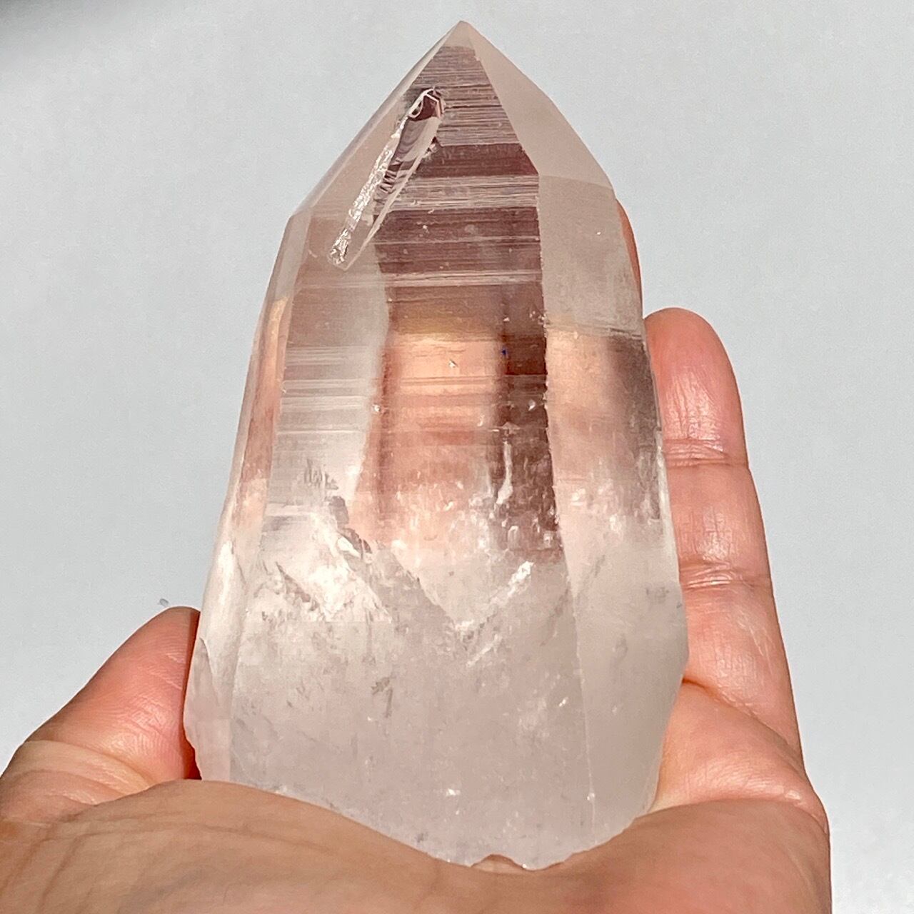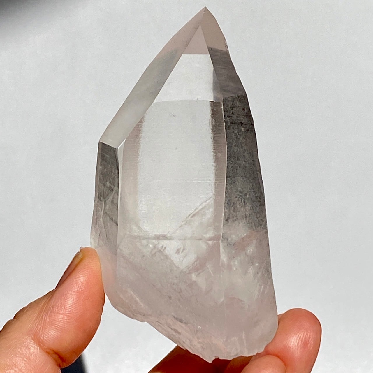 霜もしくは天使の羽の様な見た目の下部とそれ以外の高透明度のセクションのコントラストが魅力的な子です。磨かれた一番大きなファセットから見られる、手でなぞると段差を感じられる反対側の柱面のくっきりとしたレムリアンリッジ(横に入った条線)と、小さなポイントが付いていた箇所(剥離痕)も注目箇所です。