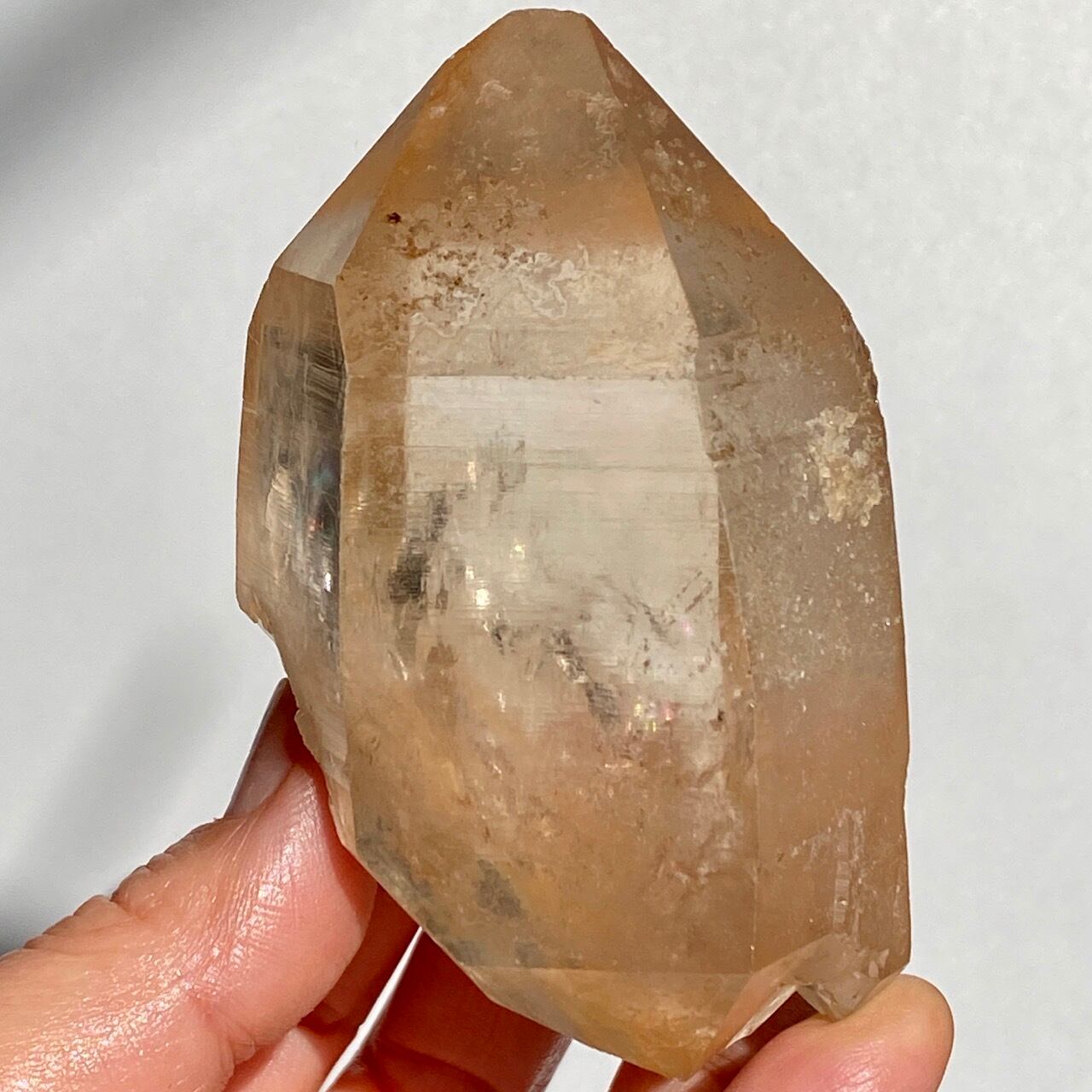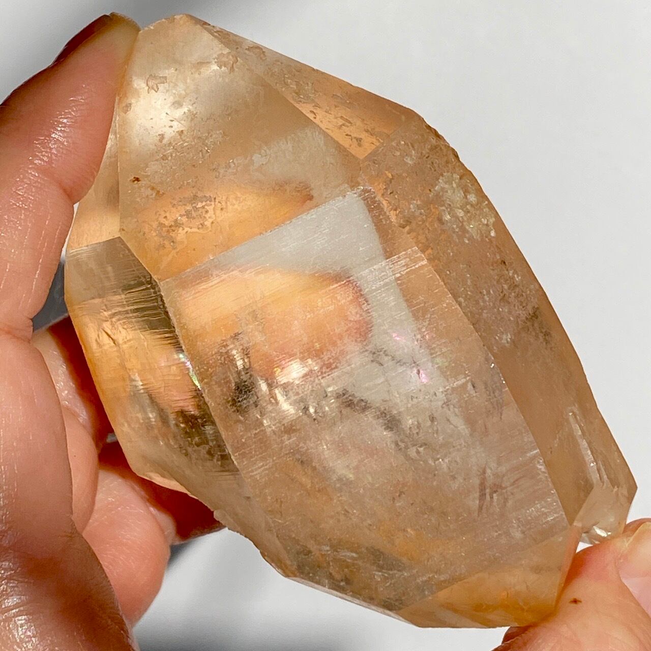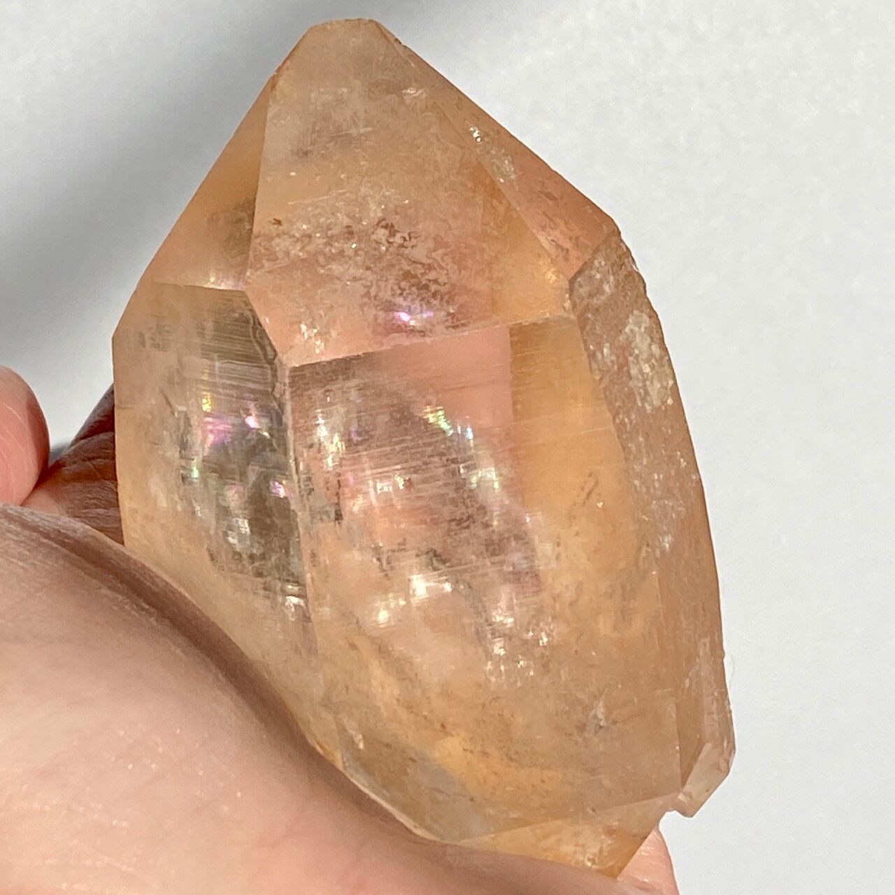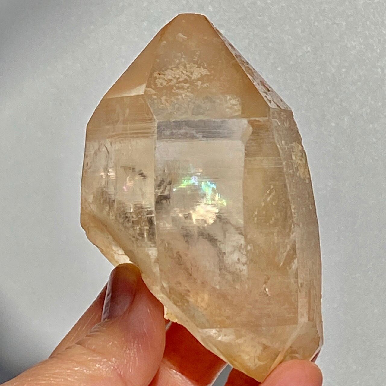この子の特徴は、なんといってもチャンキーなサイズと重量感、柱面に浮かぶ美しい虹です。太陽光では虹が上手く写りませんでしたが、室内のライトではそのくっきりした虹をお楽しみいただけます。そしてダブルターミネーティッド(両剣)水晶の底部が犬歯のようなカテドラル風になっていてるところも見所です。クリスタルを光に透かした際のゴールドのニュアンスが入った優しい橙色が神々しく美しい子です。