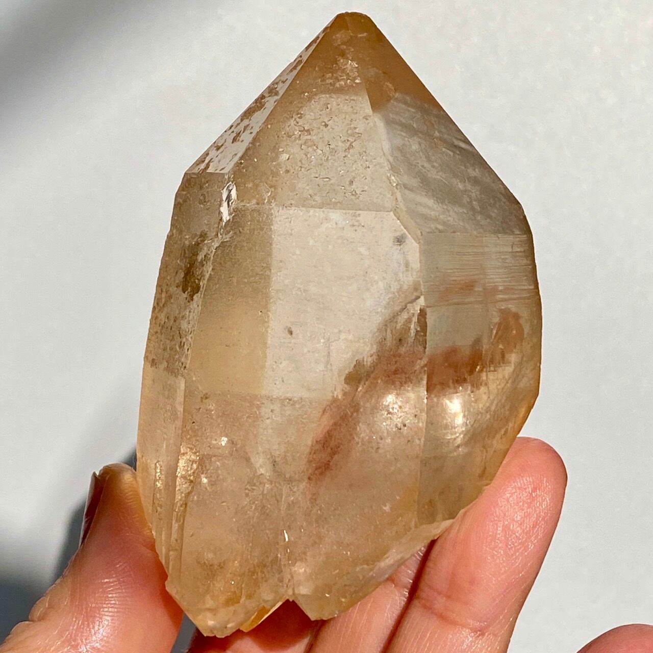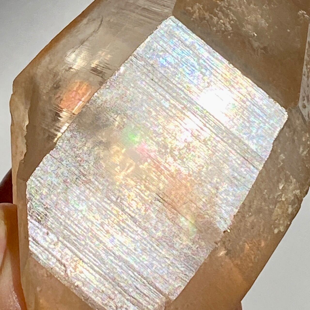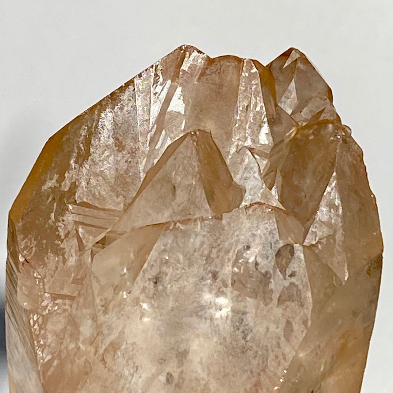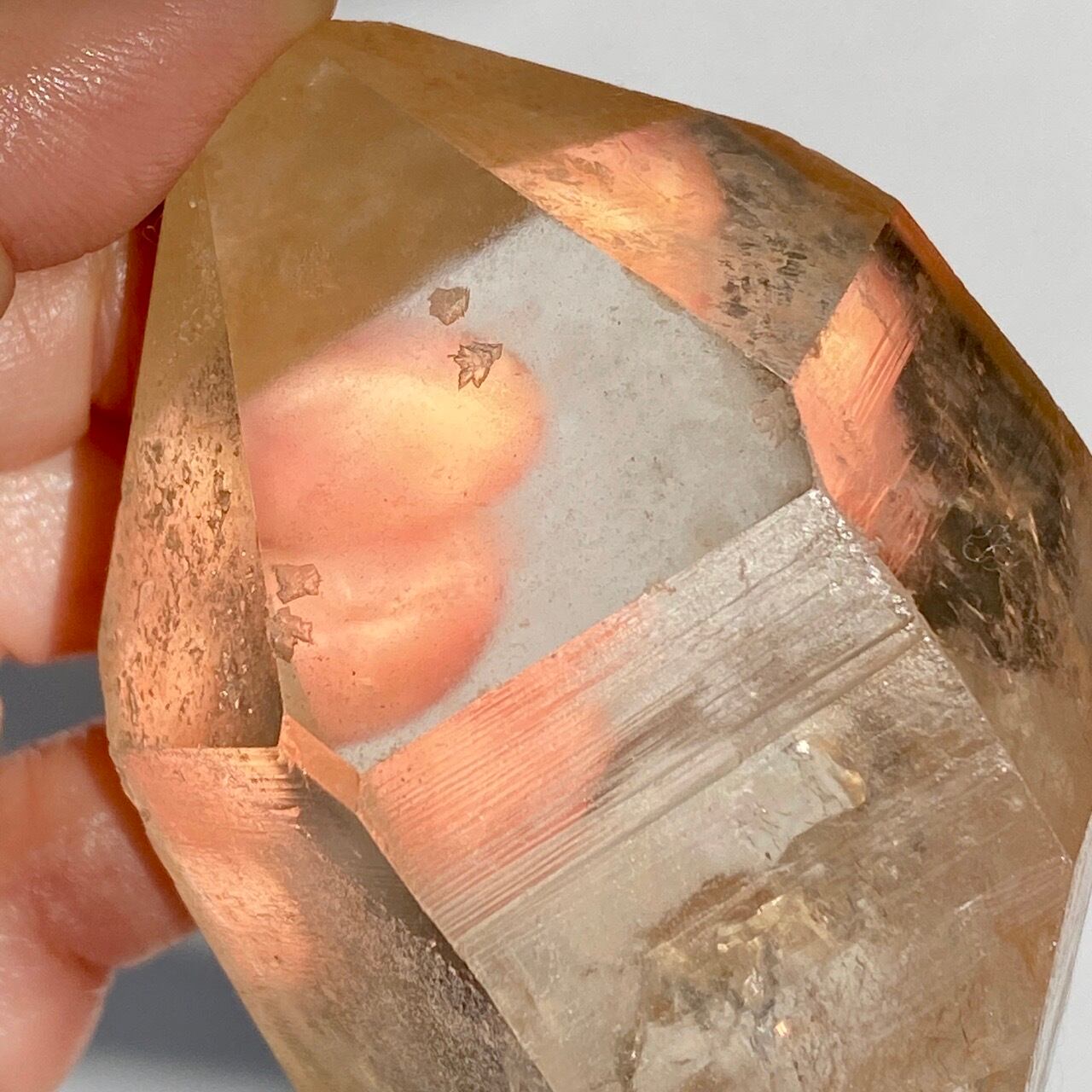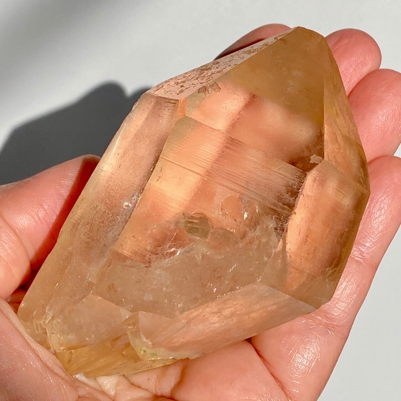 この子の特徴は、なんといってもチャンキーなサイズと重量感、柱面に浮かぶ美しい虹です。太陽光では虹が上手く写りませんでしたが、室内のライトではそのくっきりした虹をお楽しみいただけます。そしてダブルターミネーティッド(両剣)水晶の底部が犬歯のようなカテドラル風になっていてるところも見所です。クリスタルを光に透かした際のゴールドのニュアンスが入った優しい橙色が神々しく美しい子です。