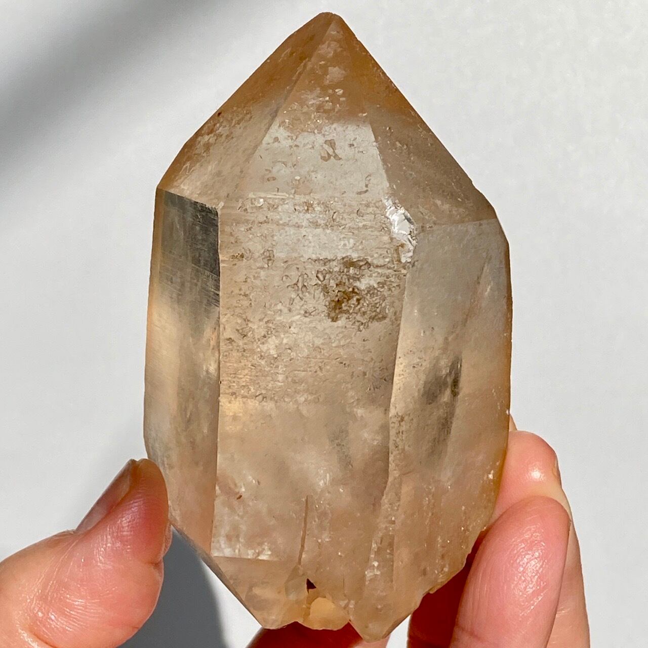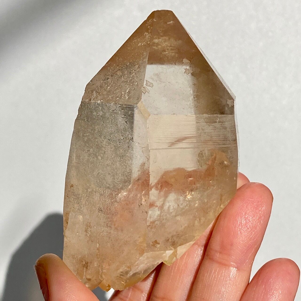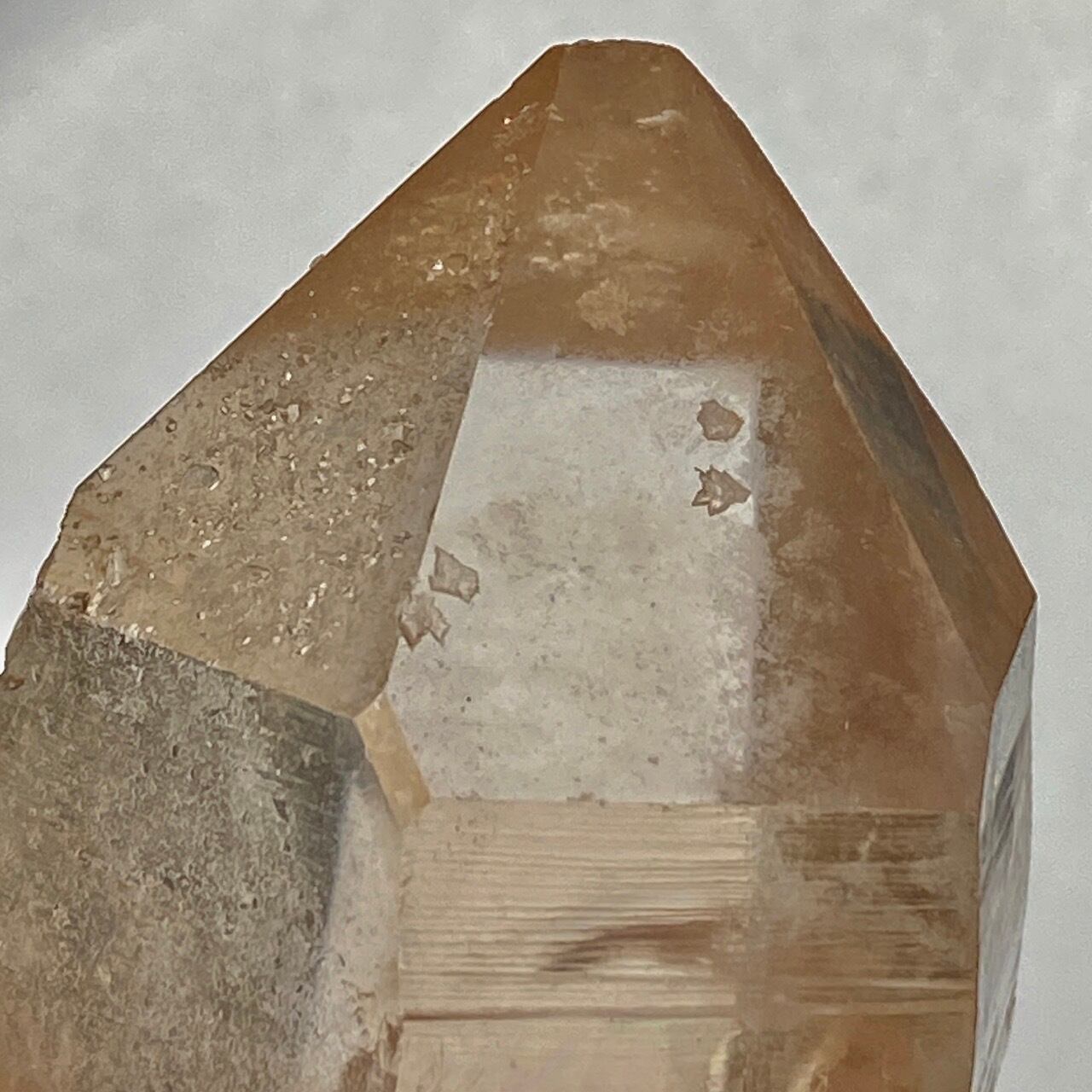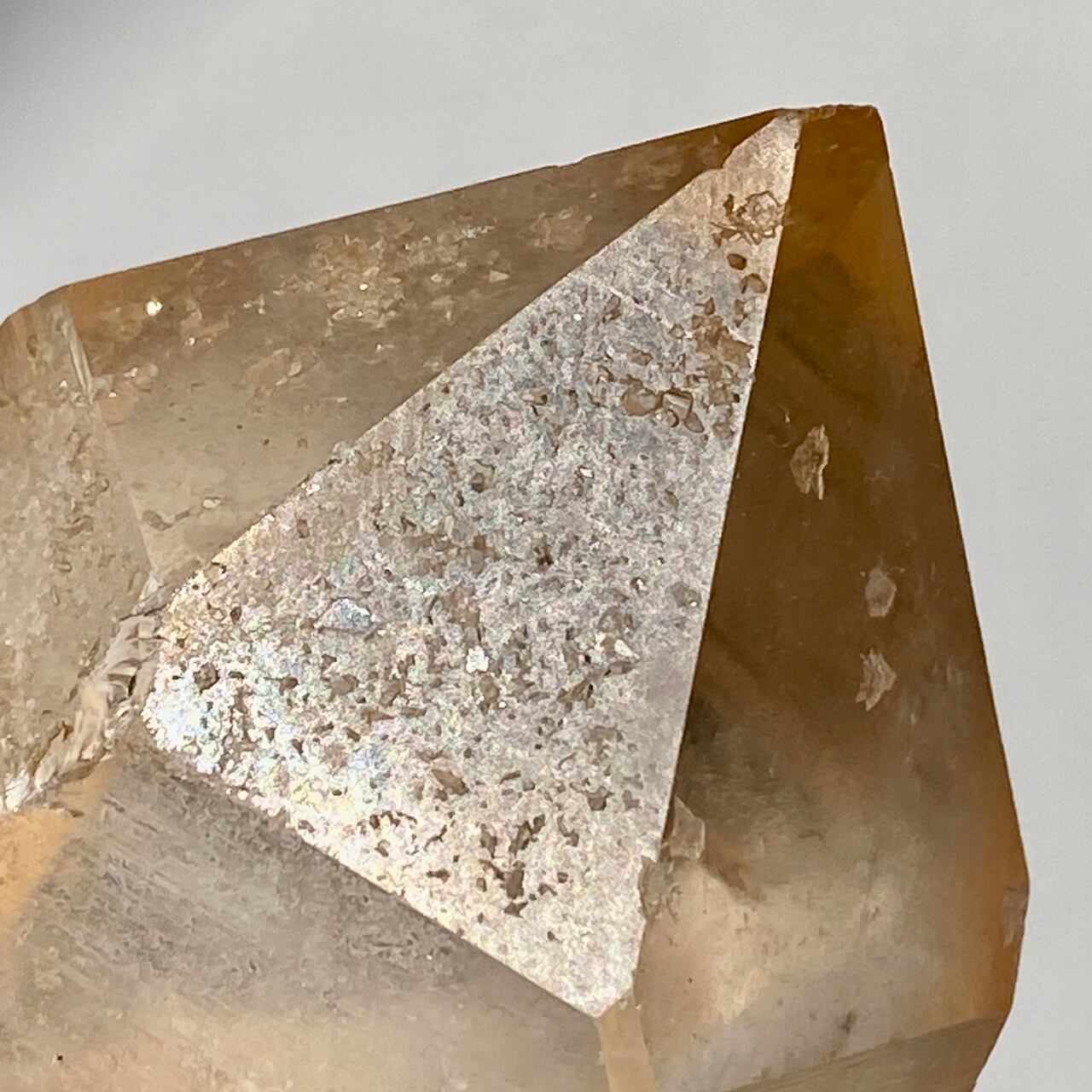 この子の特徴は、なんといってもチャンキーなサイズと重量感、柱面に浮かぶ美しい虹です。太陽光では虹が上手く写りませんでしたが、室内のライトではそのくっきりした虹をお楽しみいただけます。そしてダブルターミネーティッド(両剣)水晶の底部が犬歯のようなカテドラル風になっていてるところも見所です。クリスタルを光に透かした際のゴールドのニュアンスが入った優しい橙色が神々しく美しい子です。