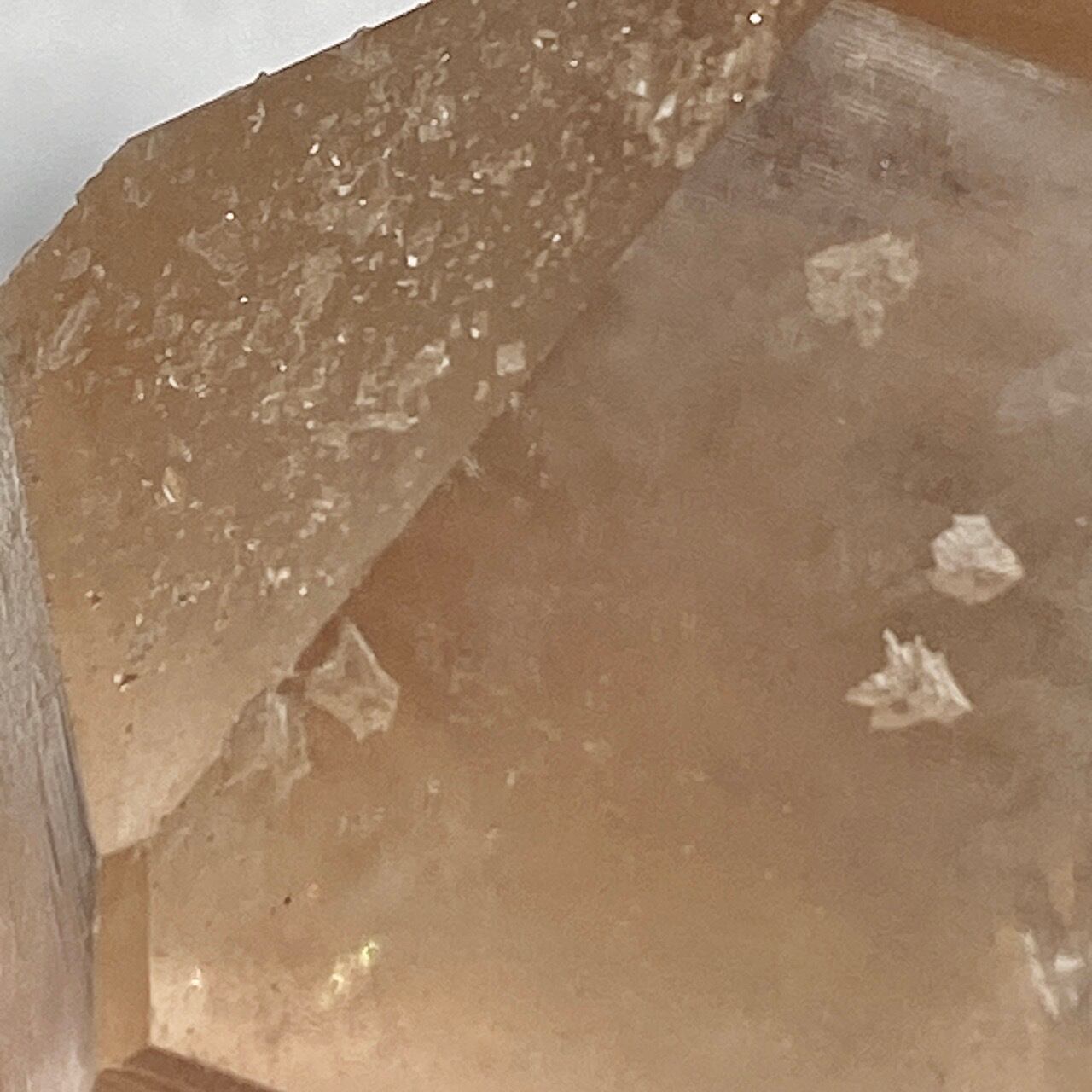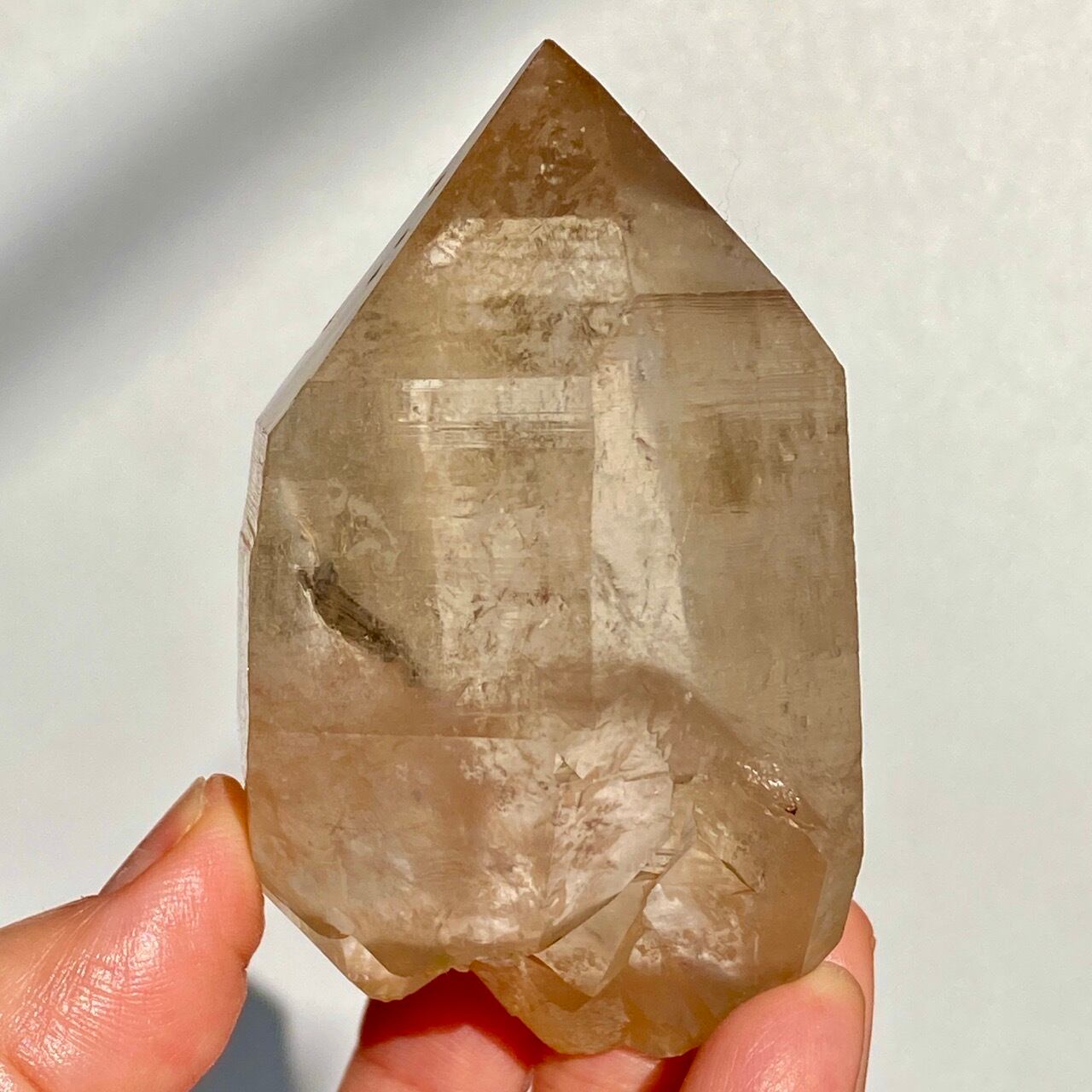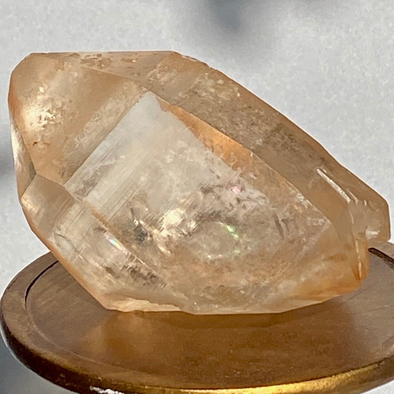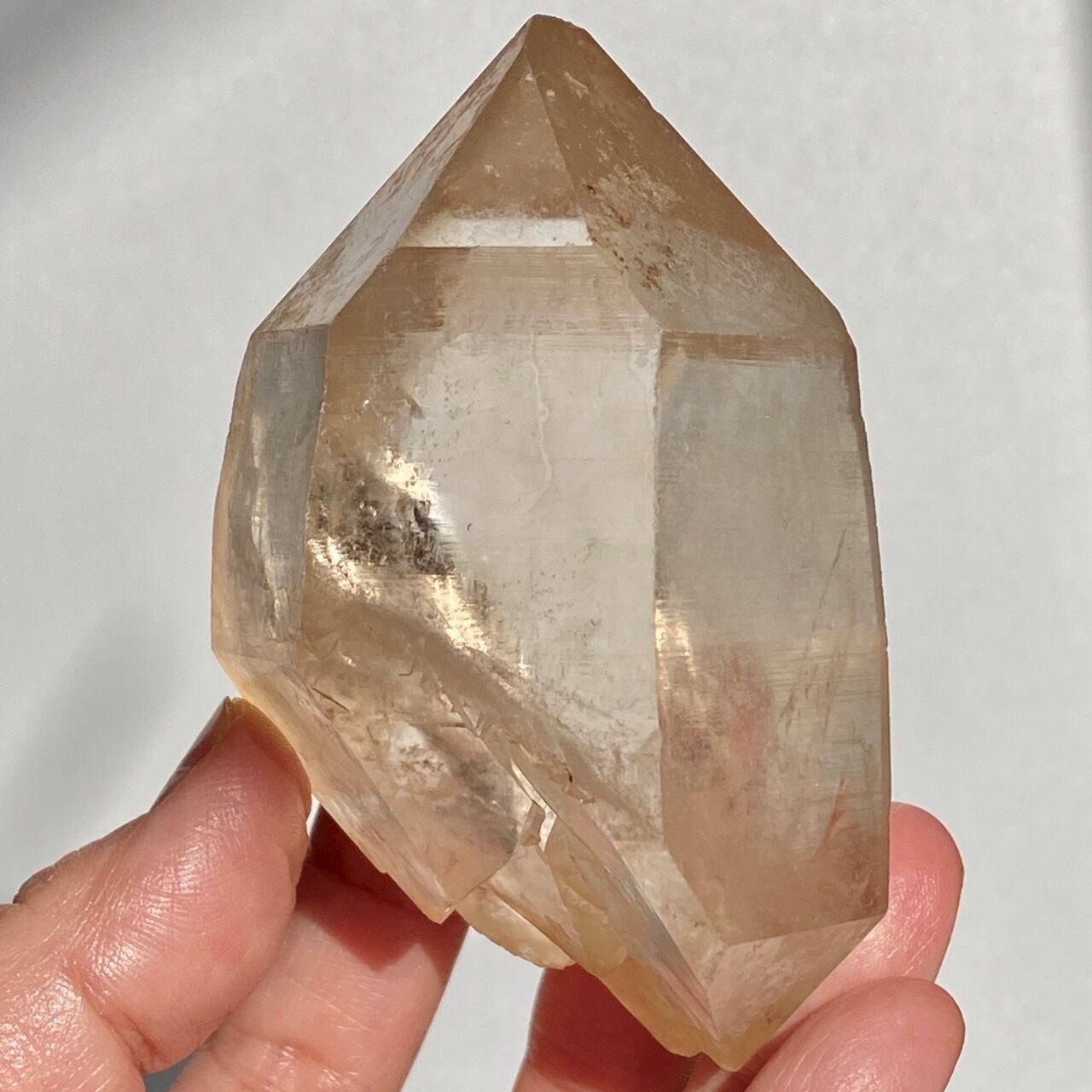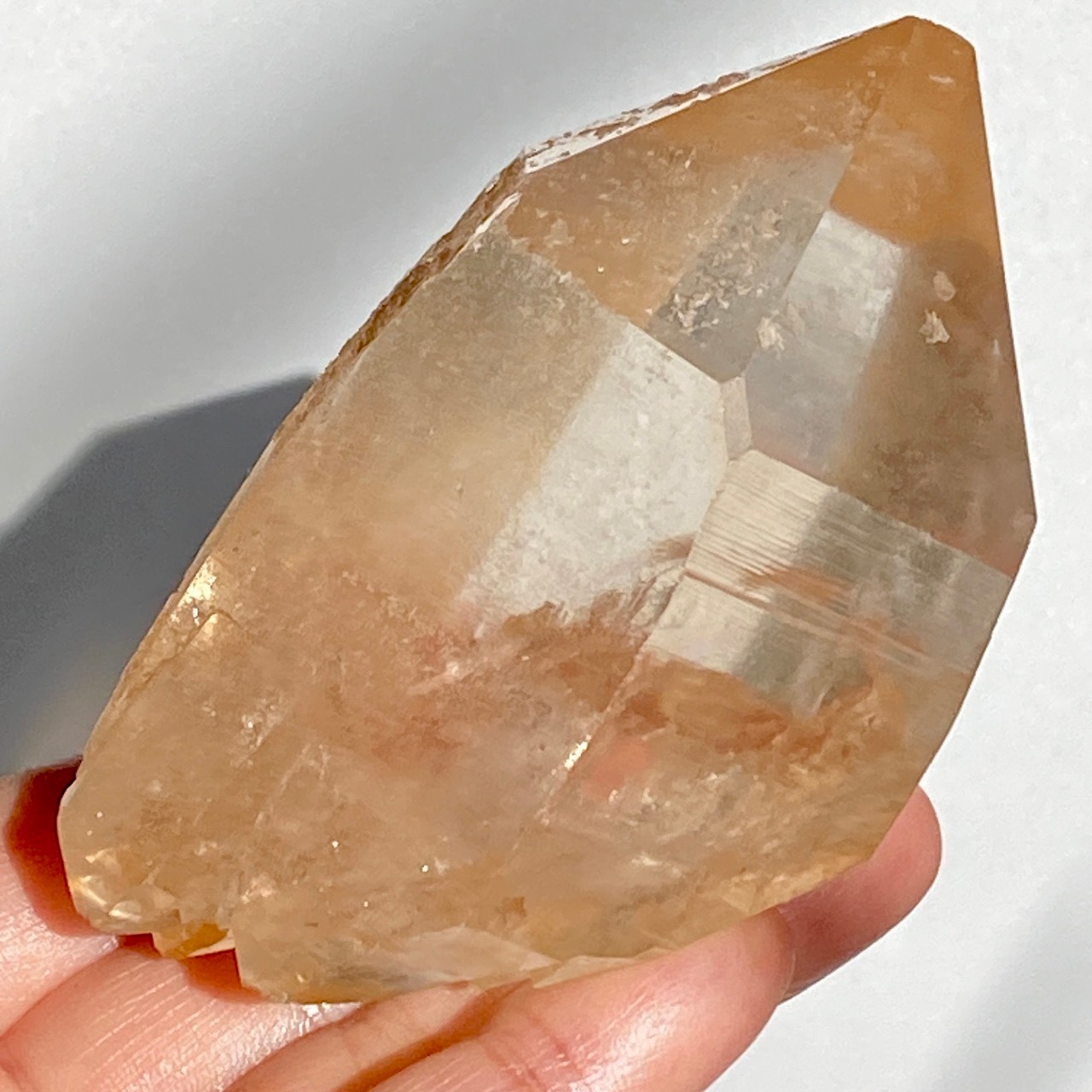 この子の特徴は、なんといってもチャンキーなサイズと重量感、柱面に浮かぶ美しい虹です。太陽光では虹が上手く写りませんでしたが、室内のライトではそのくっきりした虹をお楽しみいただけます。そしてダブルターミネーティッド(両剣)水晶の底部が犬歯のようなカテドラル風になっていてるところも見所です。クリスタルを光に透かした際のゴールドのニュアンスが入った優しい橙色が神々しく美しい子です。
