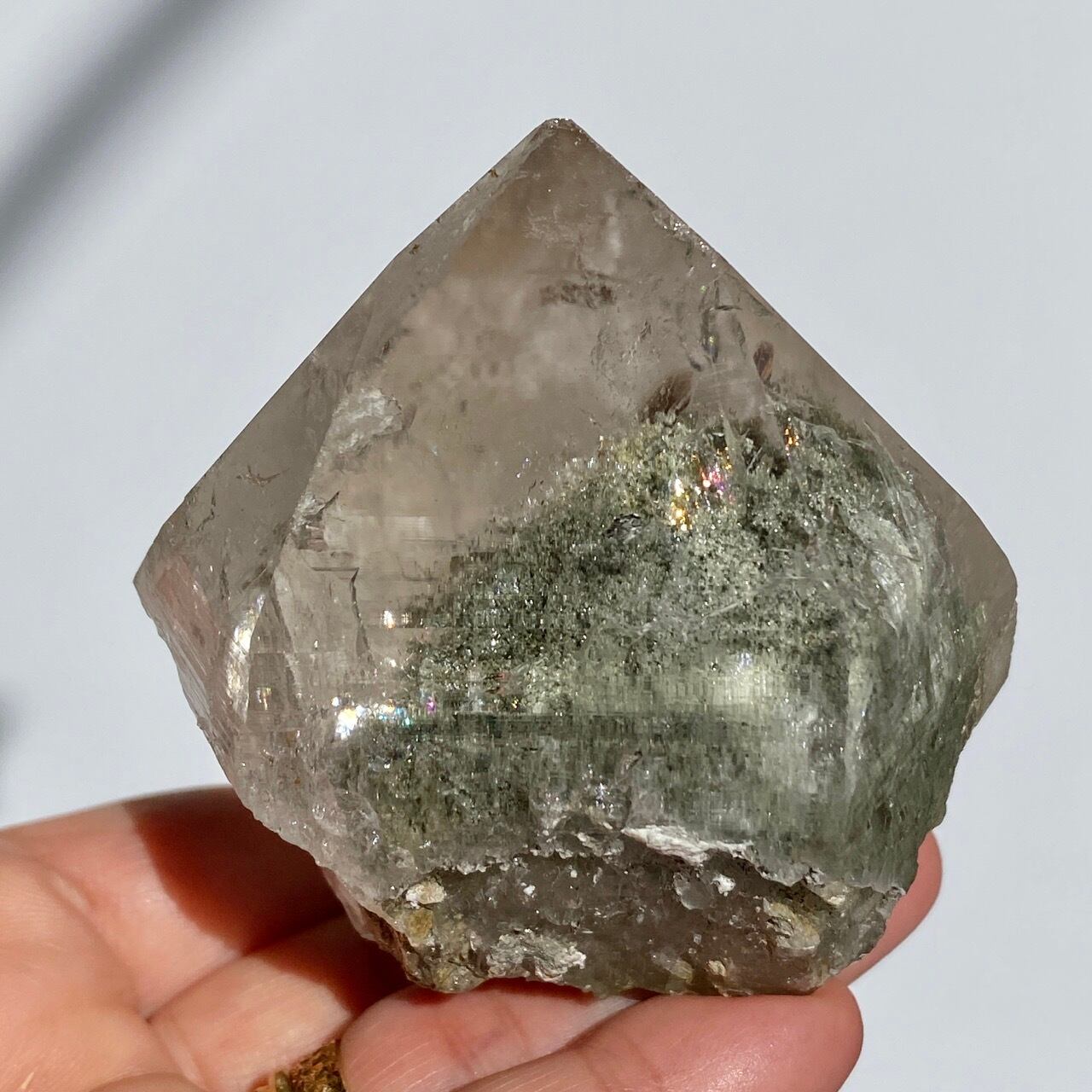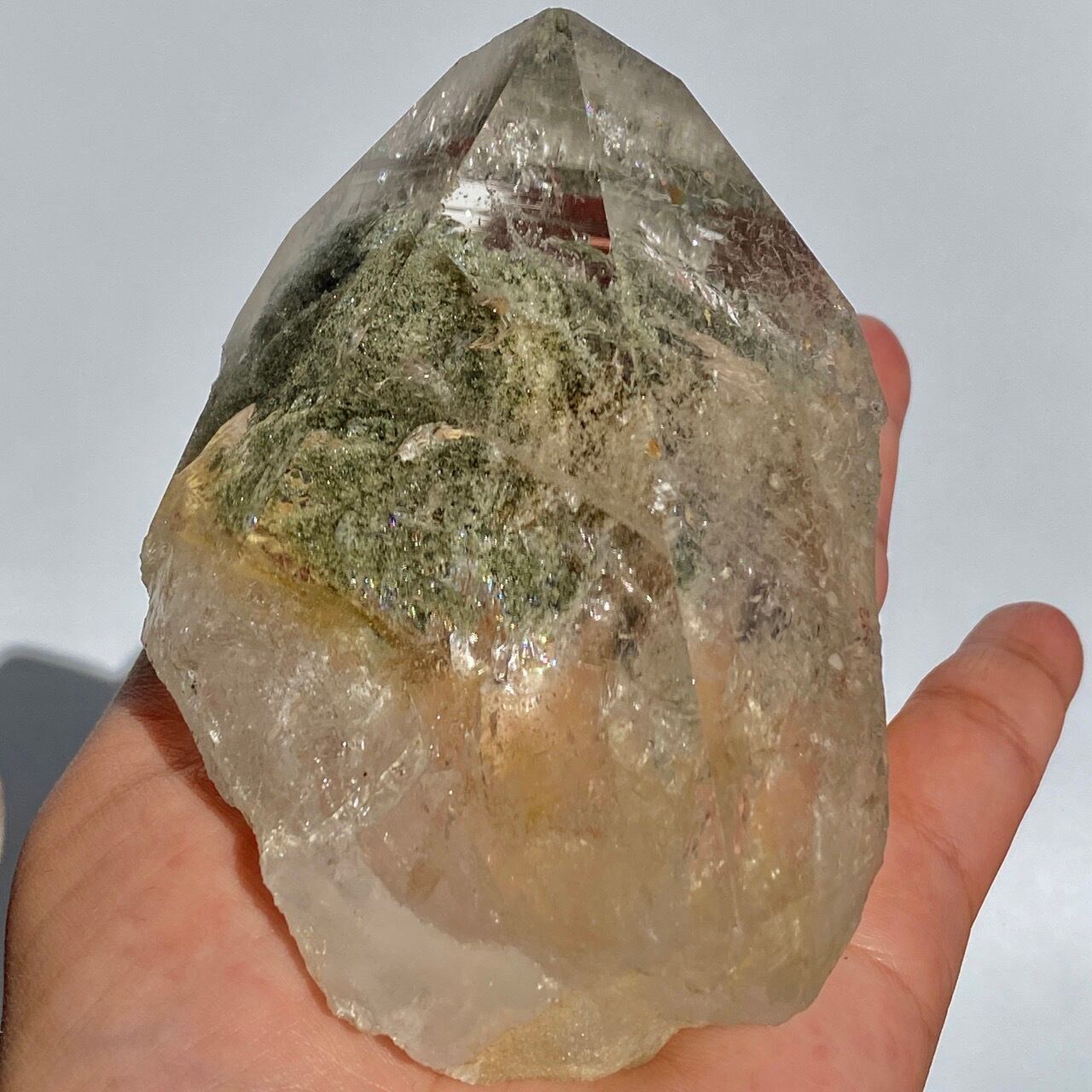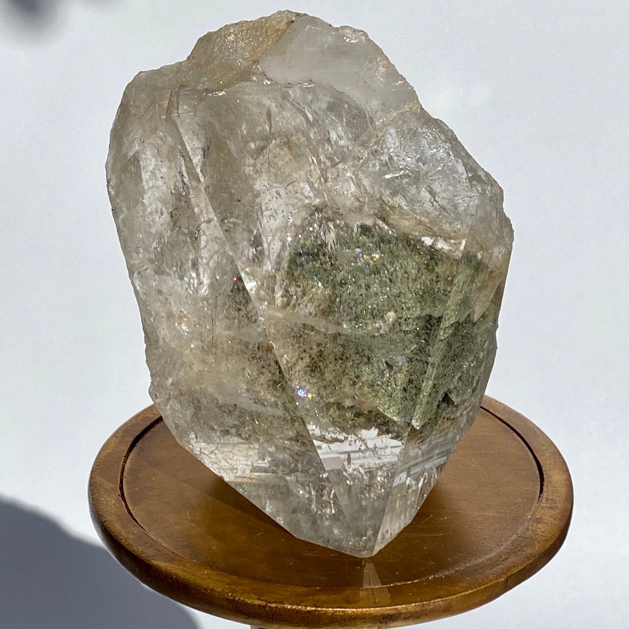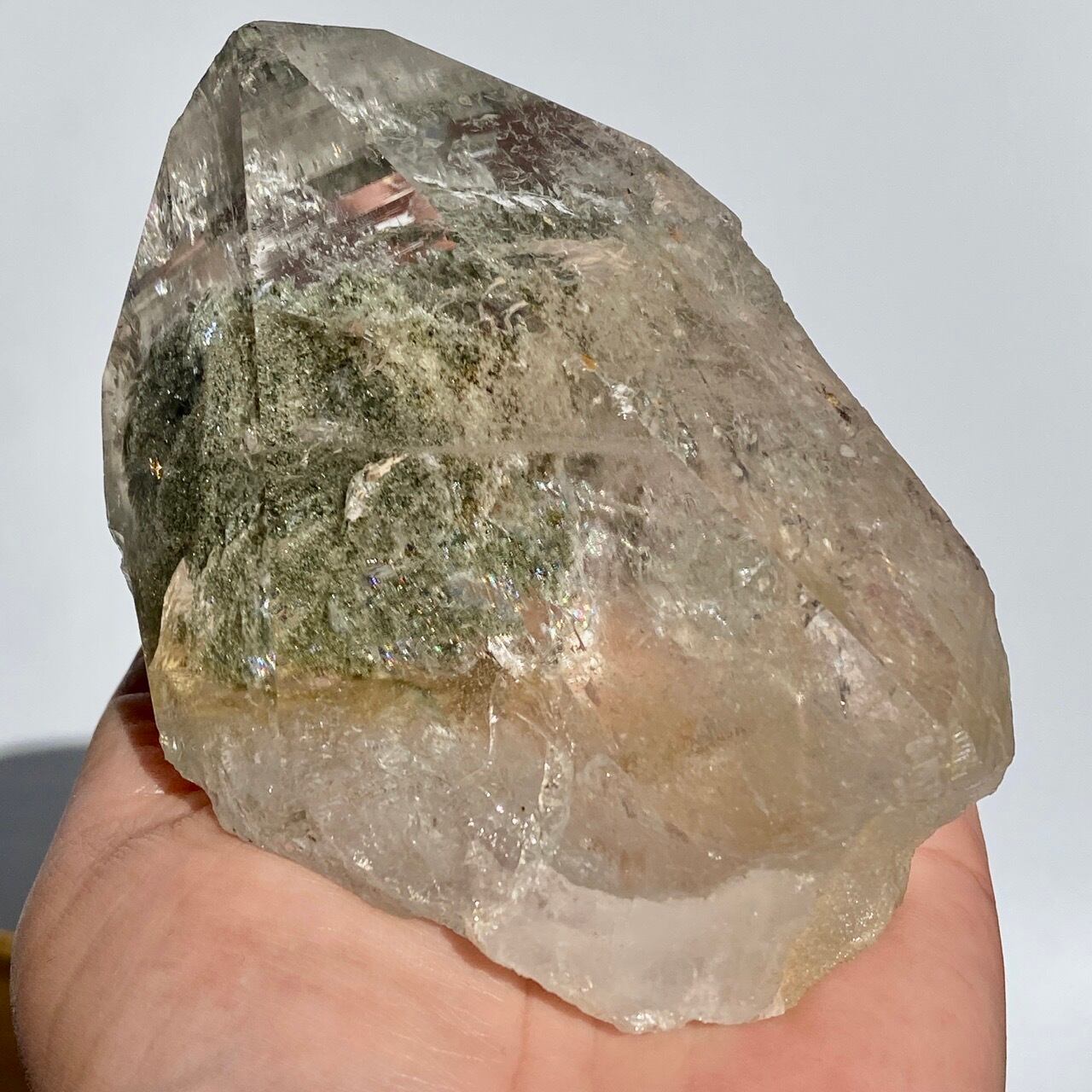 高透明度の大きなポイントの中にクローライトのインクルージョンの塊が閉じ込められているスノードームの様な子です。クローライトの苔の様なディテールを観察する事ができます。小さな虹も沢山ちりばめられているのでお楽しみ頂けます。