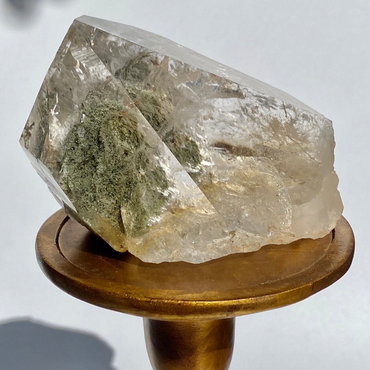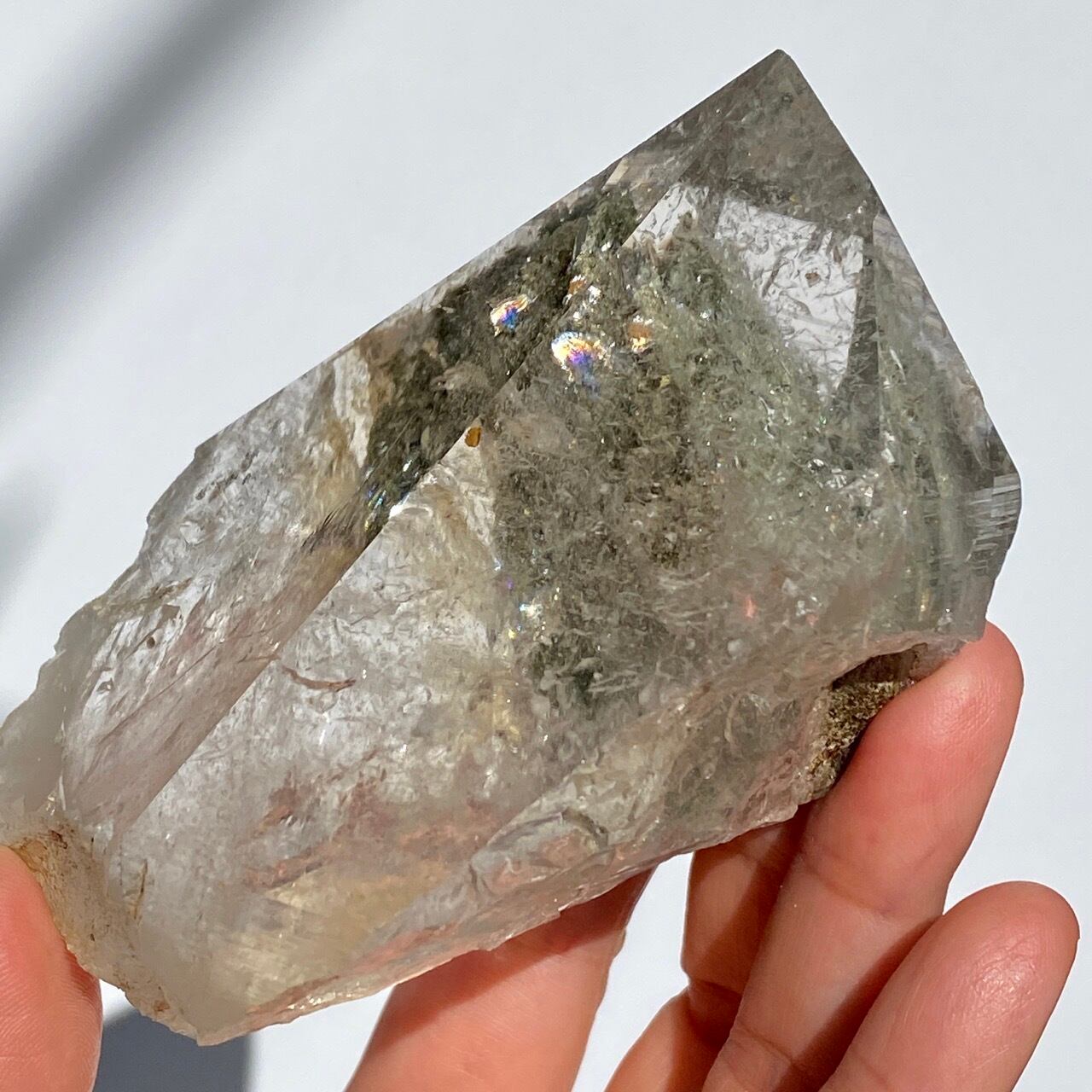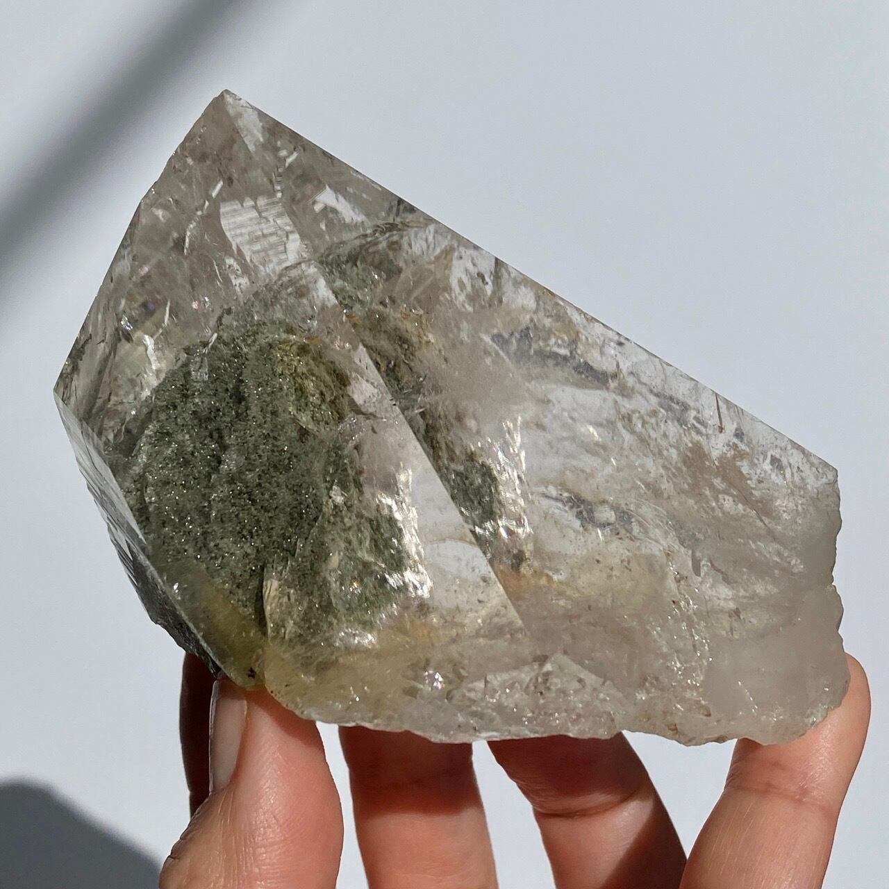 高透明度の大きなポイントの中にクローライトのインクルージョンの塊が閉じ込められているスノードームの様な子です。クローライトの苔の様なディテールを観察する事ができます。小さな虹も沢山ちりばめられているのでお楽しみ頂けます。
