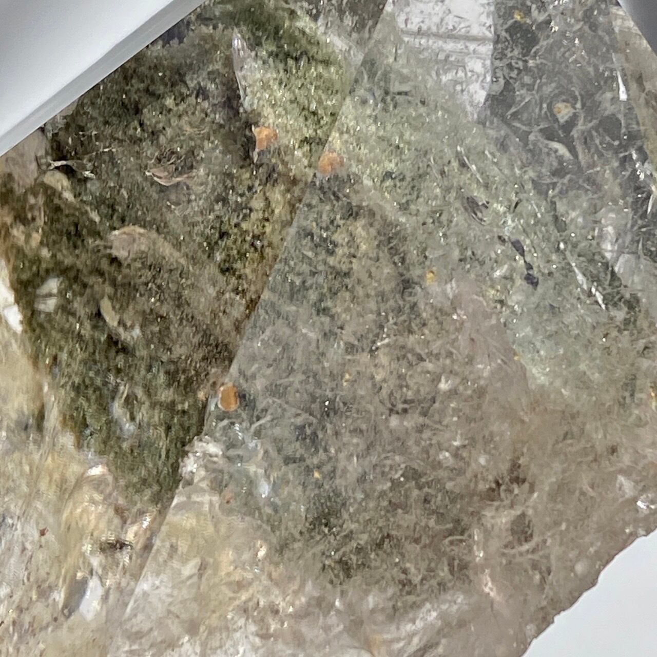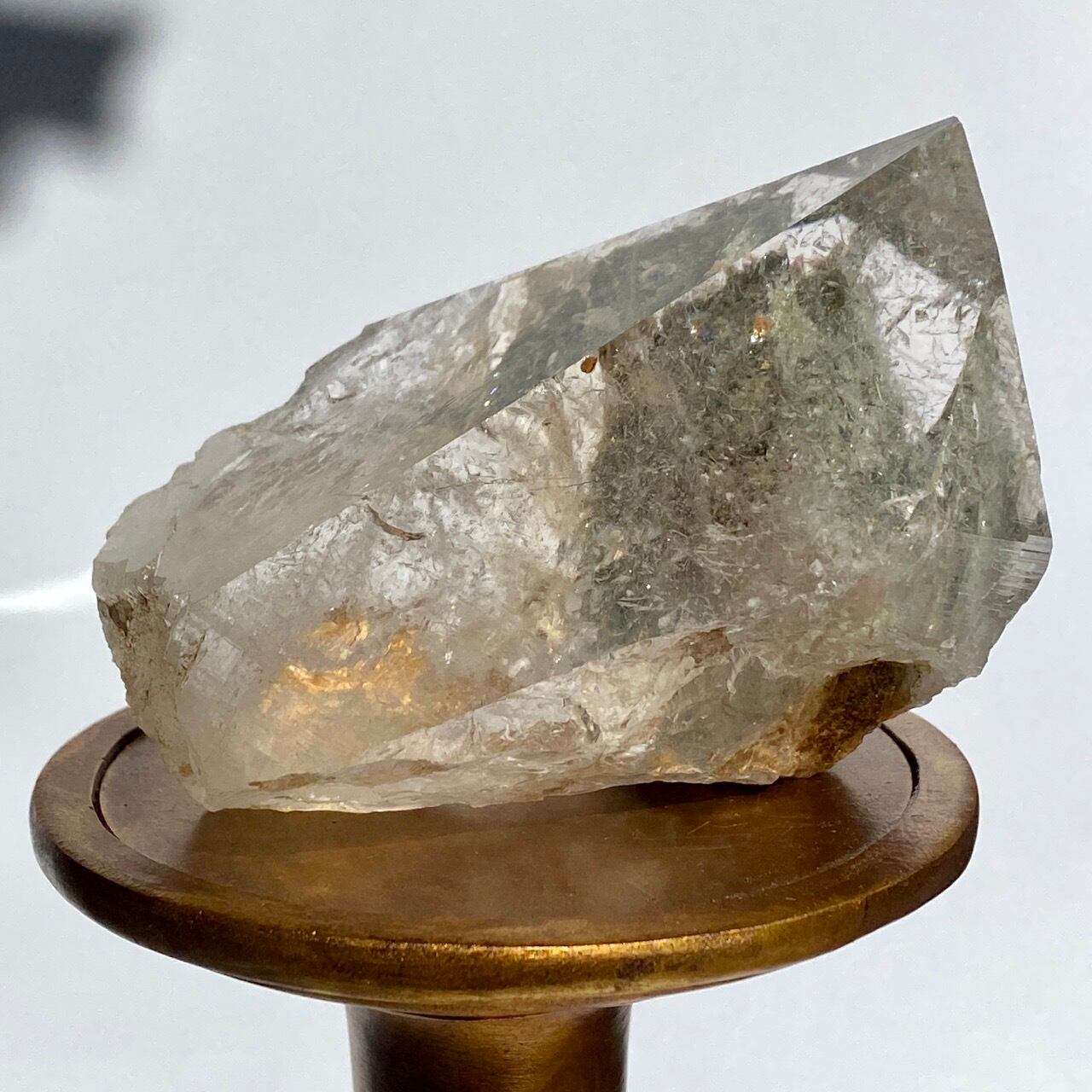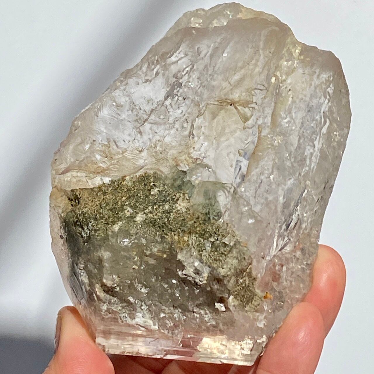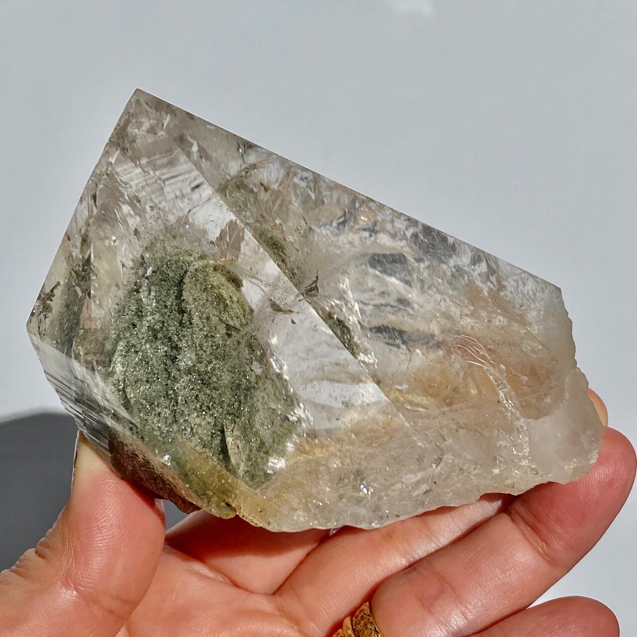 高透明度の大きなポイントの中にクローライトのインクルージョンの塊が閉じ込められているスノードームの様な子です。クローライトの苔の様なディテールを観察する事ができます。小さな虹も沢山ちりばめられているのでお楽しみ頂けます。