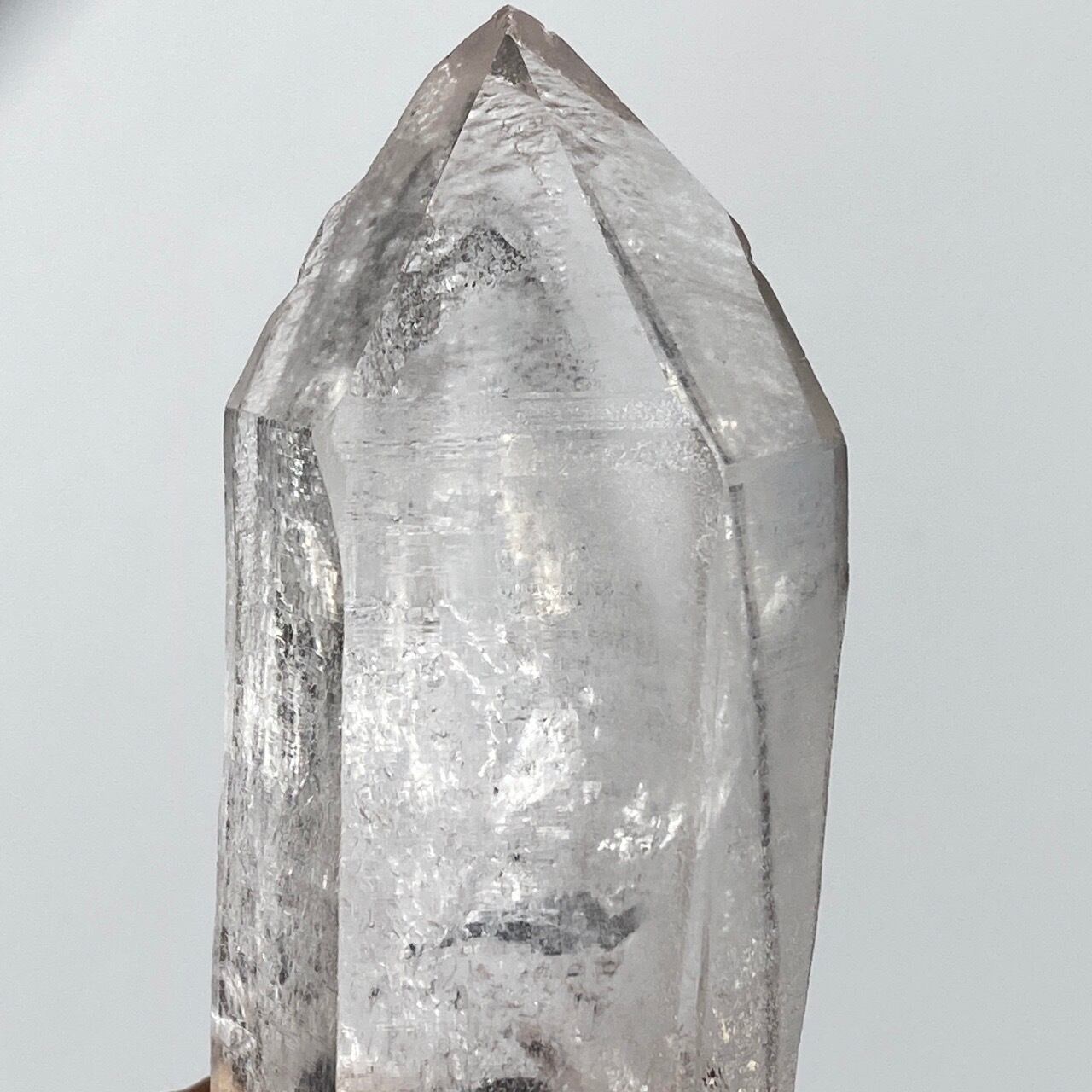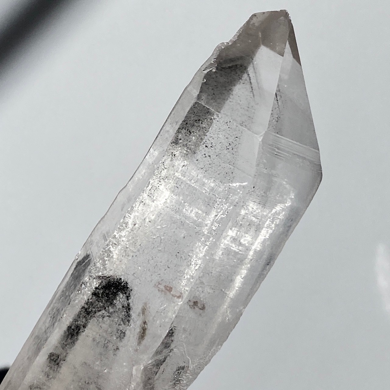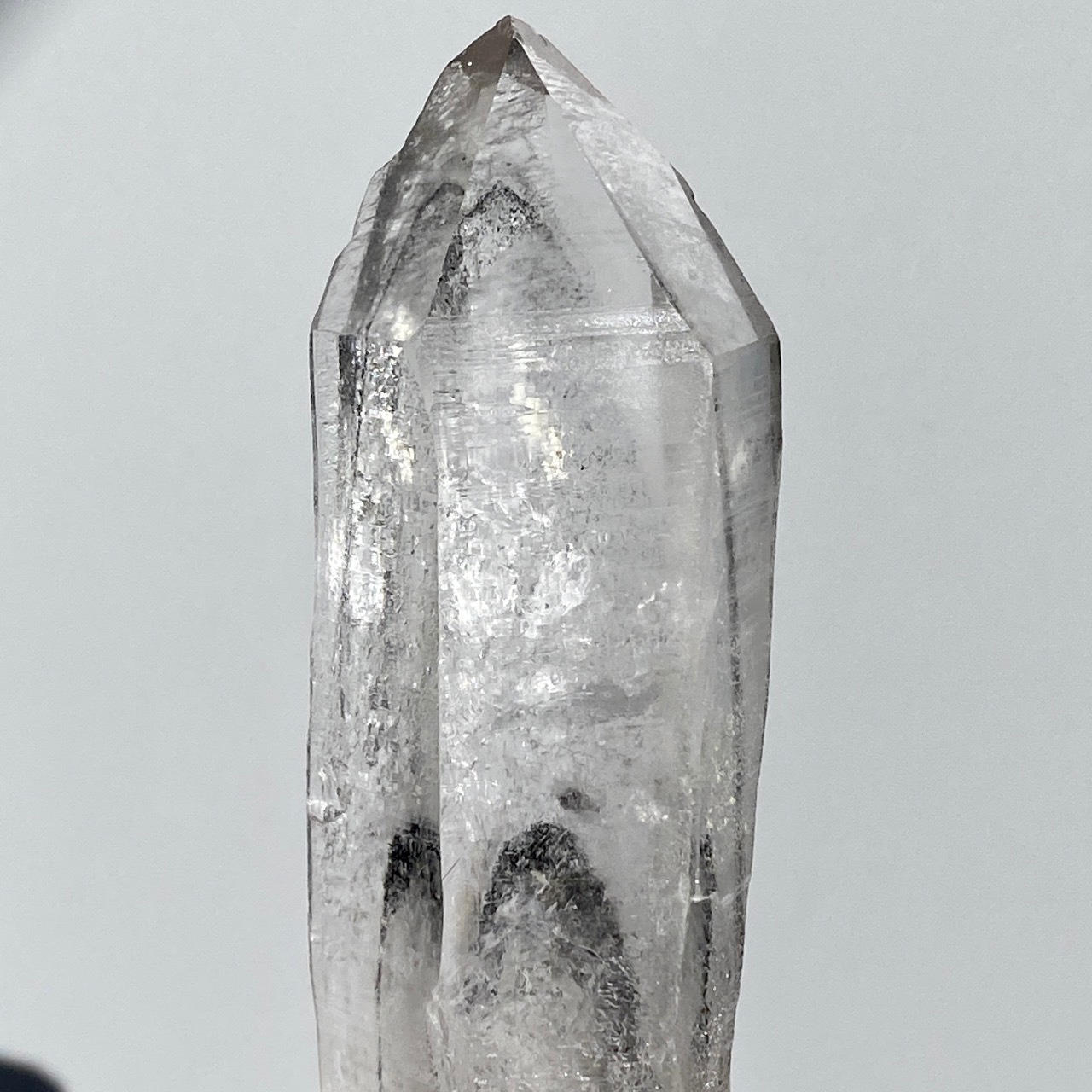 氷を思わせる様な太いワンド的ピース。上部に薄らと2層のファントム(※)が、そして真ん中辺りから下部にかけて美しいファントムと虹が見られます。正直、ブラックファントムの水晶は不透明なピースが多い中、この子は最も透明感がある子で、太くて長いポイントも群を抜いて魅力的です。また、店主の愛するダイナミックな剥離痕も縦断していて、重量サイズともに非常に存在感のあるピースです。