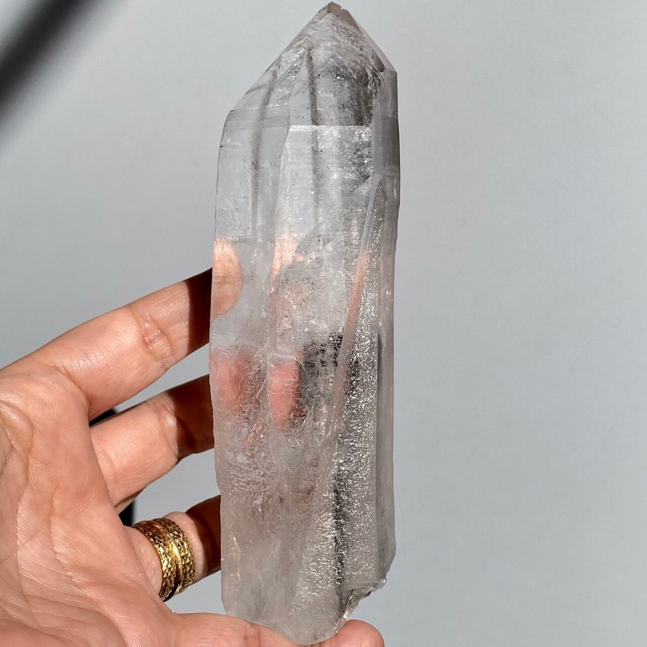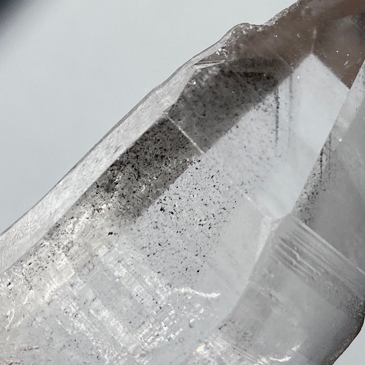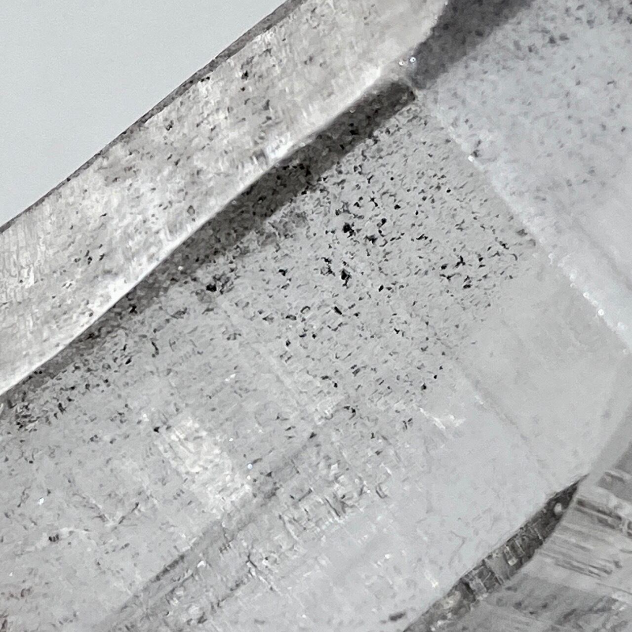 氷を思わせる様な太いワンド的ピース。上部に薄らと2層のファントム(※)が、そして真ん中辺りから下部にかけて美しいファントムと虹が見られます。正直、ブラックファントムの水晶は不透明なピースが多い中、この子は最も透明感がある子で、太くて長いポイントも群を抜いて魅力的です。また、店主の愛するダイナミックな剥離痕も縦断していて、重量サイズともに非常に存在感のあるピースです。