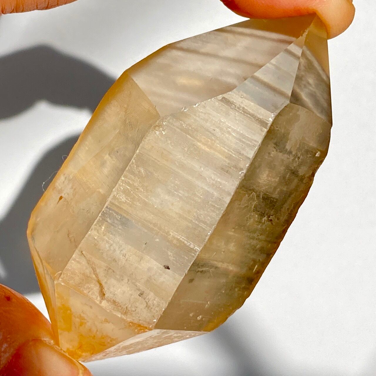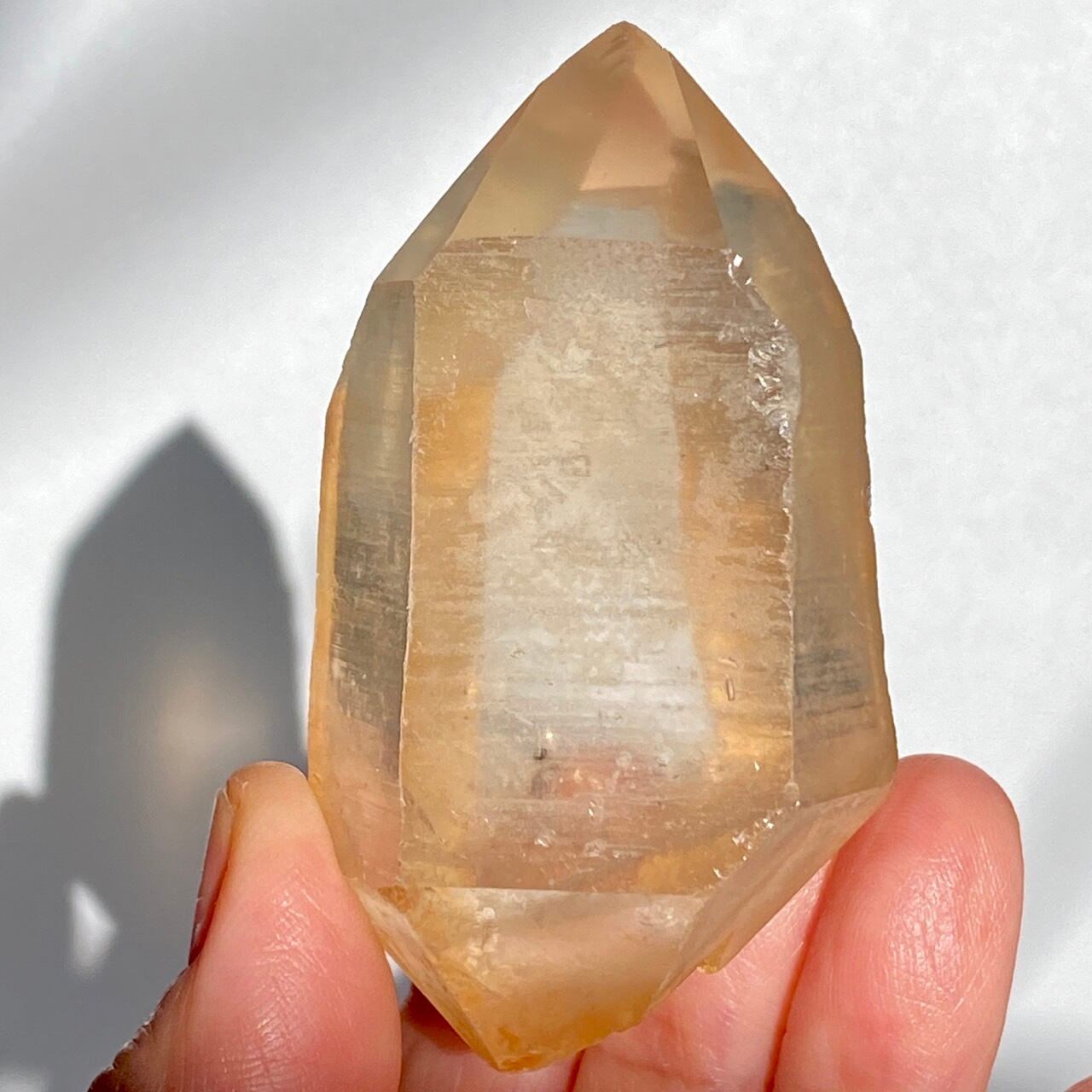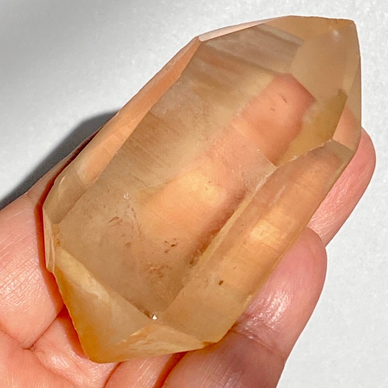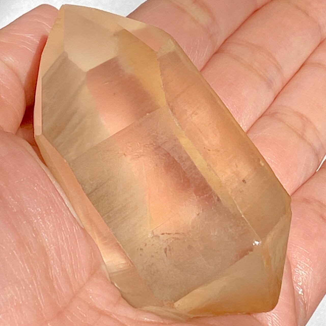 この子はコロッとした可愛い形状とダブルターミネーティッド(両剣)の片方に段差がある(そこに指を収めるのも良き♡)ところです。また太陽光にクリスタルを透かした際の神々しさと若干ゴールドがかったどこまでも優しい橙色味が非常に美しいです。