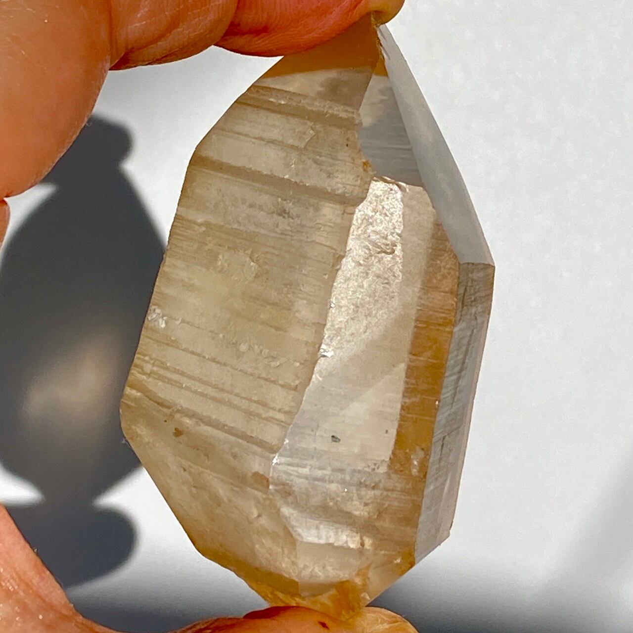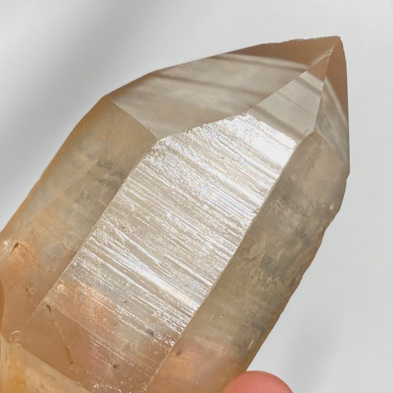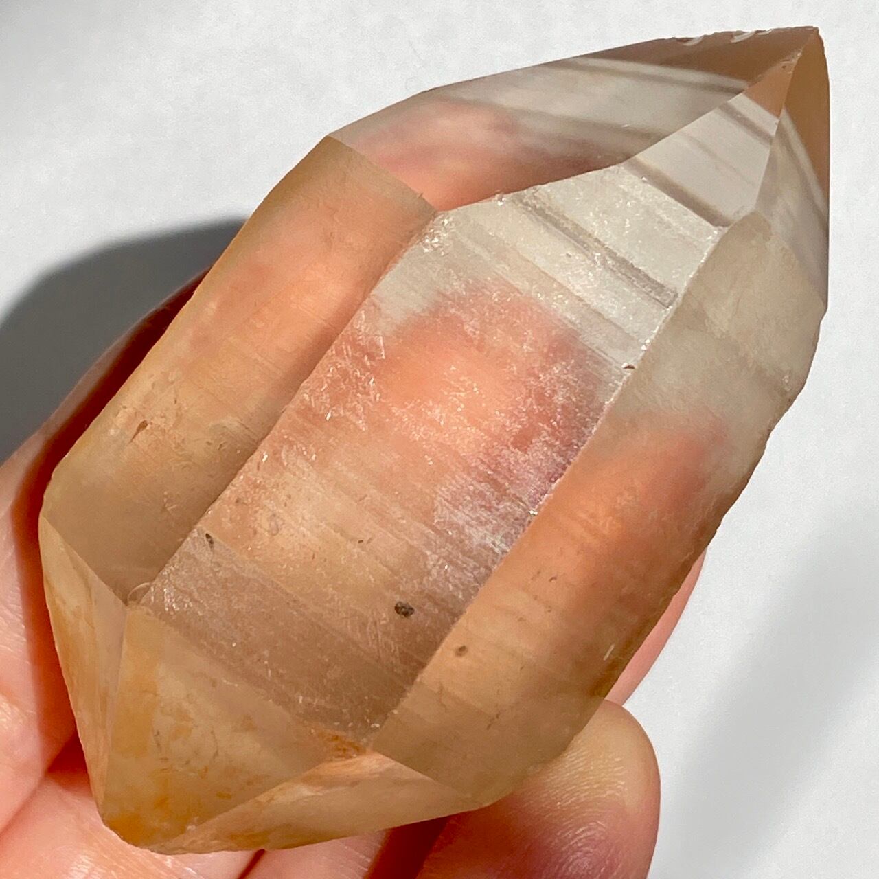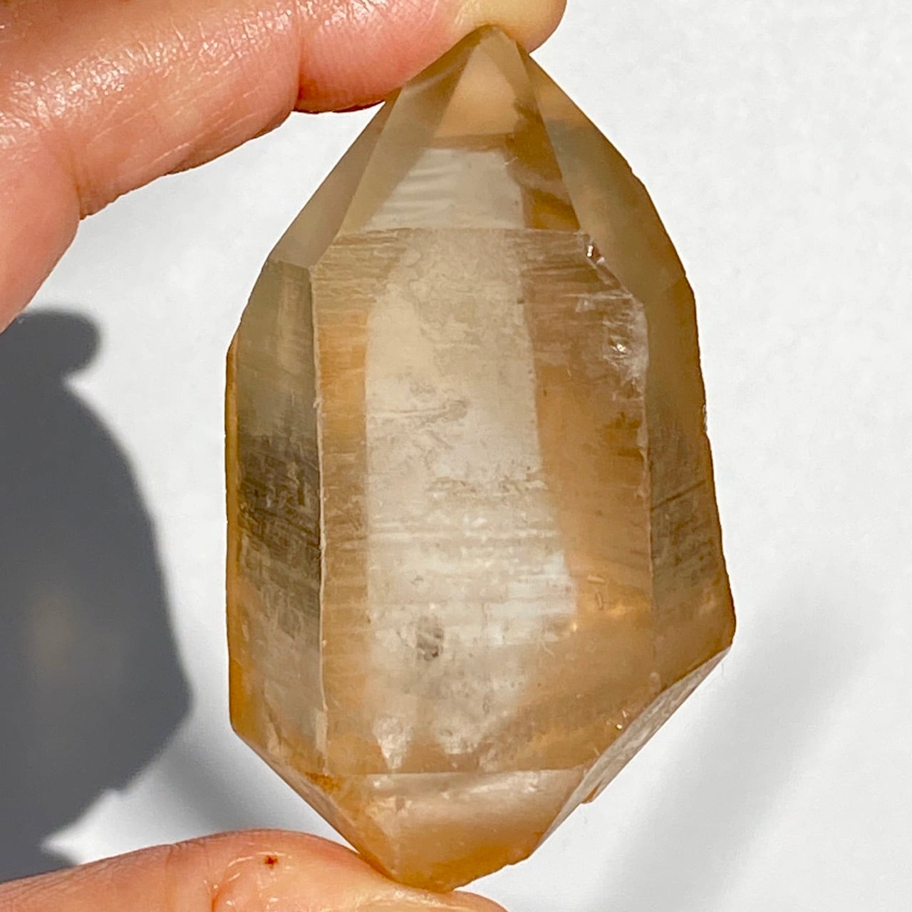 この子はコロッとした可愛い形状とダブルターミネーティッド(両剣)の片方に段差がある(そこに指を収めるのも良き♡)ところです。また太陽光にクリスタルを透かした際の神々しさと若干ゴールドがかったどこまでも優しい橙色味が非常に美しいです。