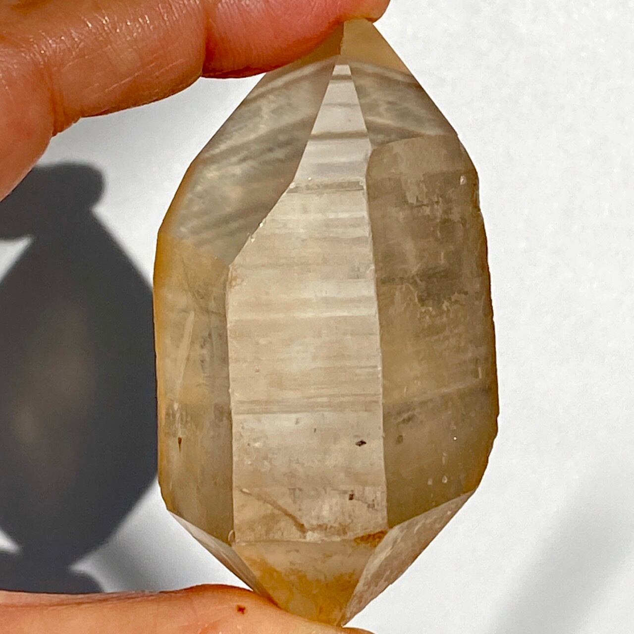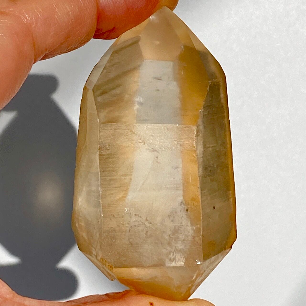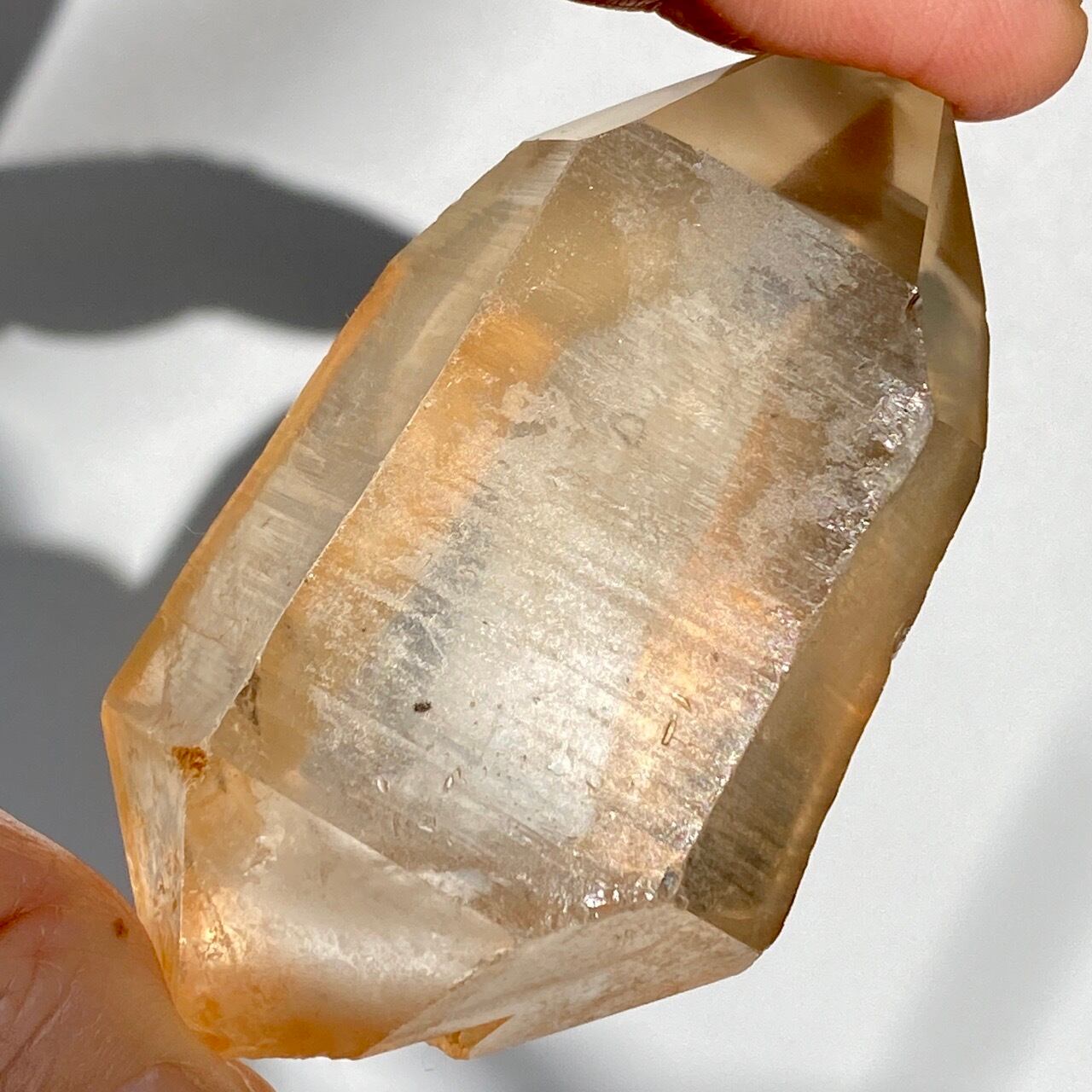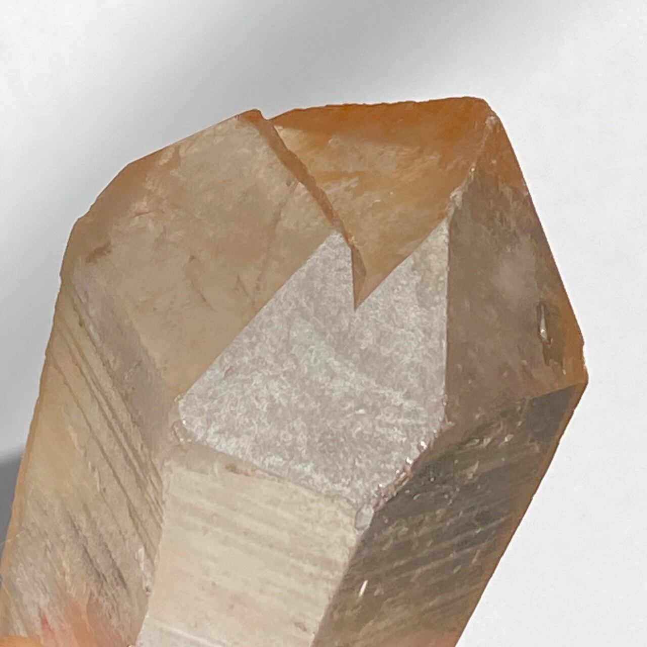 この子はコロッとした可愛い形状とダブルターミネーティッド(両剣)の片方に段差がある(そこに指を収めるのも良き♡)ところです。また太陽光にクリスタルを透かした際の神々しさと若干ゴールドがかったどこまでも優しい橙色味が非常に美しいです。