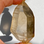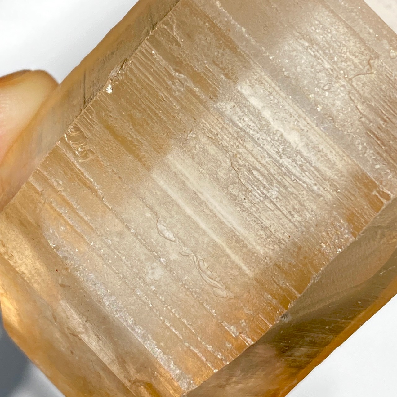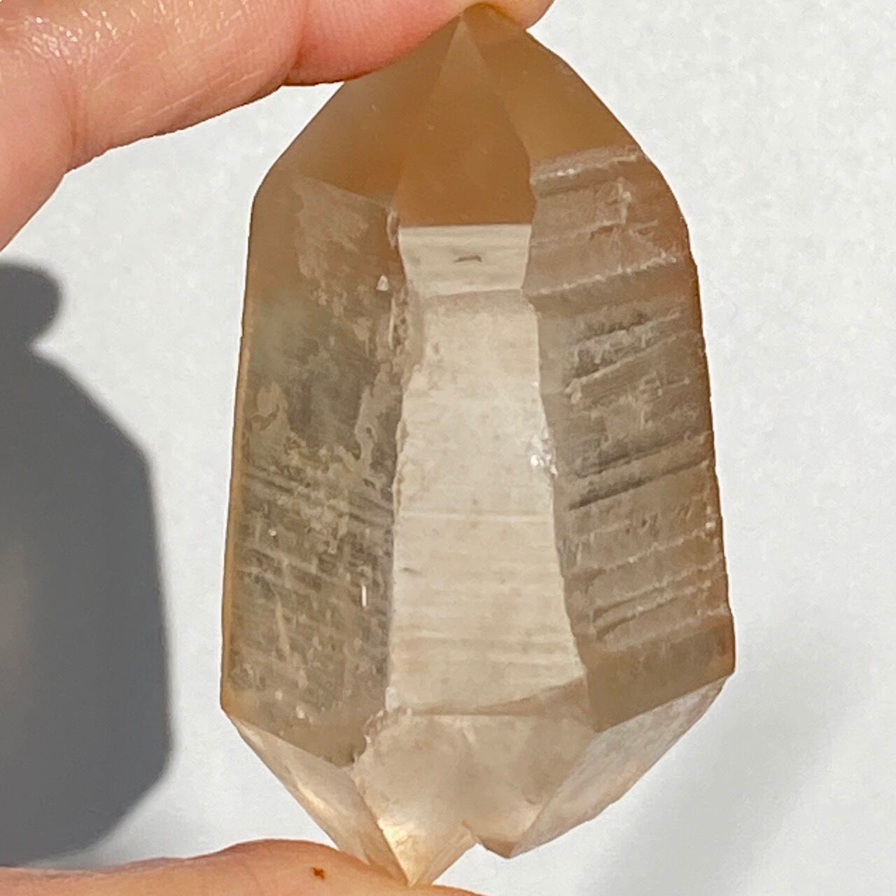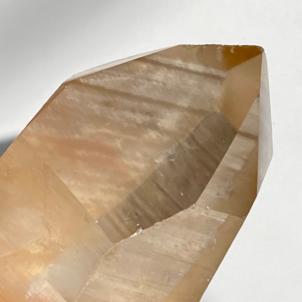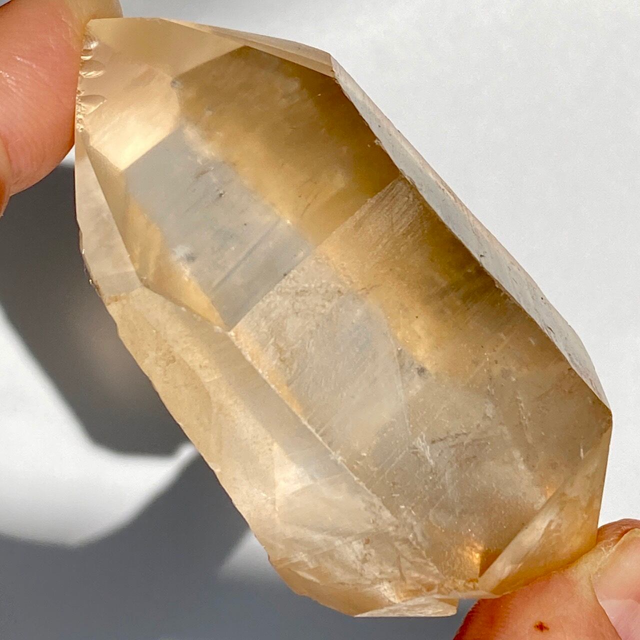 この子はコロッとした可愛い形状とダブルターミネーティッド(両剣)の片方に段差がある(そこに指を収めるのも良き♡)ところです。また太陽光にクリスタルを透かした際の神々しさと若干ゴールドがかったどこまでも優しい橙色味が非常に美しいです。