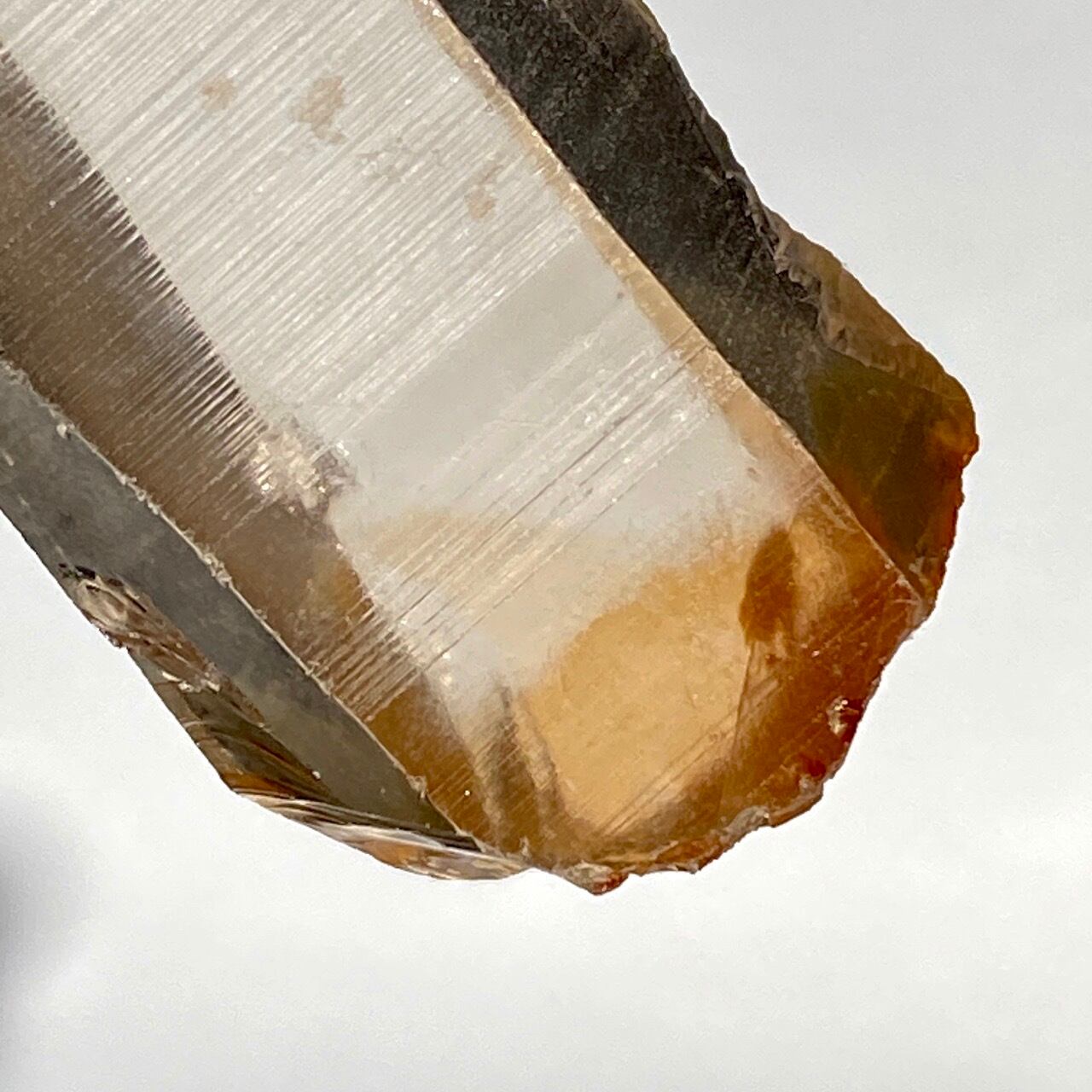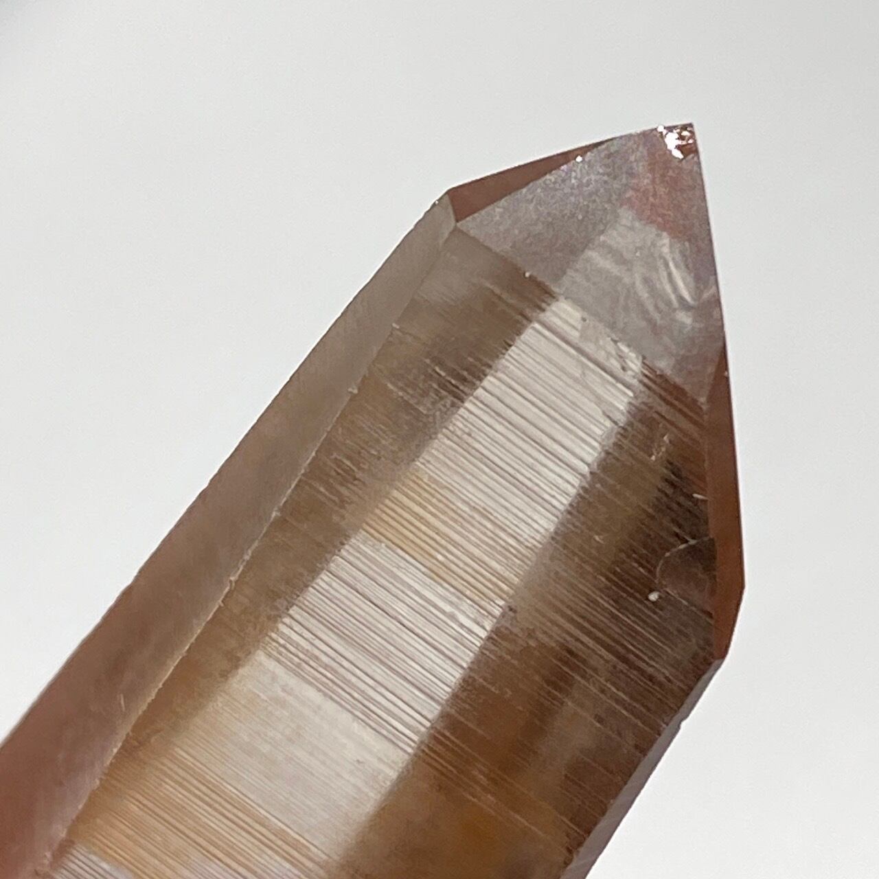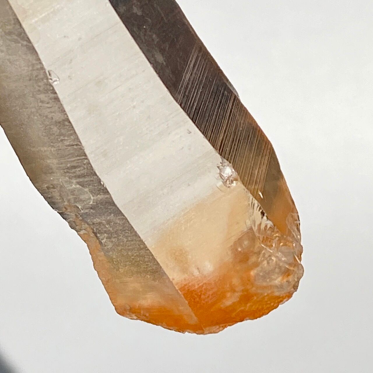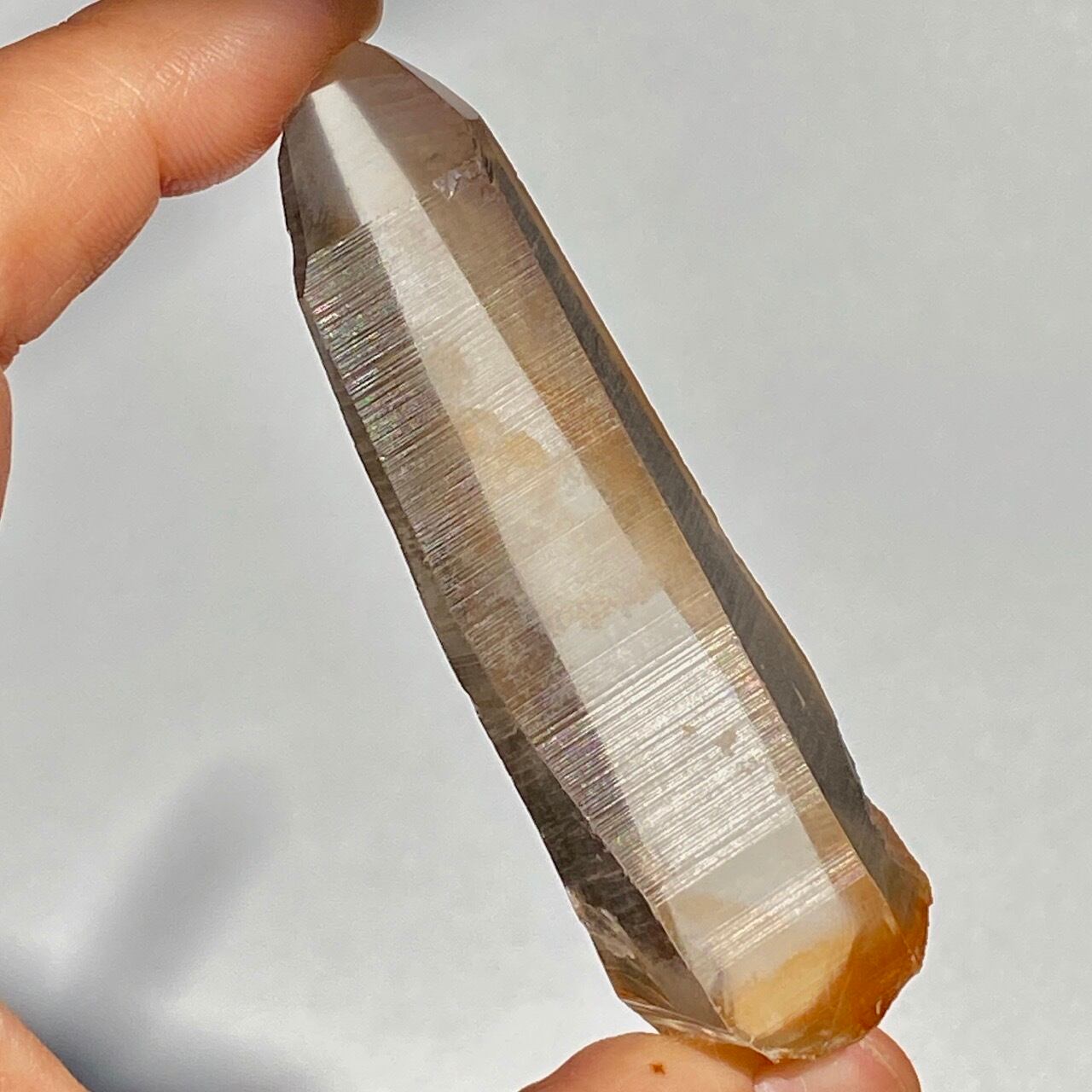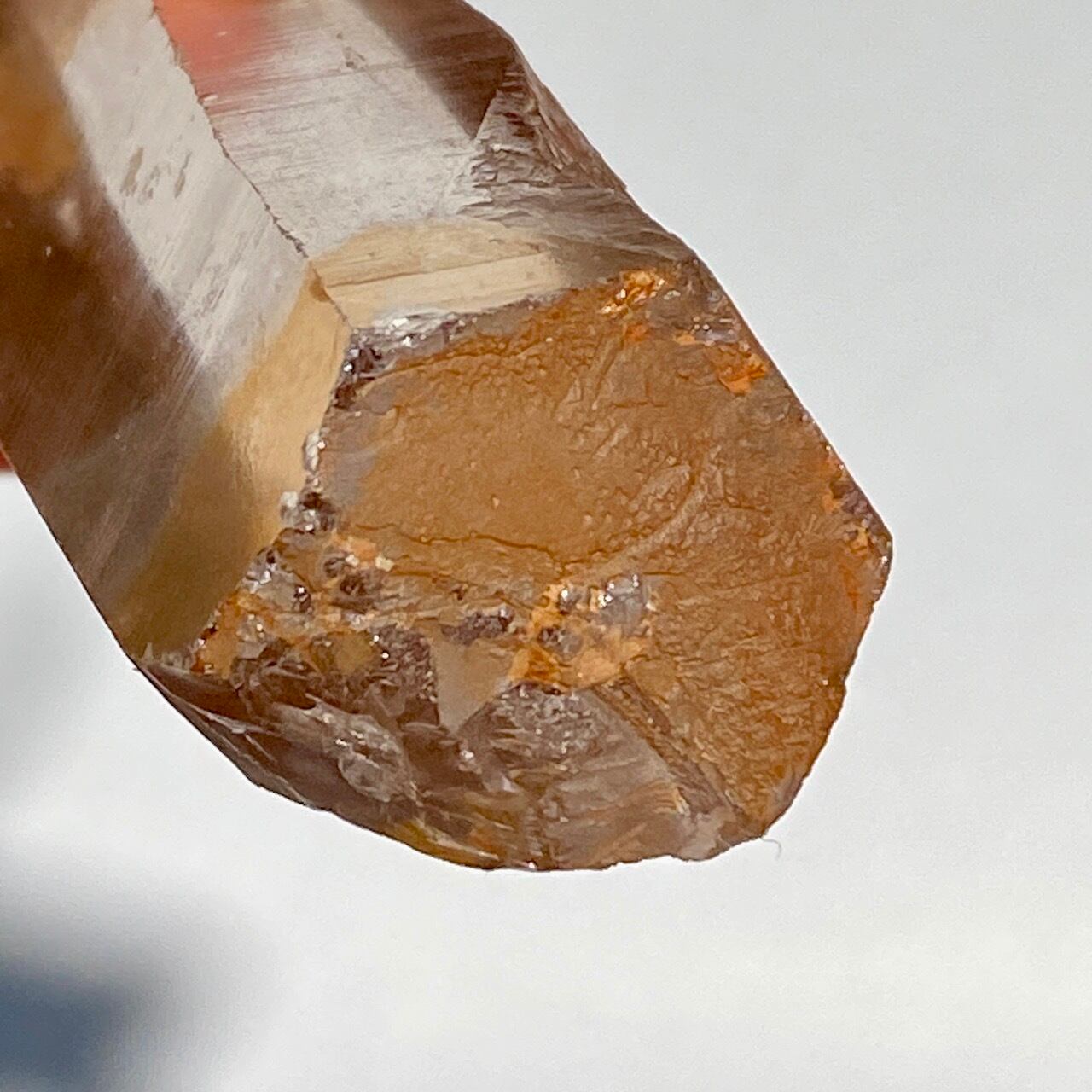 非加熱のスモーキークォーツで、アイスコーヒーを究極に薄めたような、非常に柔らかい色の子です。しかも透明度も高く、表面にヘマタイト成分が付着し、それが酸化してところどころオレンジ色になっていて、日に透かすと夕焼けの(朝焼け)のようなニュアンスが浮かぶ不思議な魅力を秘めた子です。