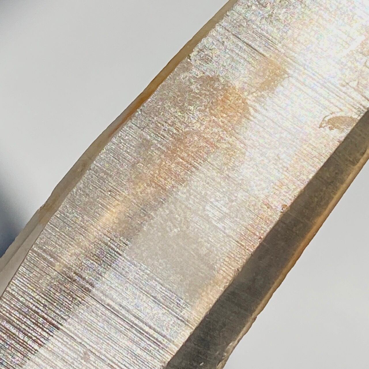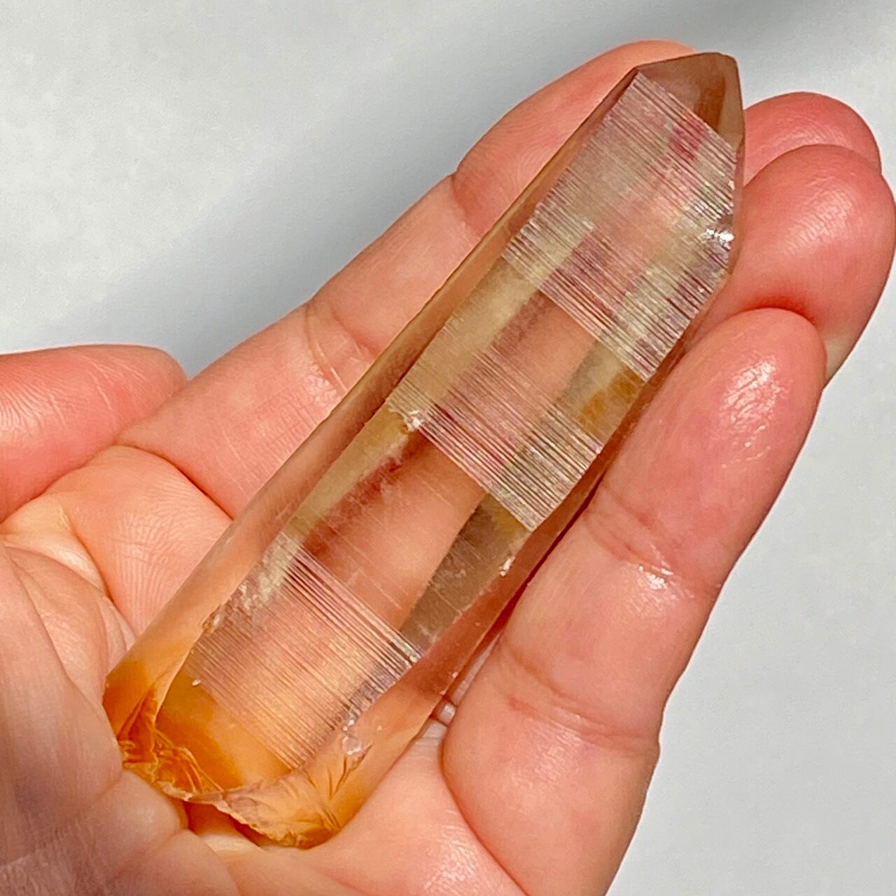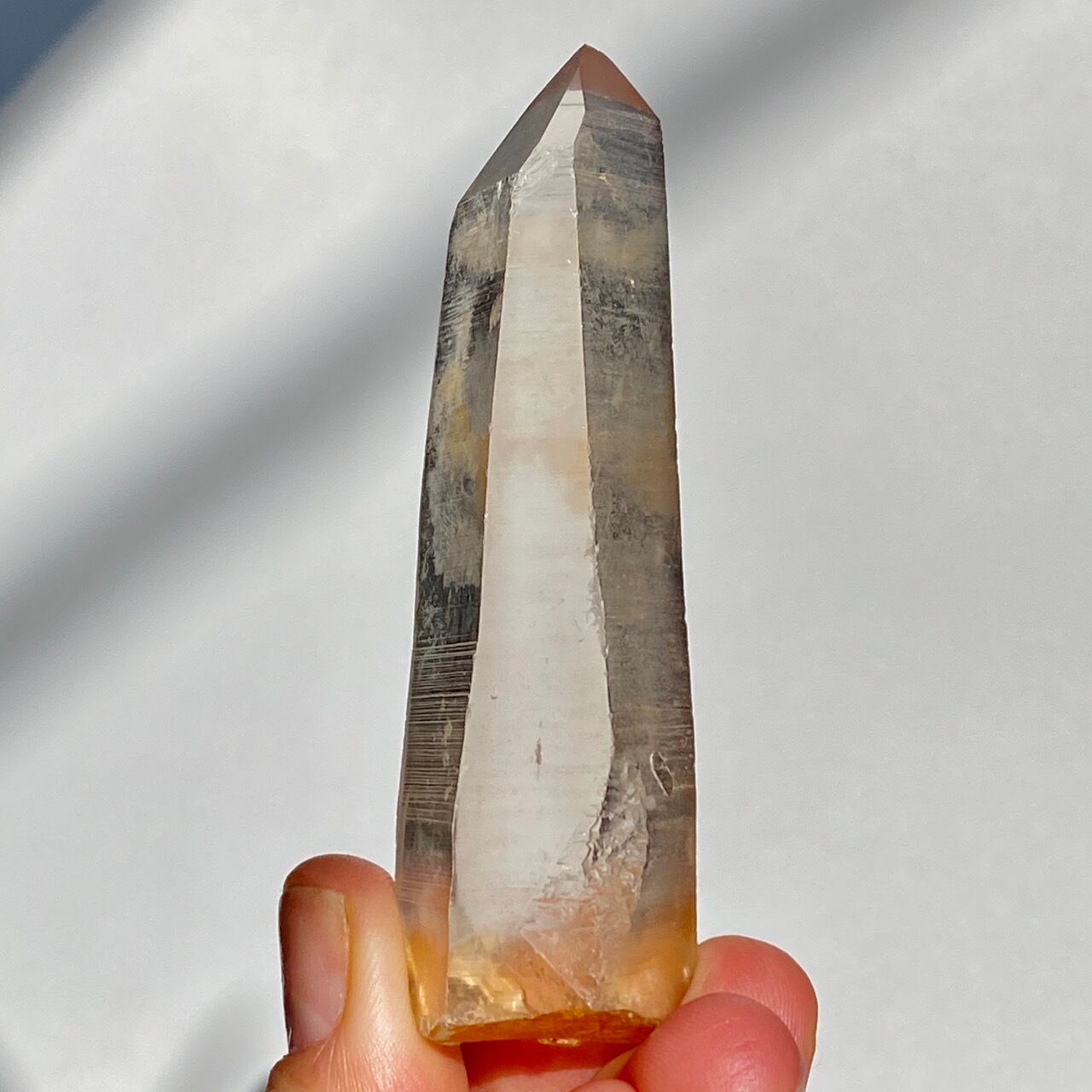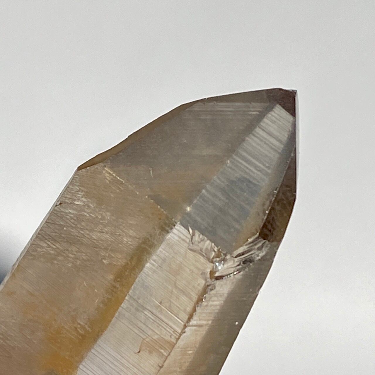 非加熱のスモーキークォーツで、アイスコーヒーを究極に薄めたような、非常に柔らかい色の子です。しかも透明度も高く、表面にヘマタイト成分が付着し、それが酸化してところどころオレンジ色になっていて、日に透かすと夕焼けの(朝焼け)のようなニュアンスが浮かぶ不思議な魅力を秘めた子です。