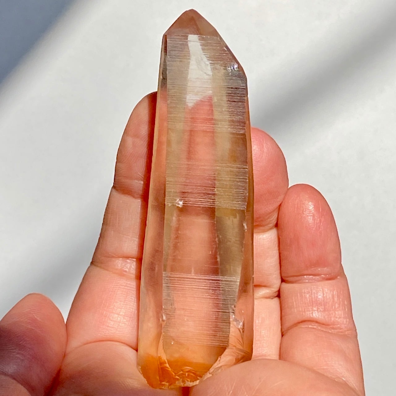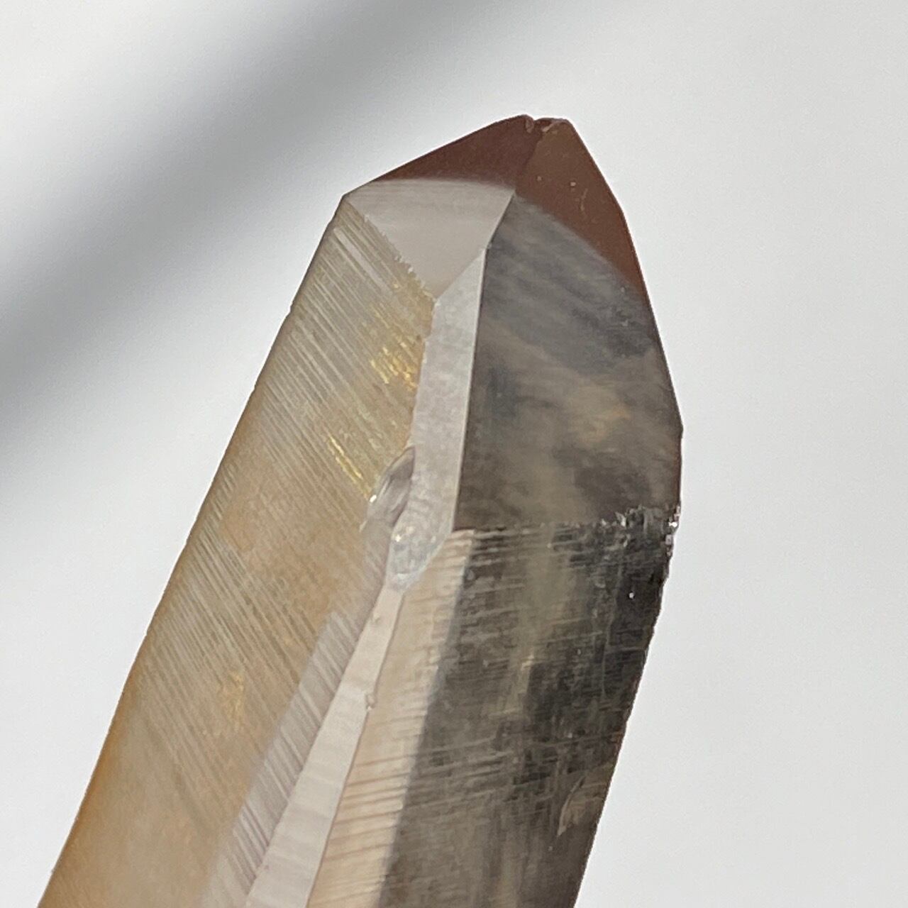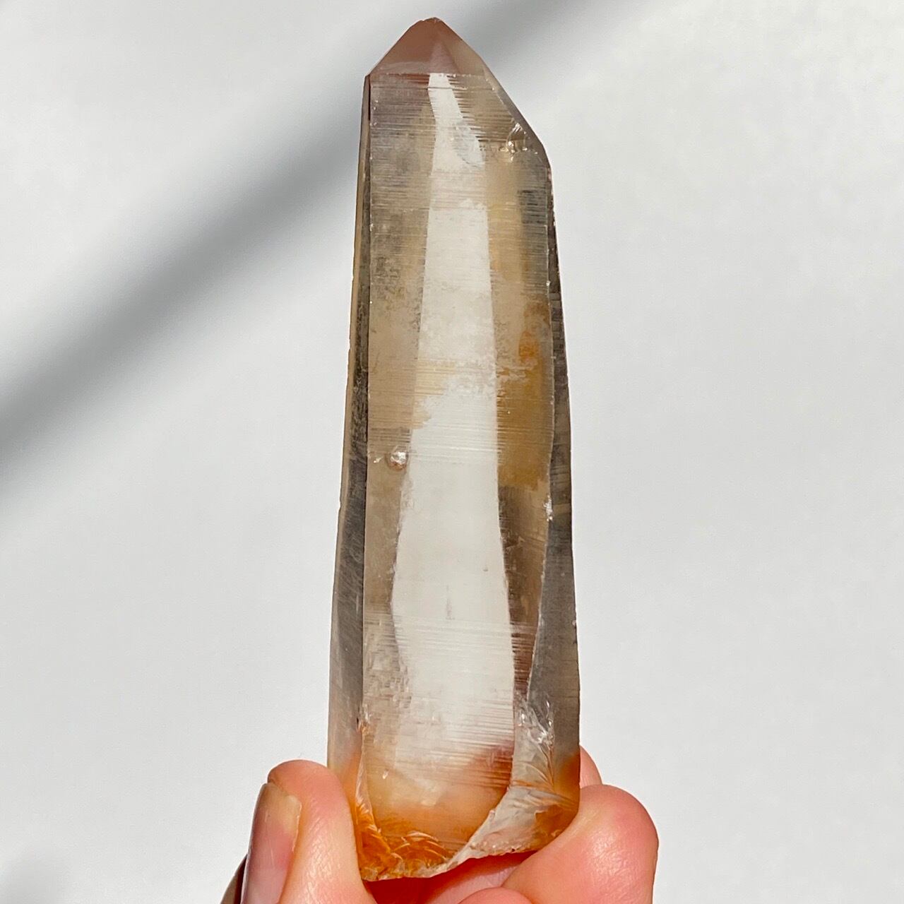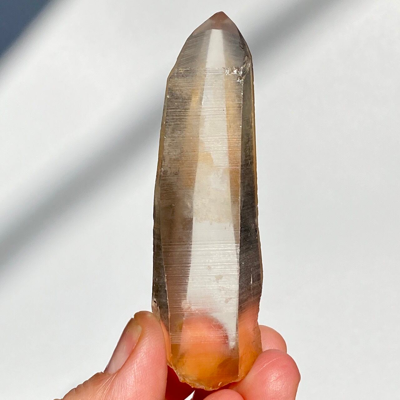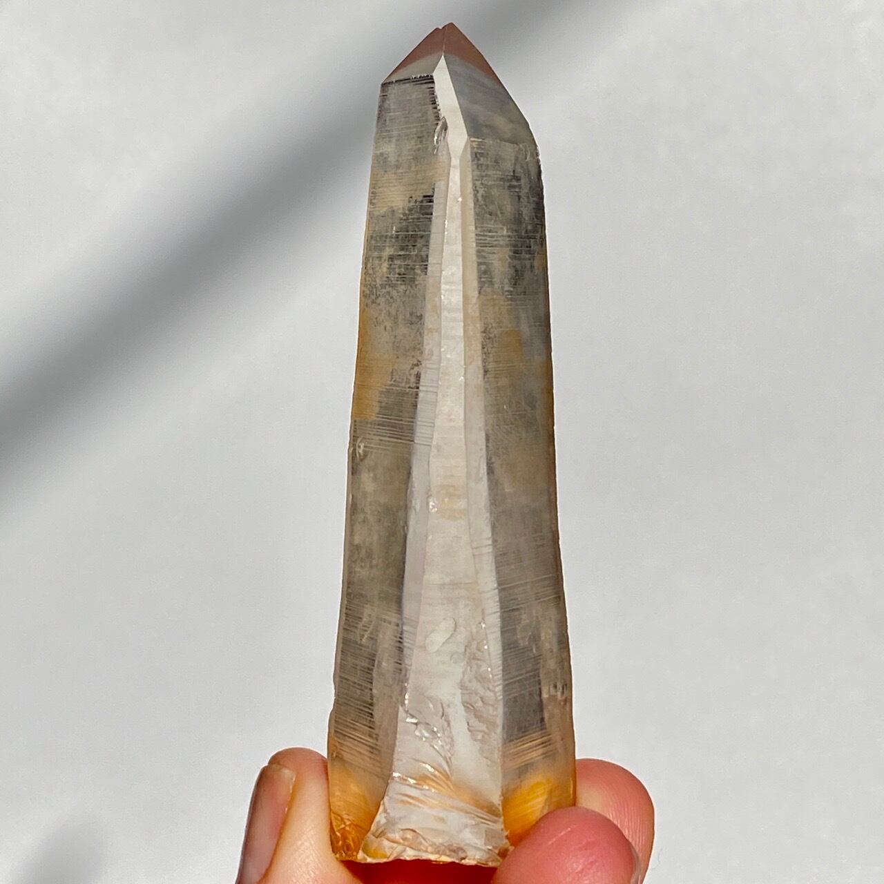 非加熱のスモーキークォーツで、アイスコーヒーを究極に薄めたような、非常に柔らかい色の子です。しかも透明度も高く、表面にヘマタイト成分が付着し、それが酸化してところどころオレンジ色になっていて、日に透かすと夕焼けの(朝焼け)のようなニュアンスが浮かぶ不思議な魅力を秘めた子です。