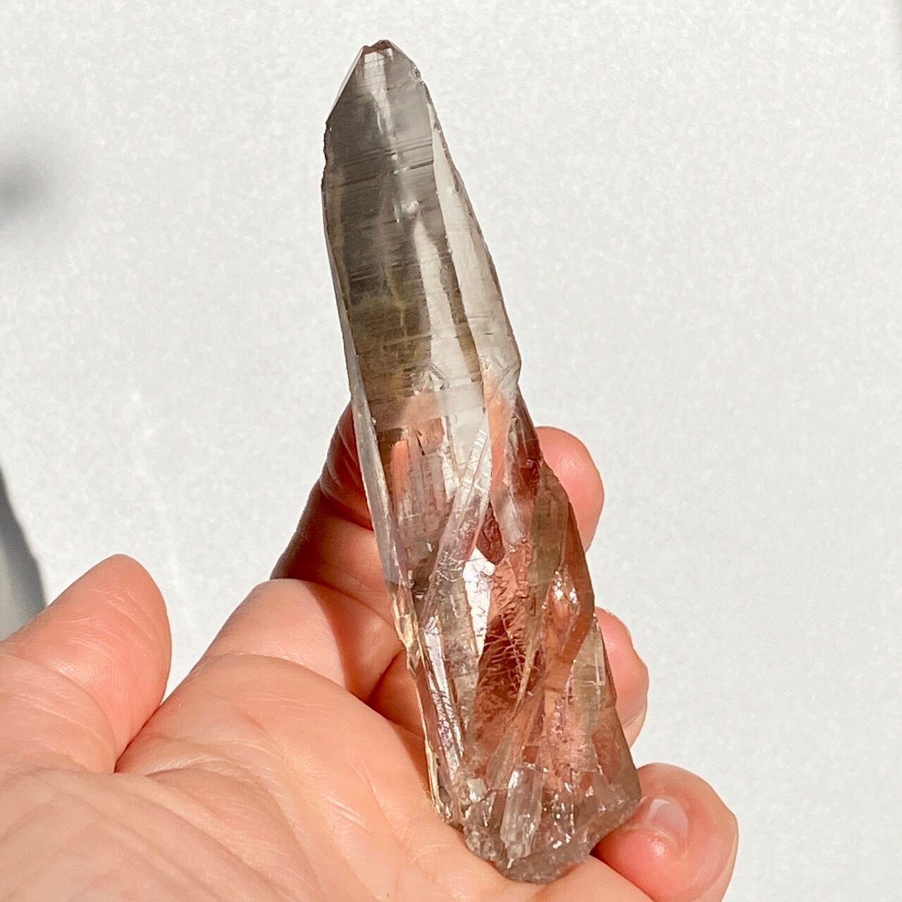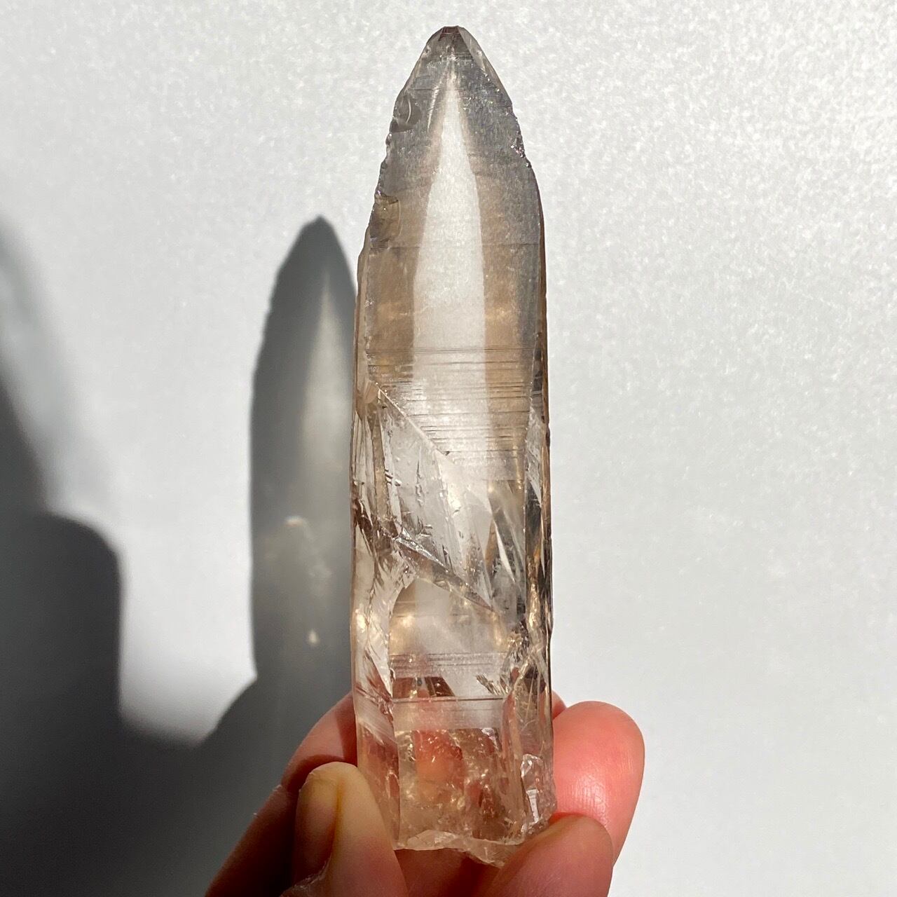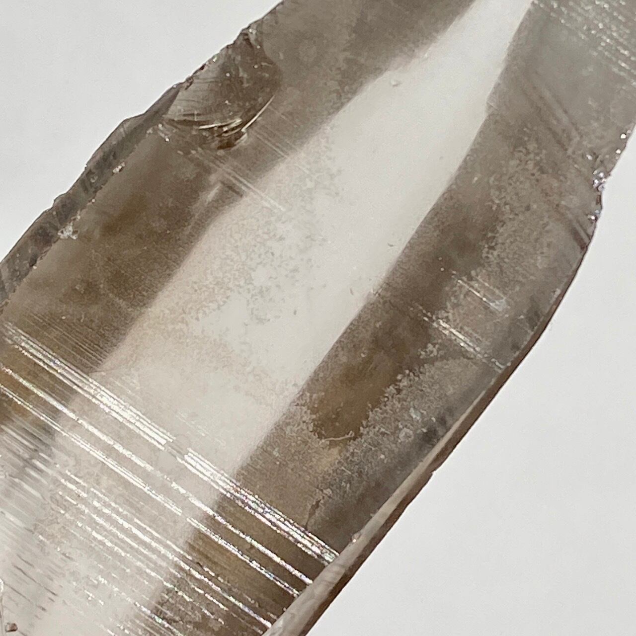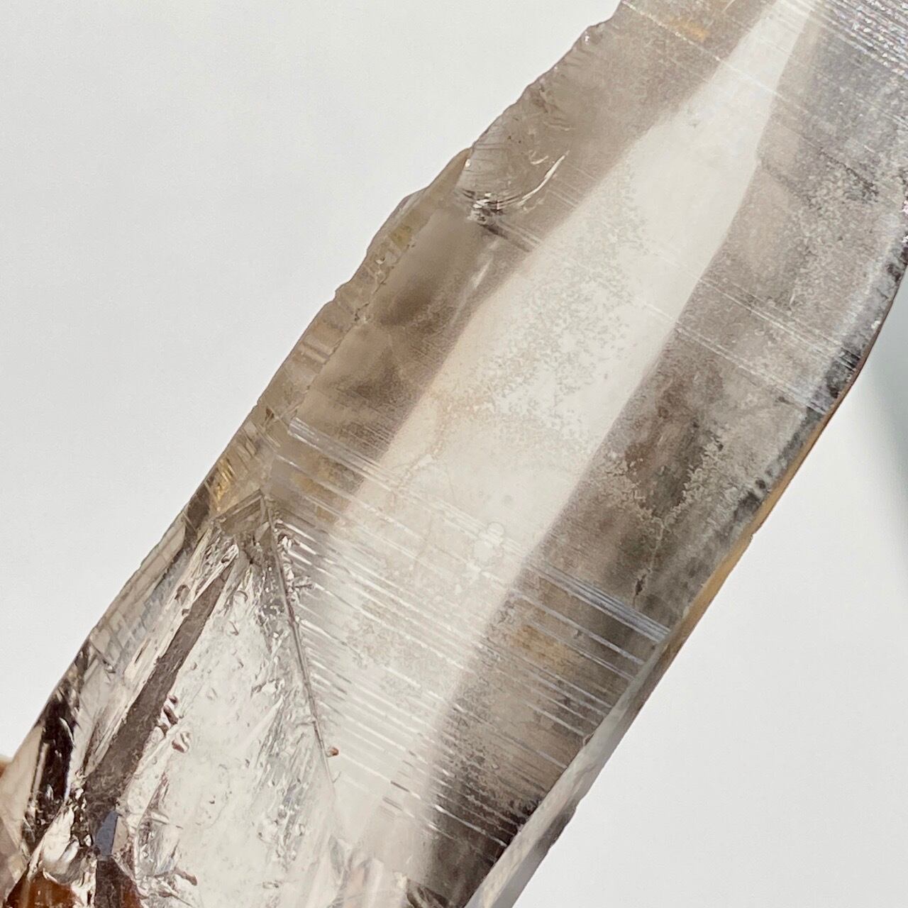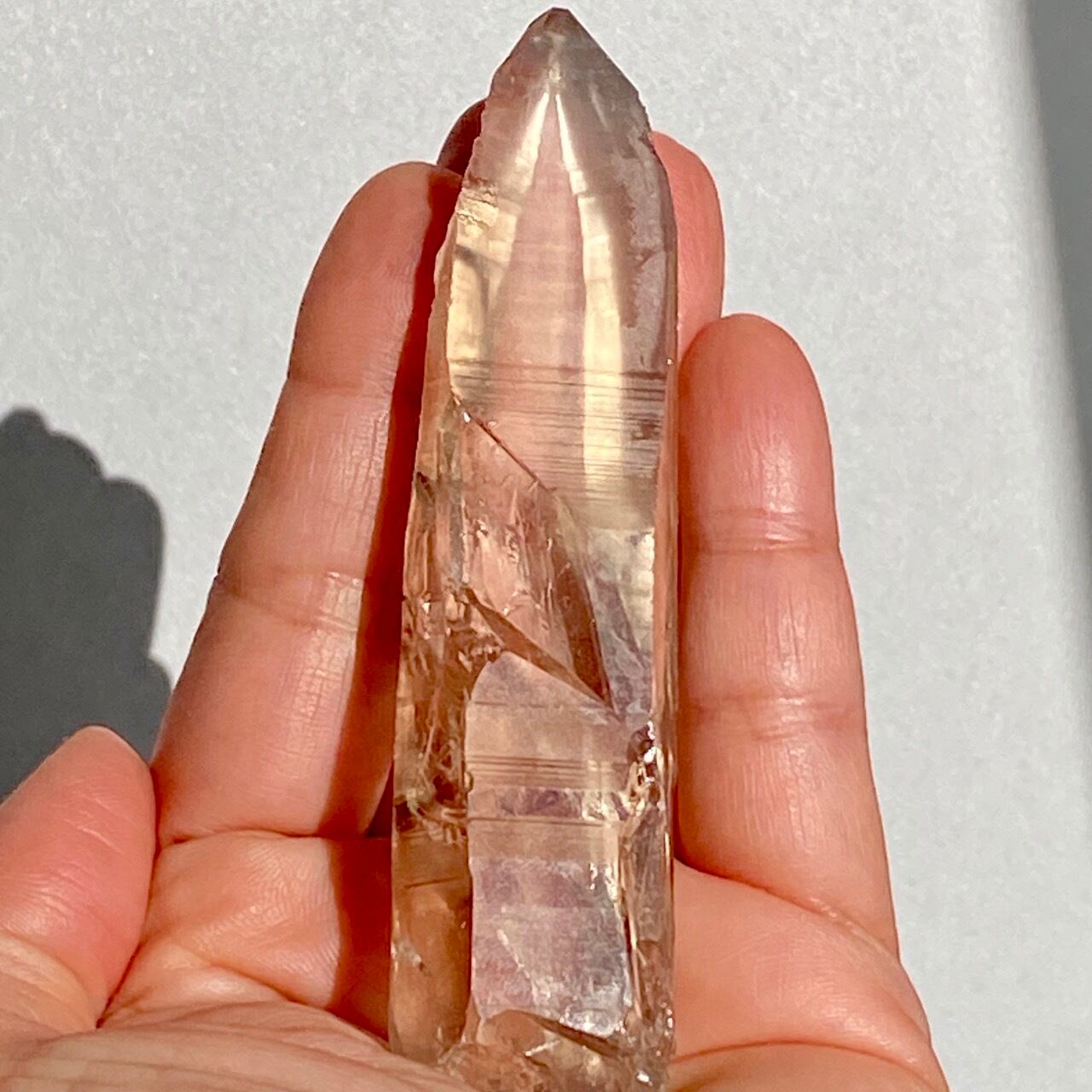この子は一目惚れでした。このどこまでも優しい色味と素晴らしい透明感、そして特筆すべきは、他のポイント達が付着していたであろう箇所(剥離痕)が畝りを生み出していてまるでスクリューのような躍動感があるところです。剥離痕に親指を合わせて握ってみたり、くっきりと入ったレムリアンリッジ(横に入った条線)をなぞったりして、クリスタルから受け取る感覚を味わって下さい。
