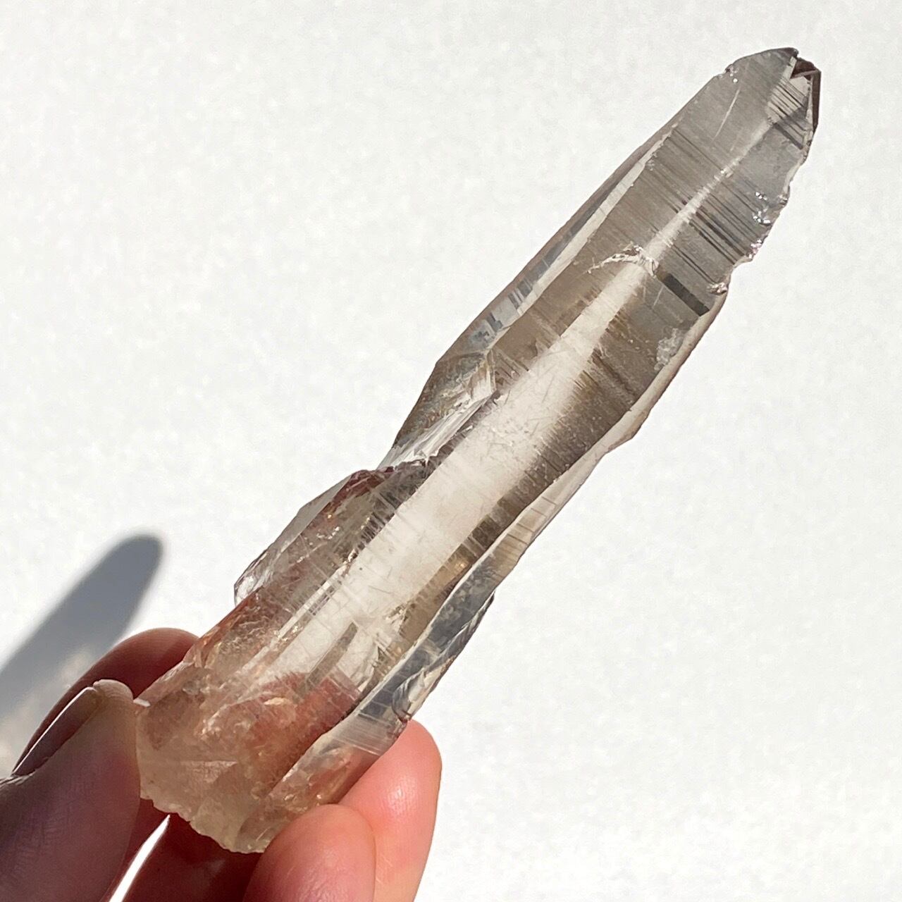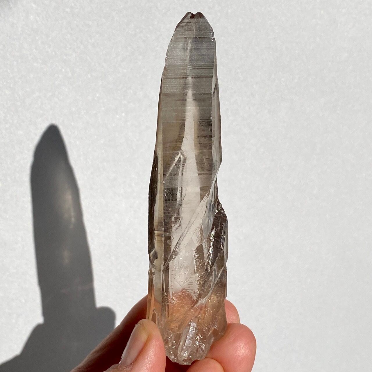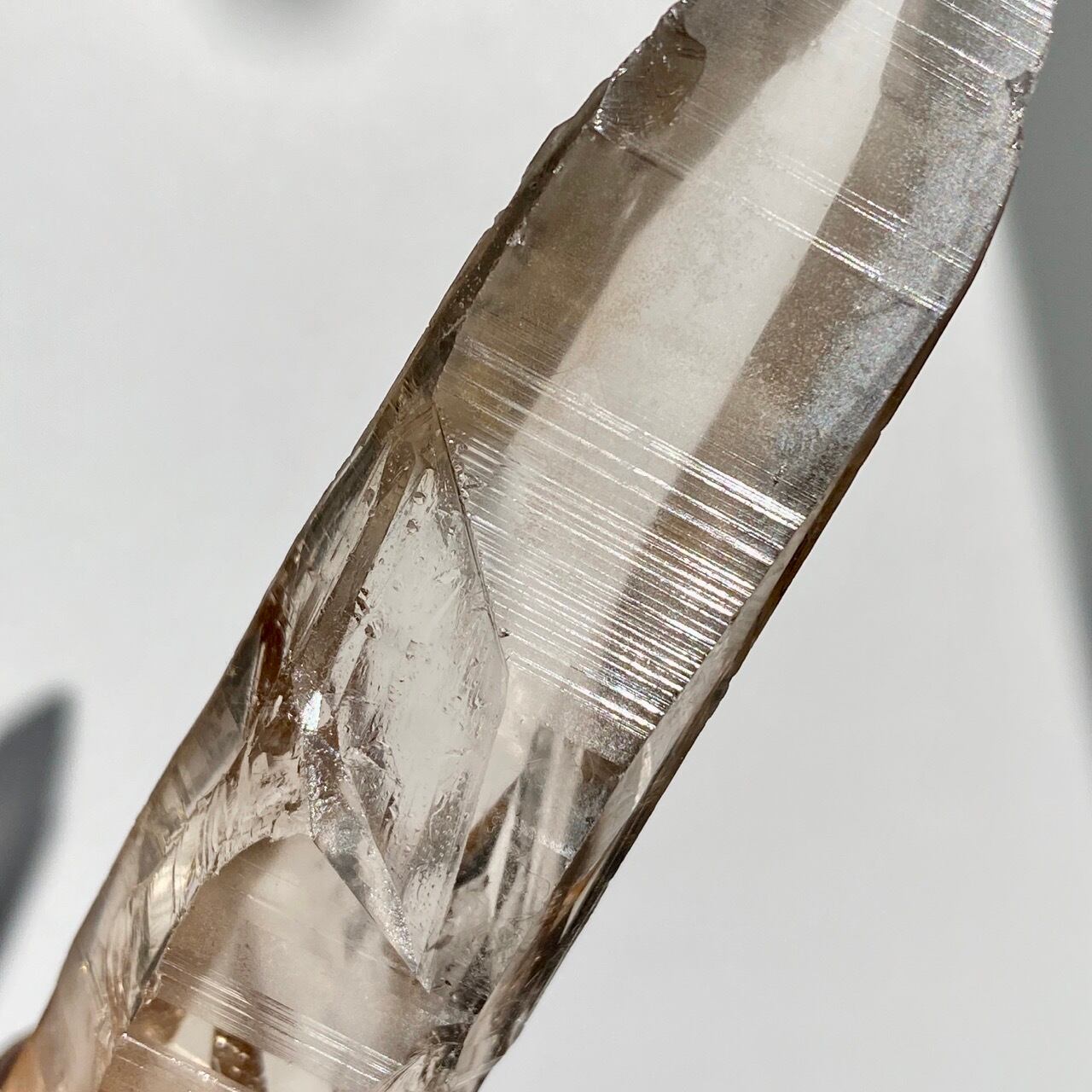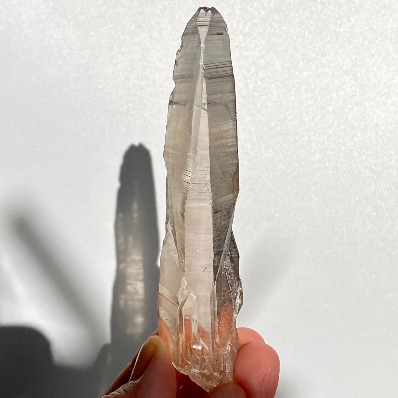 この子は一目惚れでした。このどこまでも優しい色味と素晴らしい透明感、そして特筆すべきは、他のポイント達が付着していたであろう箇所(剥離痕)が畝りを生み出していてまるでスクリューのような躍動感があるところです。剥離痕に親指を合わせて握ってみたり、くっきりと入ったレムリアンリッジ(横に入った条線)をなぞったりして、クリスタルから受け取る感覚を味わって下さい。