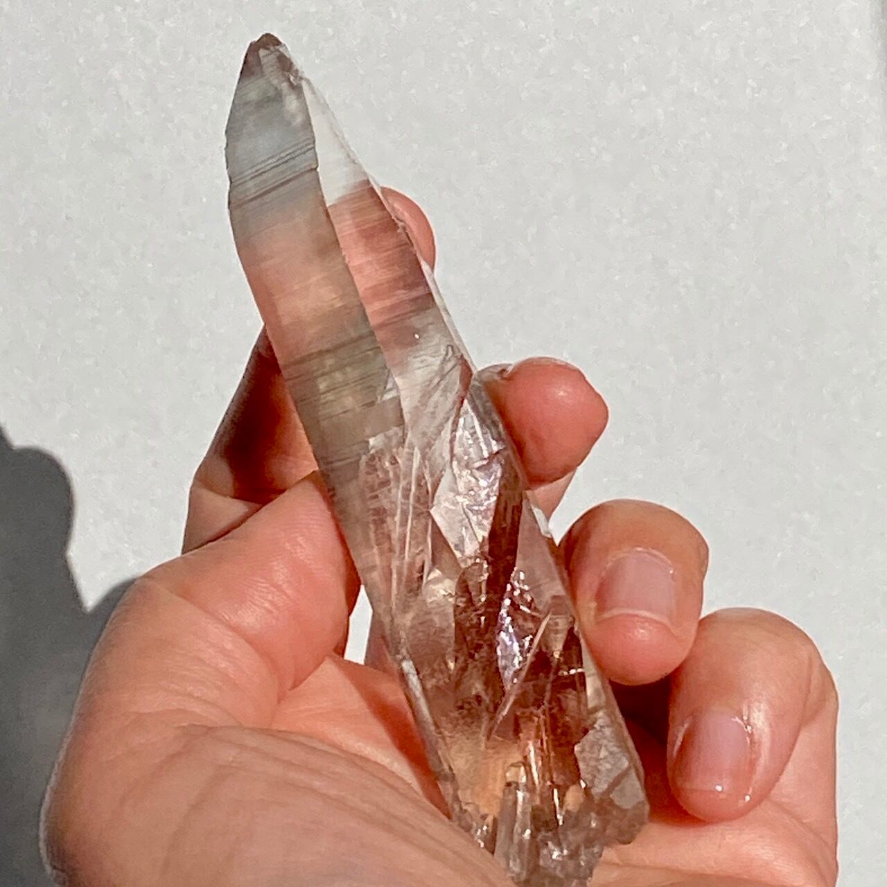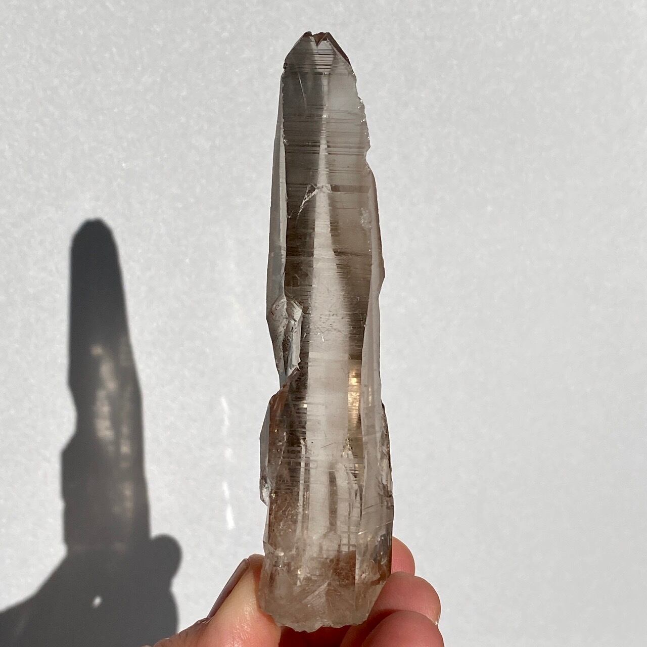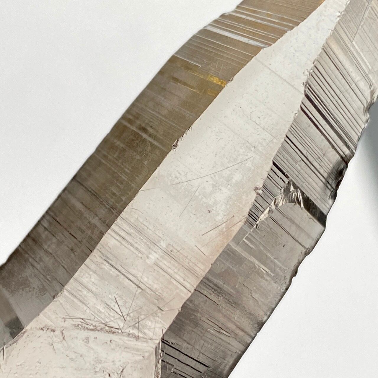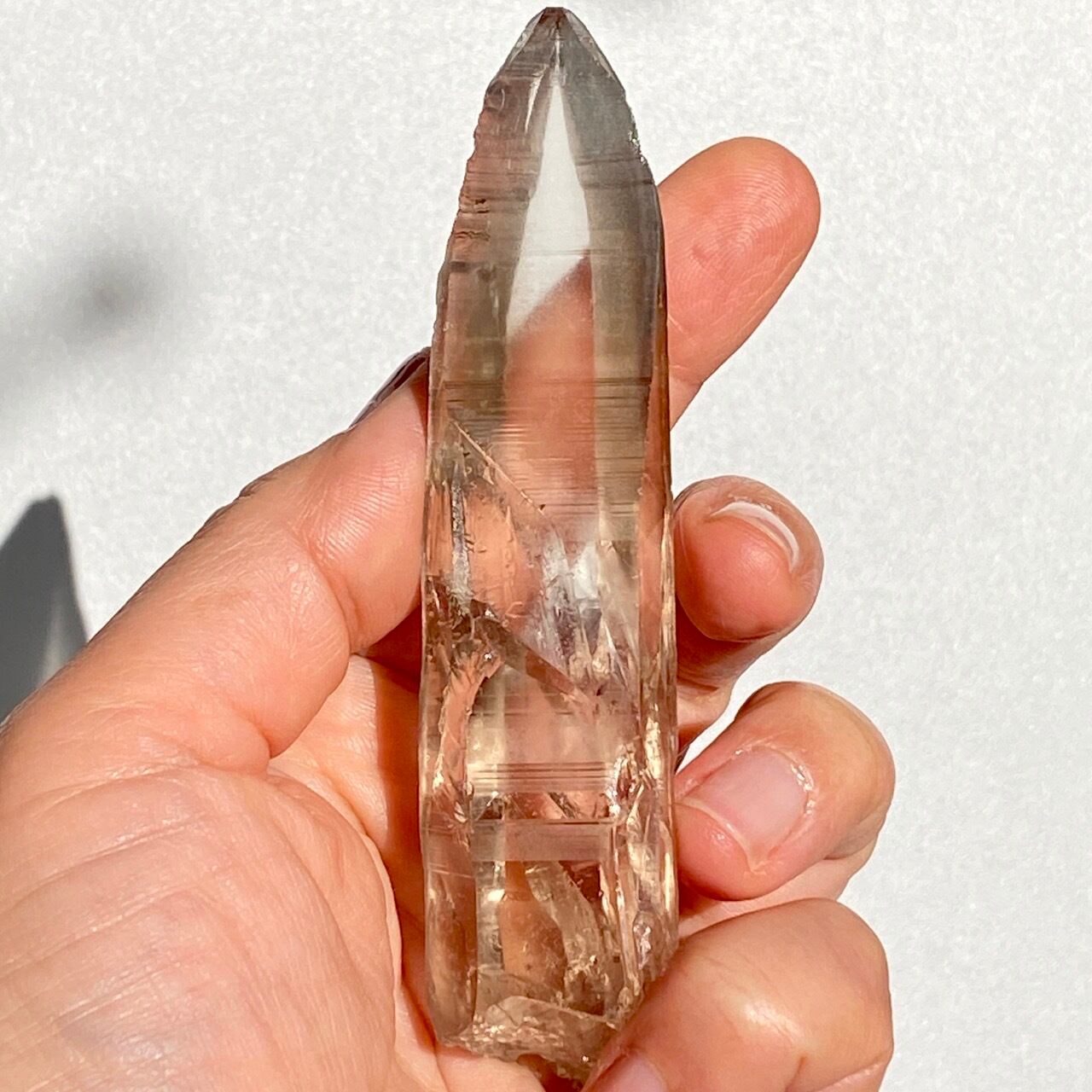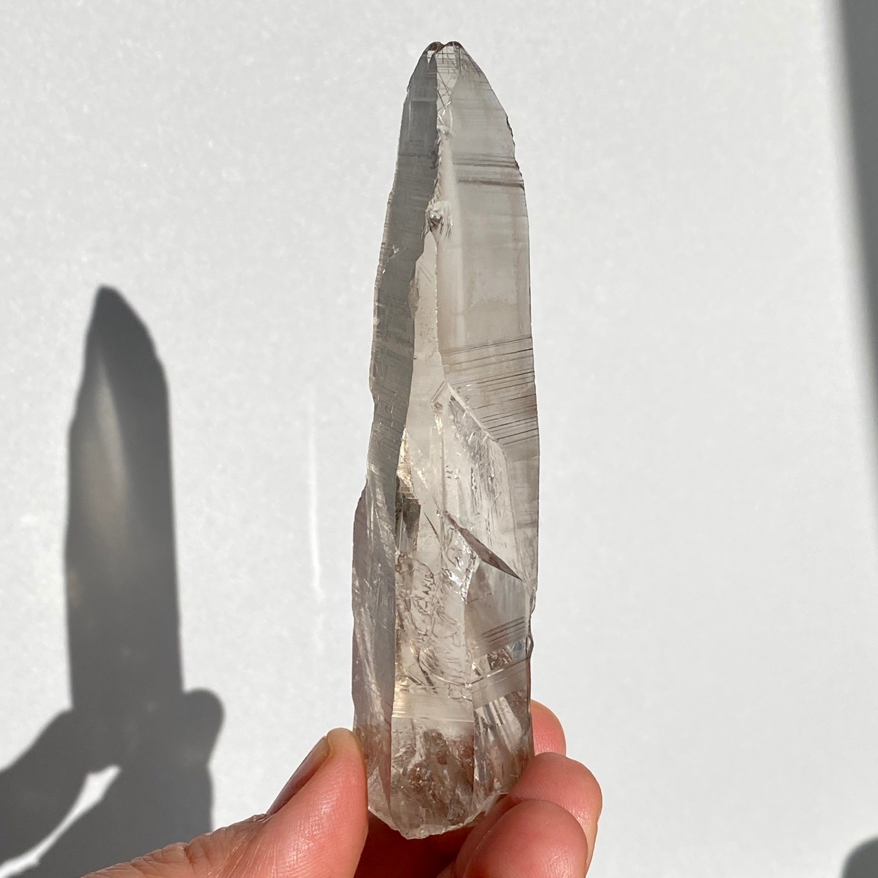 この子は一目惚れでした。このどこまでも優しい色味と素晴らしい透明感、そして特筆すべきは、他のポイント達が付着していたであろう箇所(剥離痕)が畝りを生み出していてまるでスクリューのような躍動感があるところです。剥離痕に親指を合わせて握ってみたり、くっきりと入ったレムリアンリッジ(横に入った条線)をなぞったりして、クリスタルから受け取る感覚を味わって下さい。