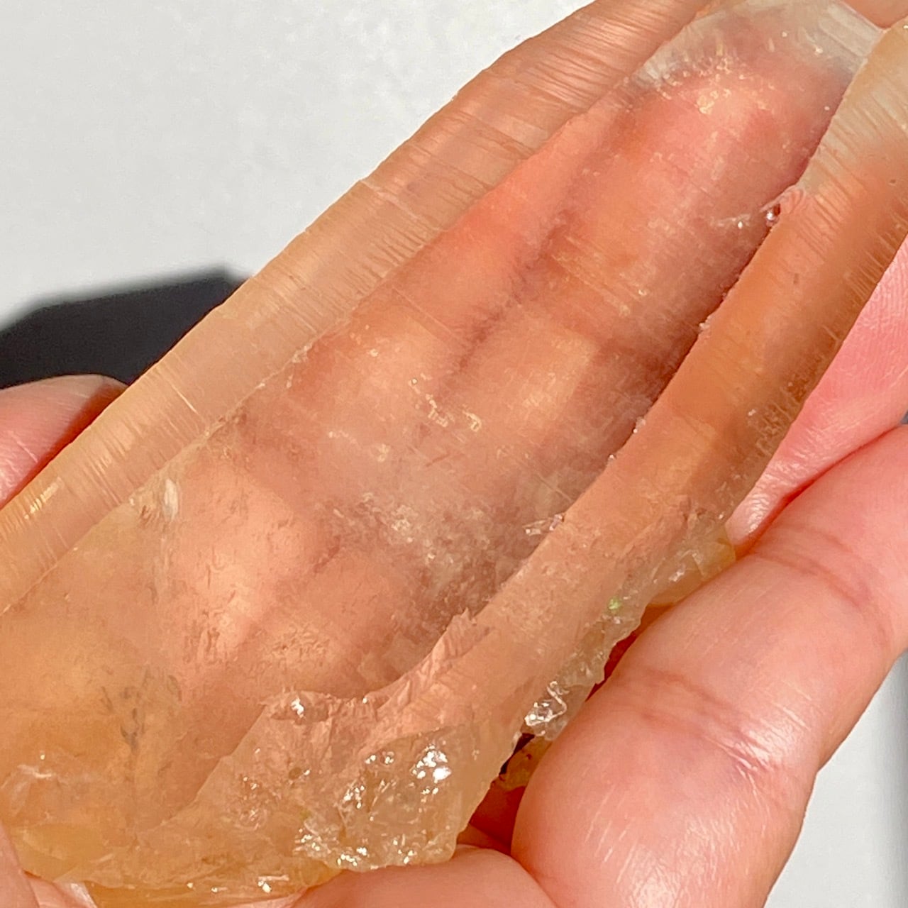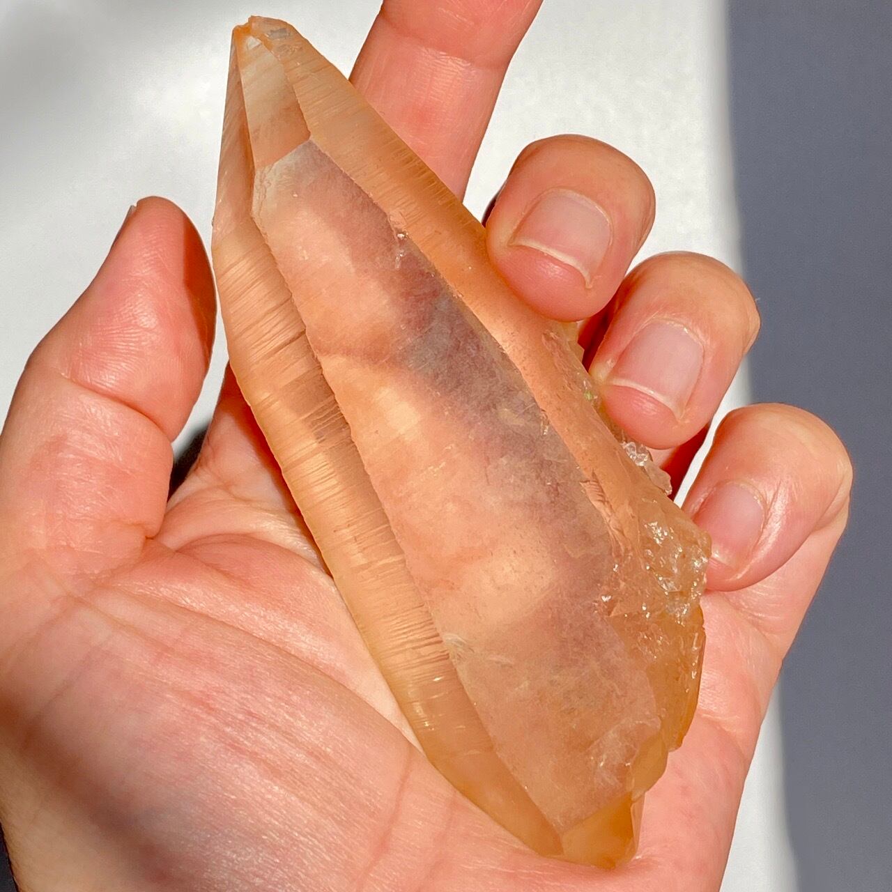 バイブラントなタンジェリンクォーツ(表面にヘマタイト成分が付着し、それが酸化した水晶)も素敵ですが、その数あるカラーバリエーションの中からあえて光に透かすと神聖さを帯びた、若干ゴールドがかった非常に優しい橙色のレムリアンシードに心を打たれ、今回幾つか選定しました。