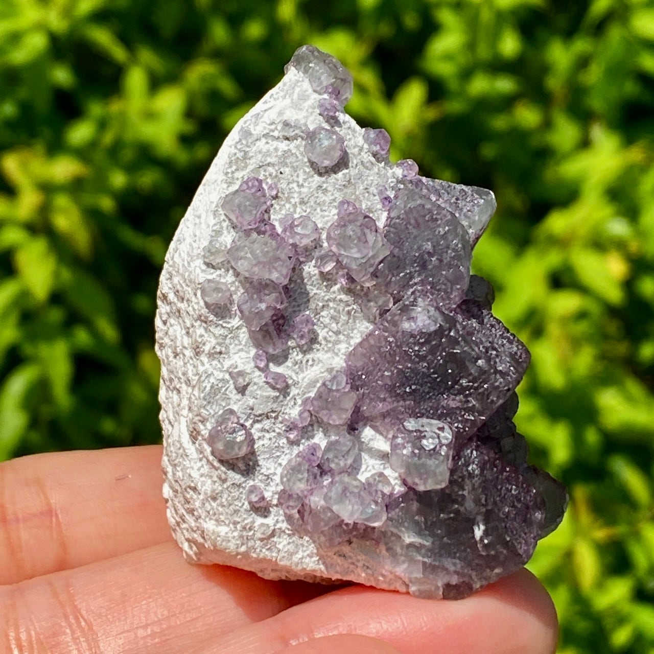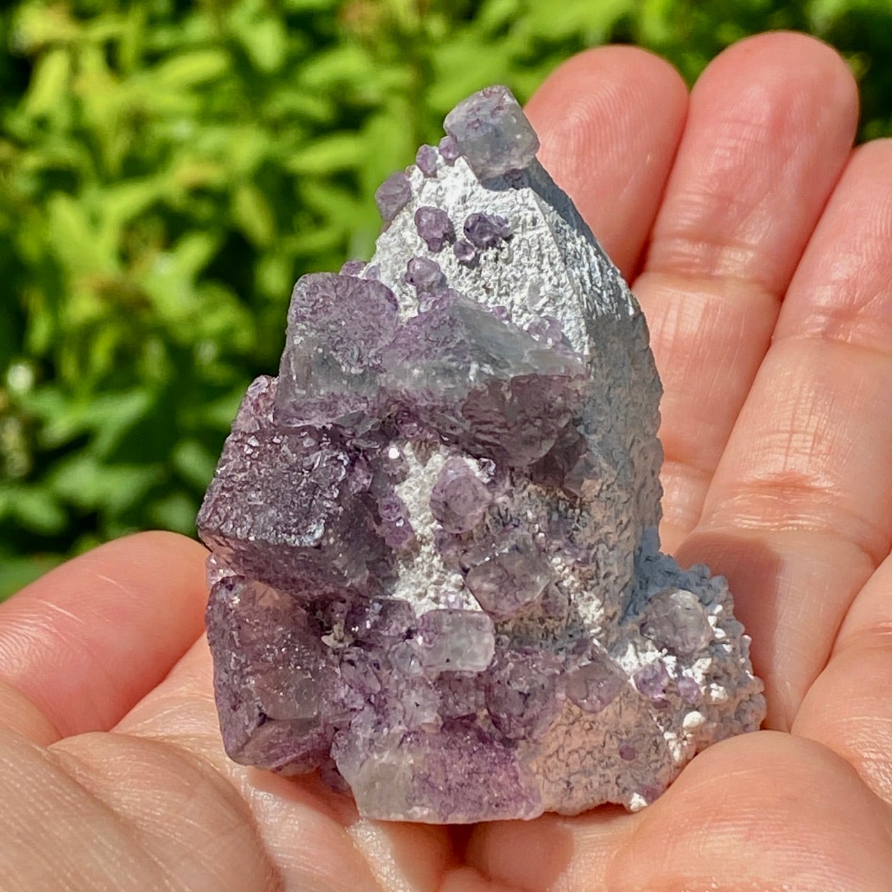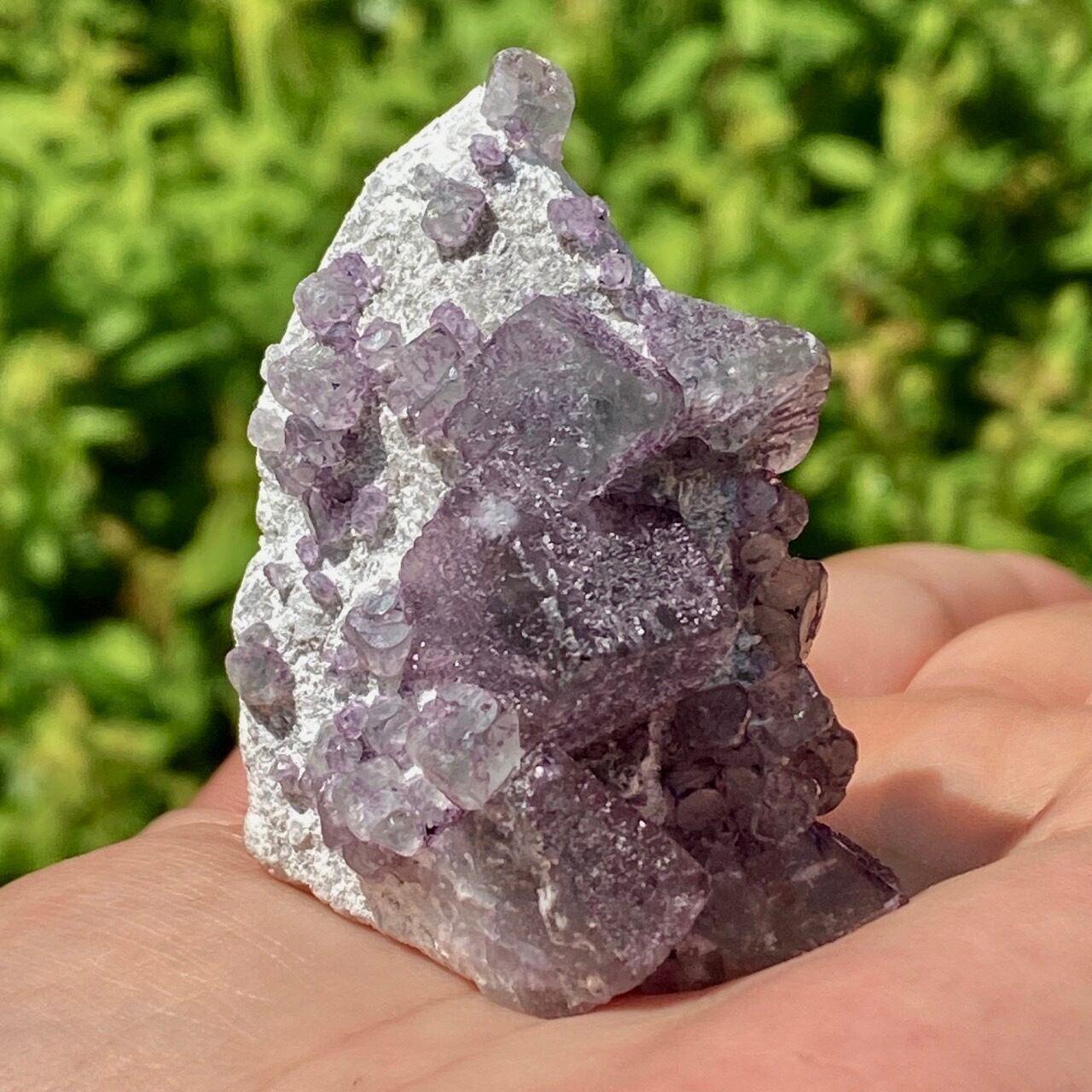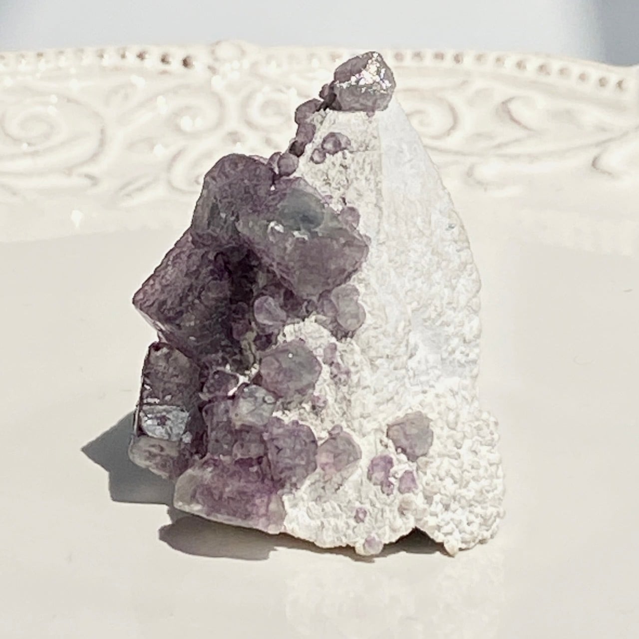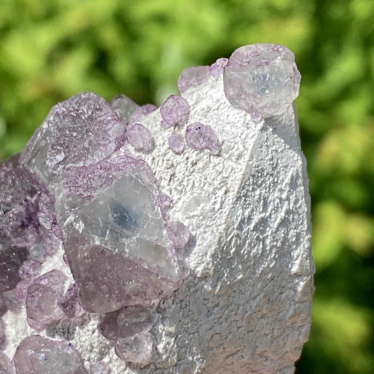 画像ではフローライトは全体的にパープル系に見えがちですが、パープルと淡いグリーンから成ります。太陽光の元では薄く写っていますが、室内では若干濃いめに見えます。