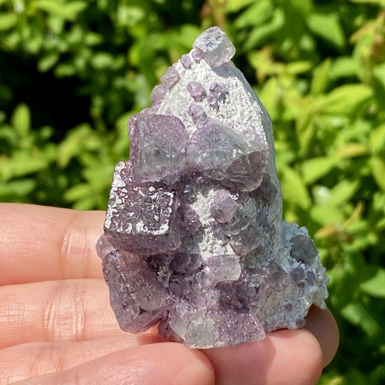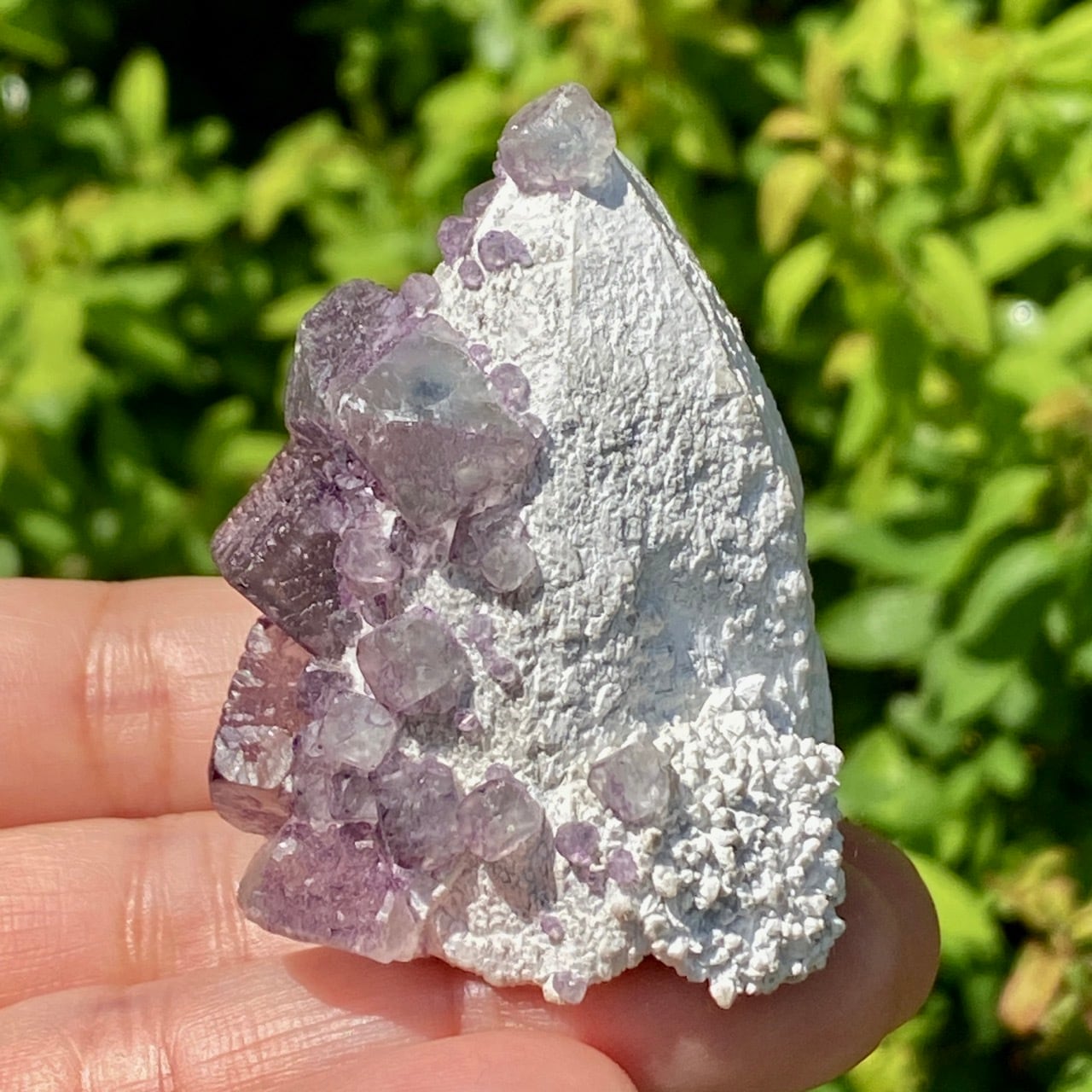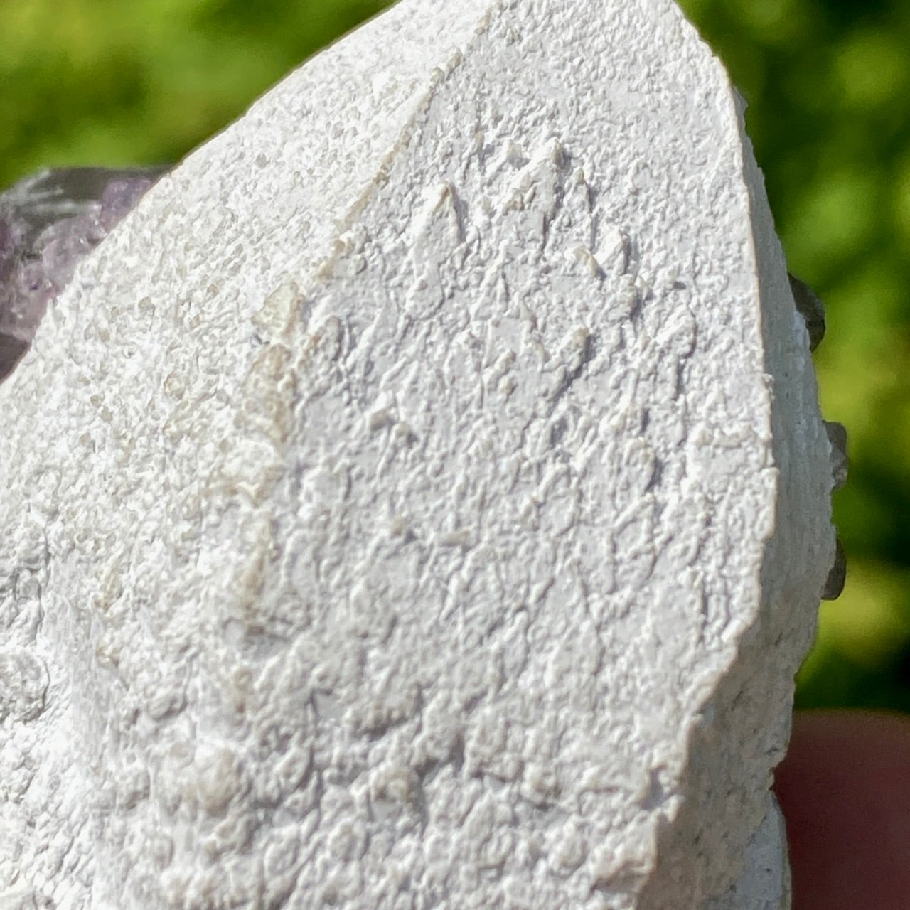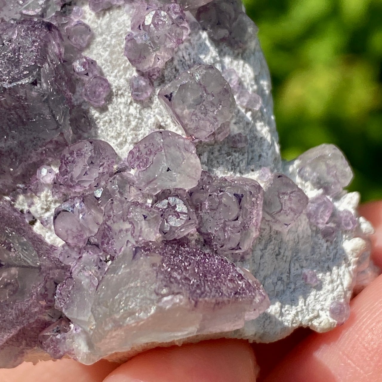 画像ではフローライトは全体的にパープル系に見えがちですが、パープルと淡いグリーンから成ります。太陽光の元では薄く写っていますが、室内では若干濃いめに見えます。