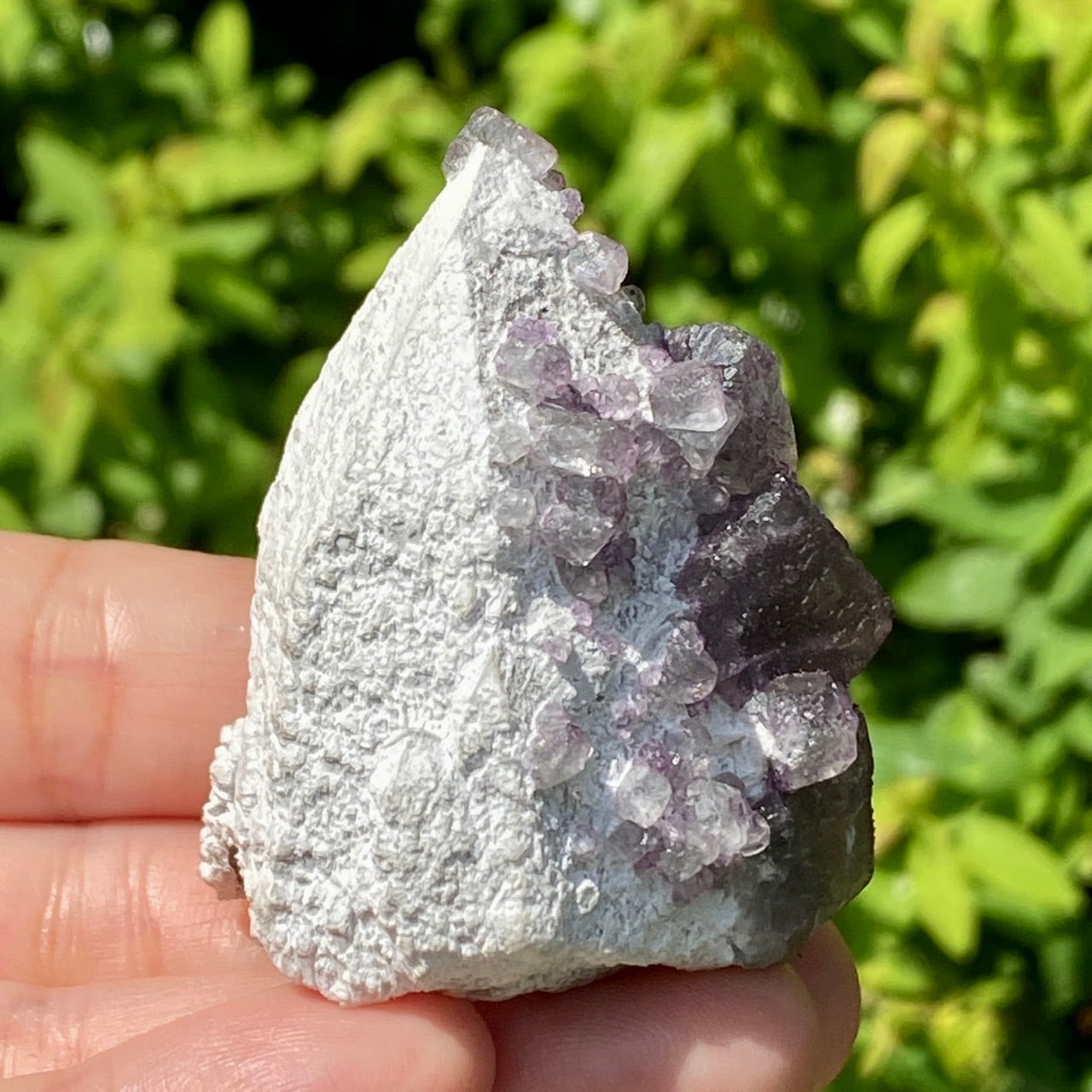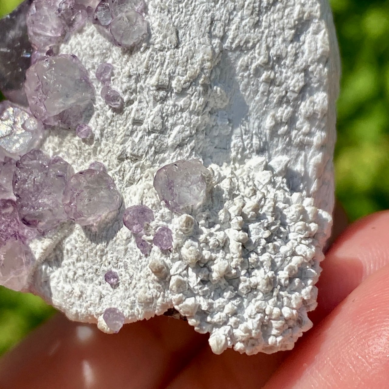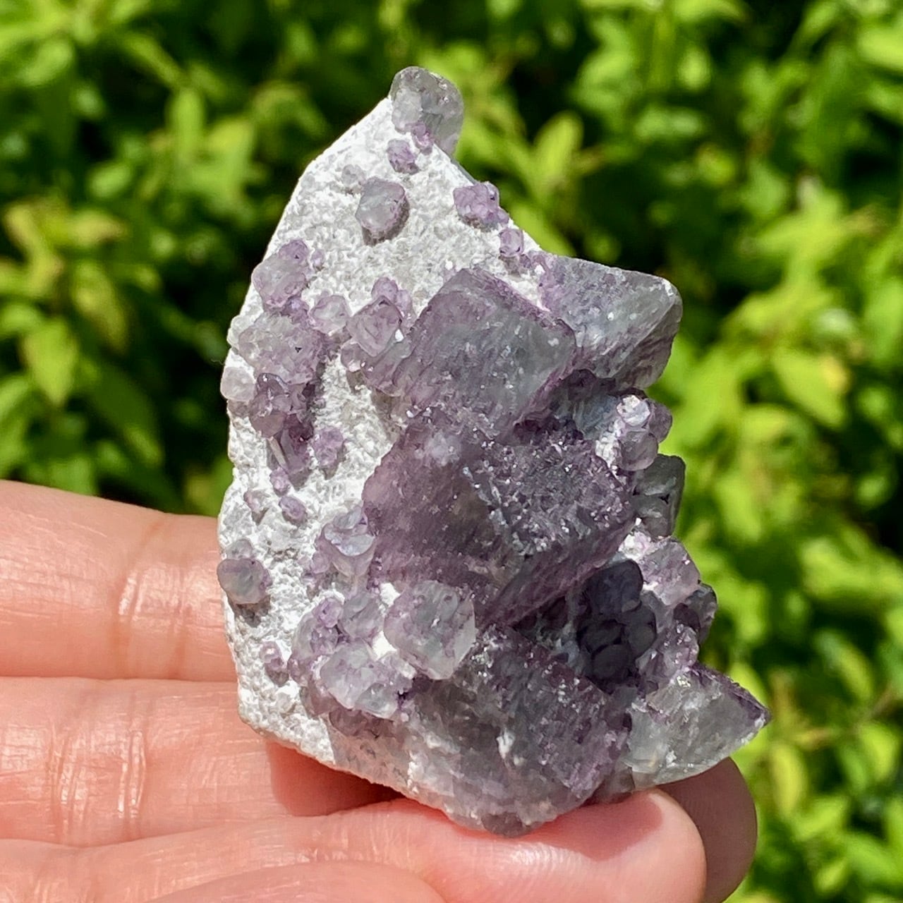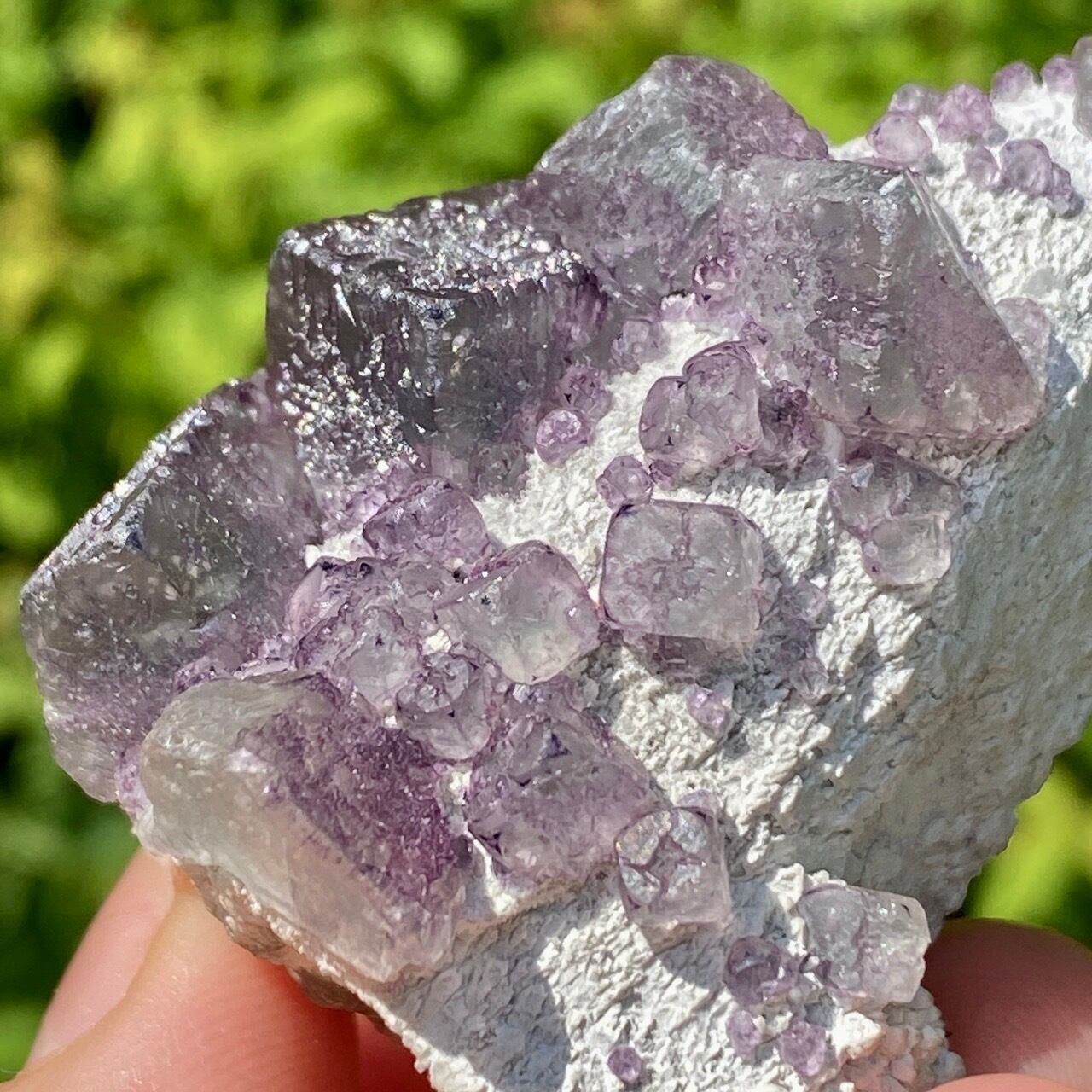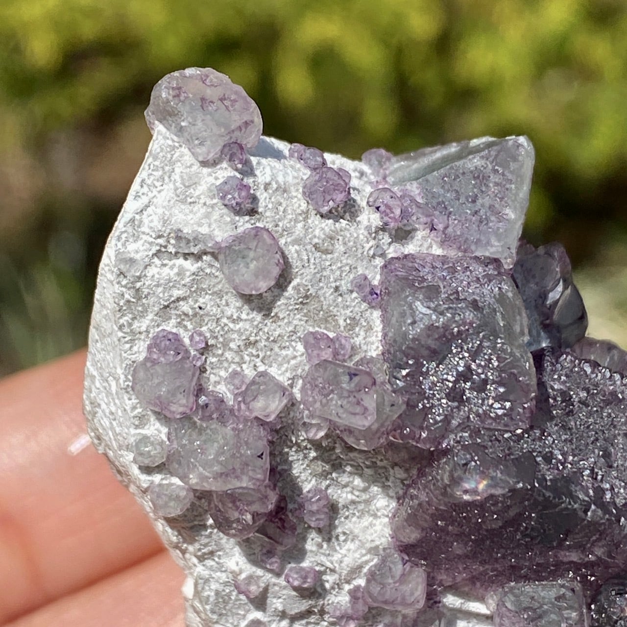 画像ではフローライトは全体的にパープル系に見えがちですが、パープルと淡いグリーンから成ります。太陽光の元では薄く写っていますが、室内では若干濃いめに見えます。