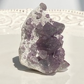 キャンドルクォーツとは水晶の表面に、 長石や石英、カルサイトなどの別鉱物が付着し成長を遂げた特殊な単結晶の一種で、文字通りロウソクのような姿をした水晶のことです。この子は、クォーツ(スモーキークォーツ)の周りの白っぽい石膏の様なテクスチャーのコーティングの上に更にコロコロっとした大小のキュービックやピラミッド型のフローライトが共生しているタイプの子です。頂点にある結晶含め、小さな結晶達が可愛すぎます♡