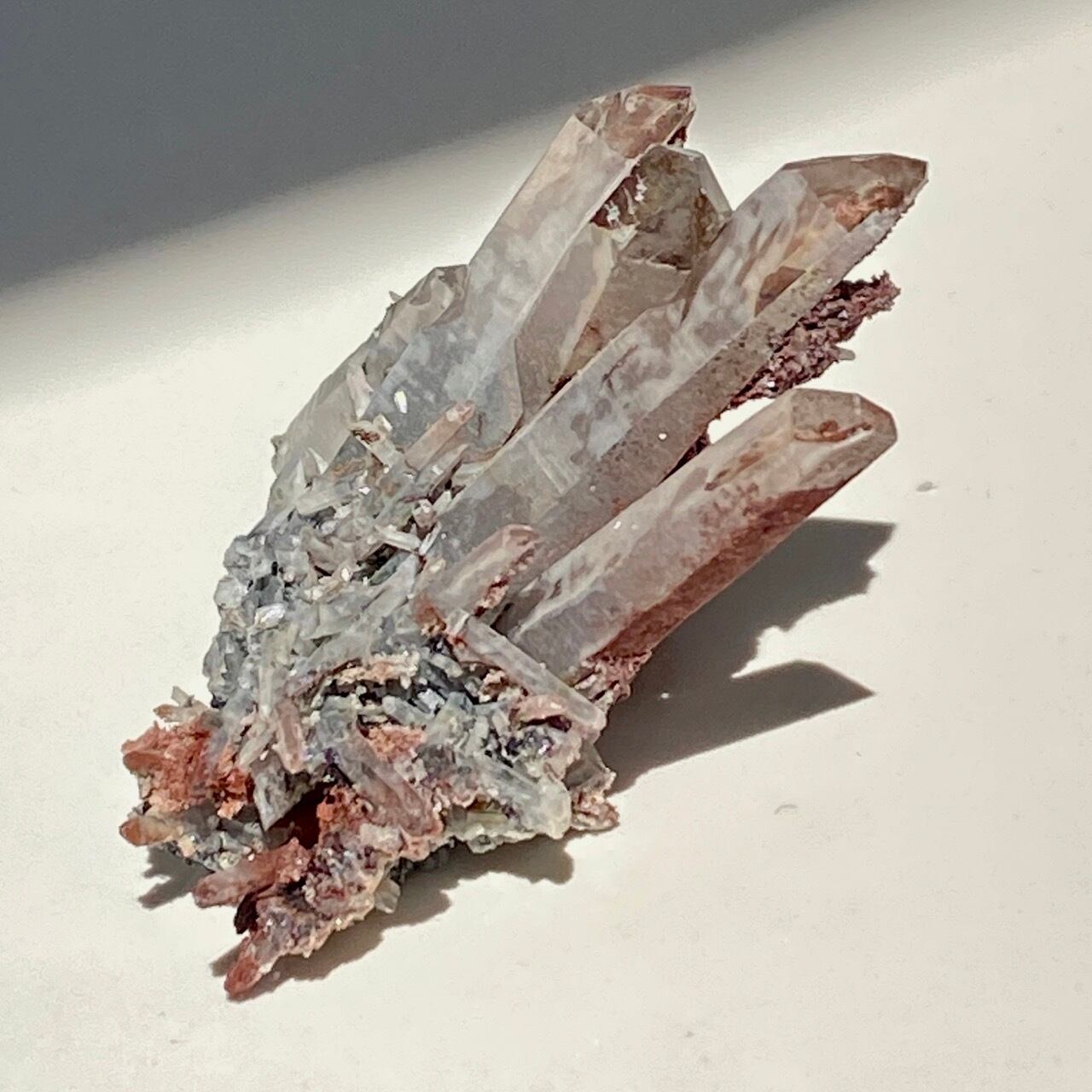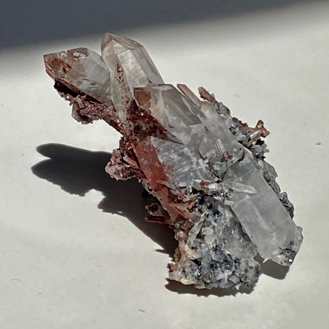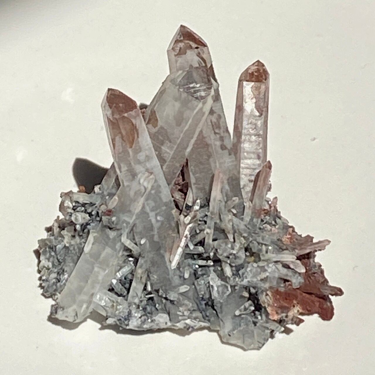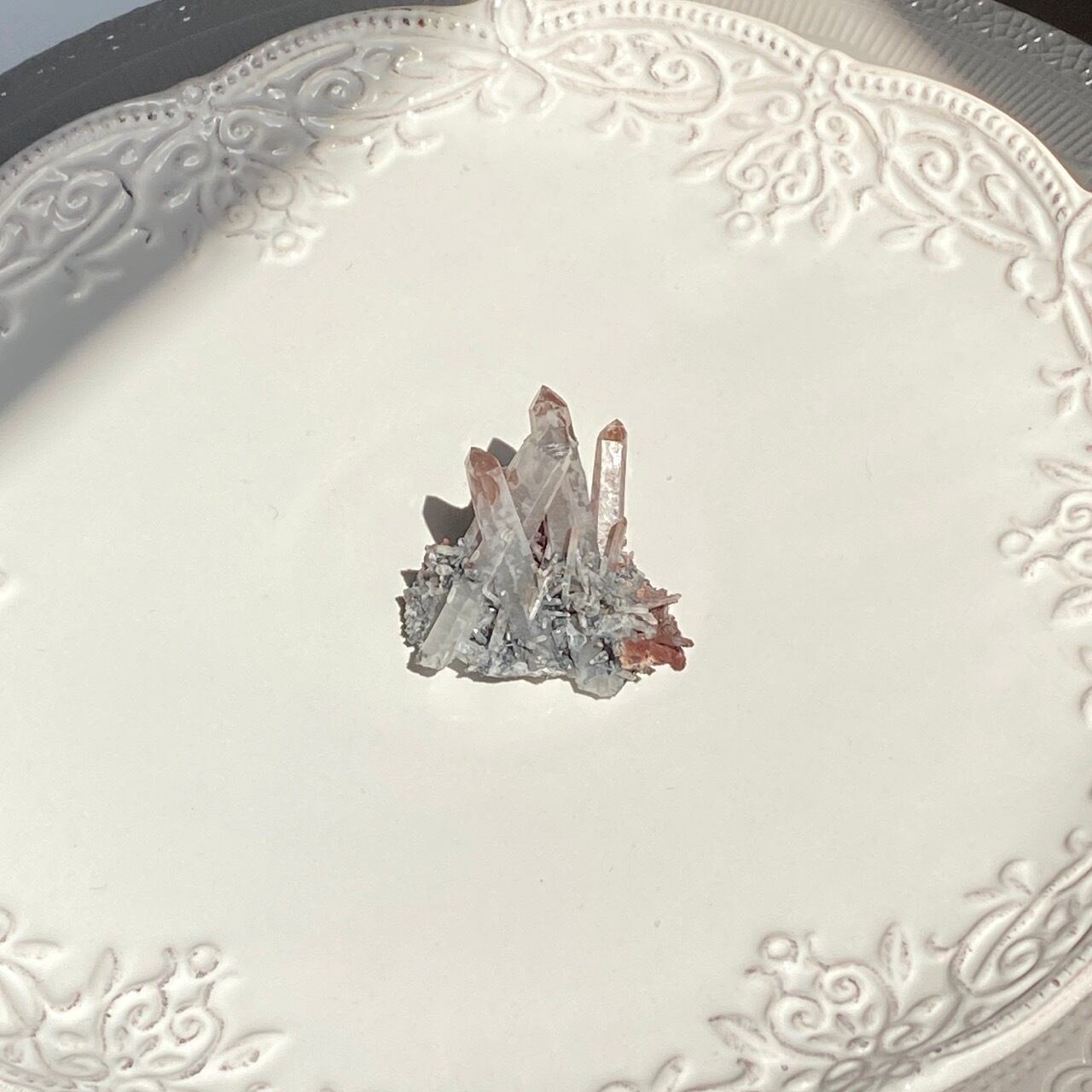 レッドヘマタイト付クォーツ(レッドクォーツとも呼ばれていいます)で下部や底面に微量のスペキュラライトが共生(拡大鏡で見て黒く光る部分で分かる程度)しています。特筆すべきは、その美しいフォーメーションとミニサイズのニードル(針の様な)ポイント達、廃墟を彷彿させるようなシルバーグレーの濃淡の不透明な箇所とファセットを含む透明な箇所のコントラスト、そしてサイドからバックにかけて付着した濃いレッドヘマタイト(画像では薄めに写っておりますが、実際はもっと濃い色味です)。