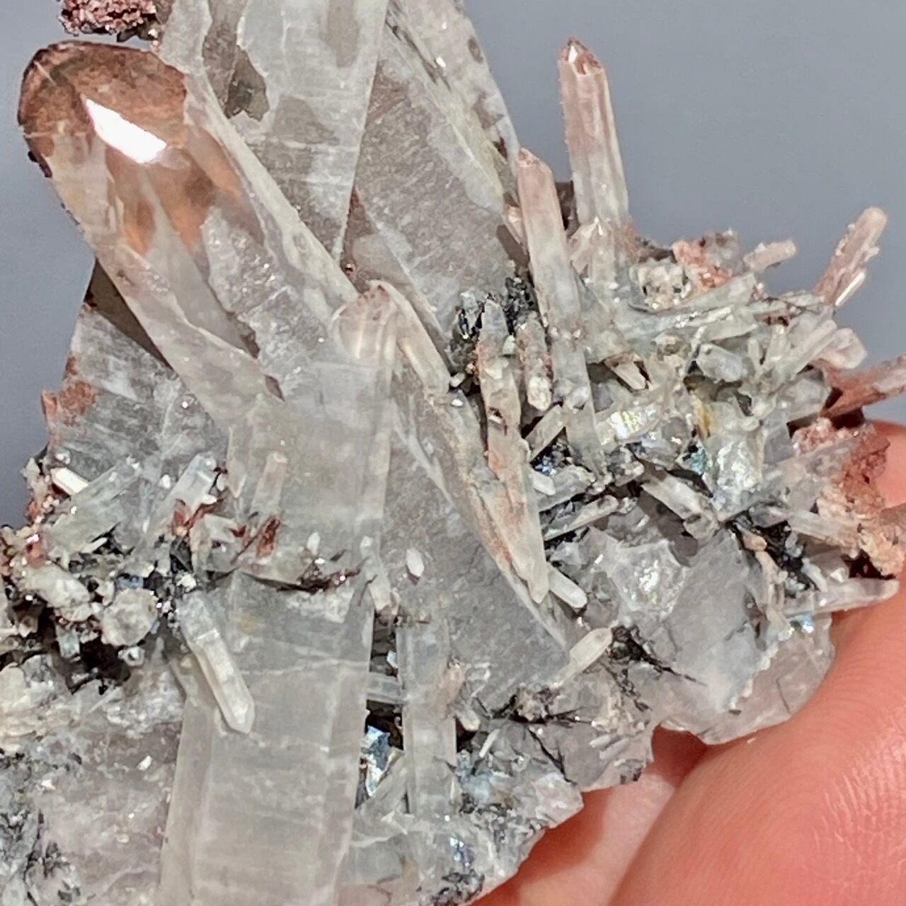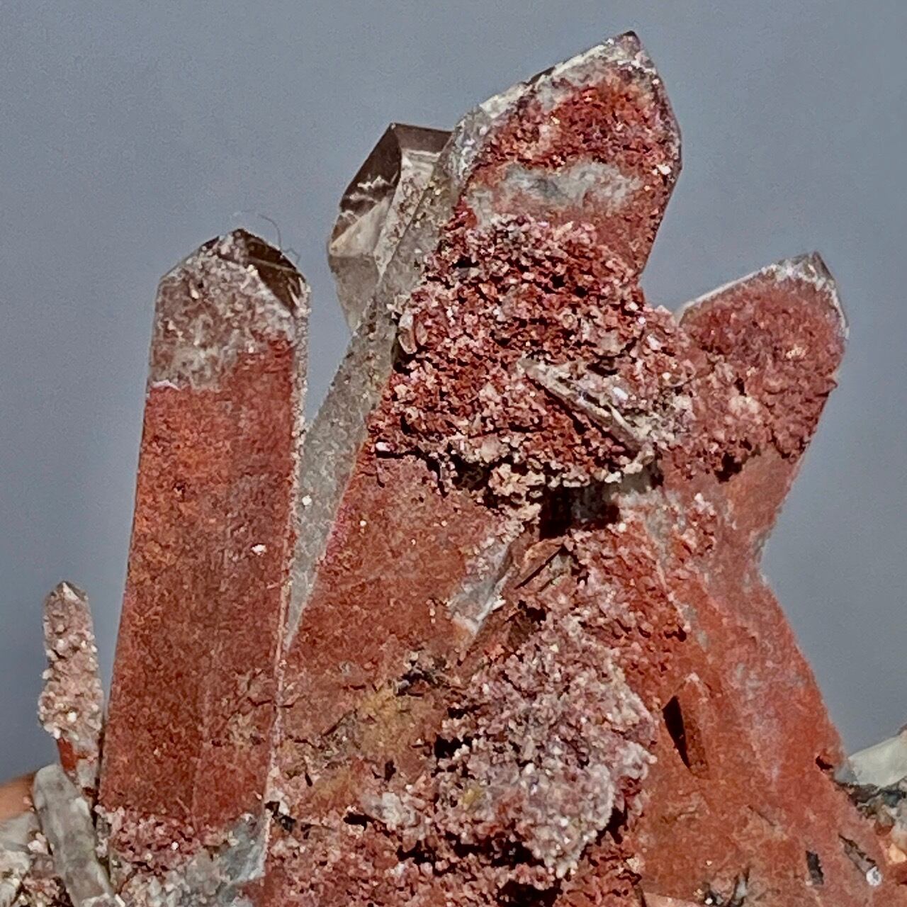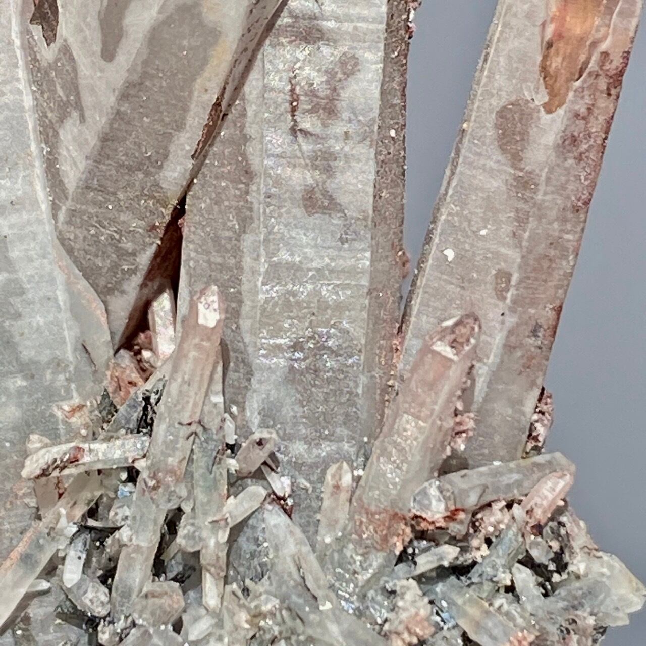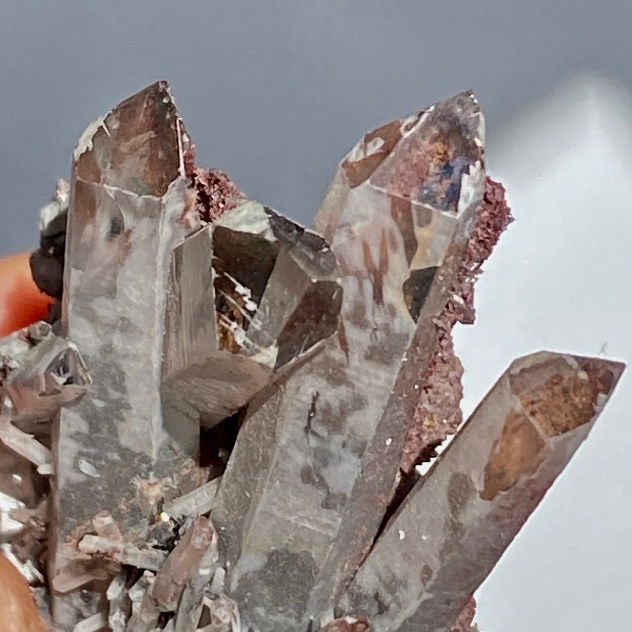 レッドヘマタイト付クォーツ(レッドクォーツとも呼ばれていいます)で下部や底面に微量のスペキュラライトが共生(拡大鏡で見て黒く光る部分で分かる程度)しています。特筆すべきは、その美しいフォーメーションとミニサイズのニードル(針の様な)ポイント達、廃墟を彷彿させるようなシルバーグレーの濃淡の不透明な箇所とファセットを含む透明な箇所のコントラスト、そしてサイドからバックにかけて付着した濃いレッドヘマタイト(画像では薄めに写っておりますが、実際はもっと濃い色味です)。