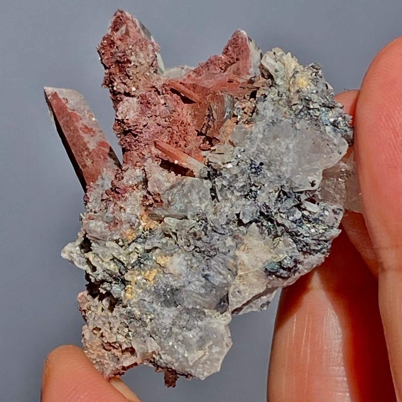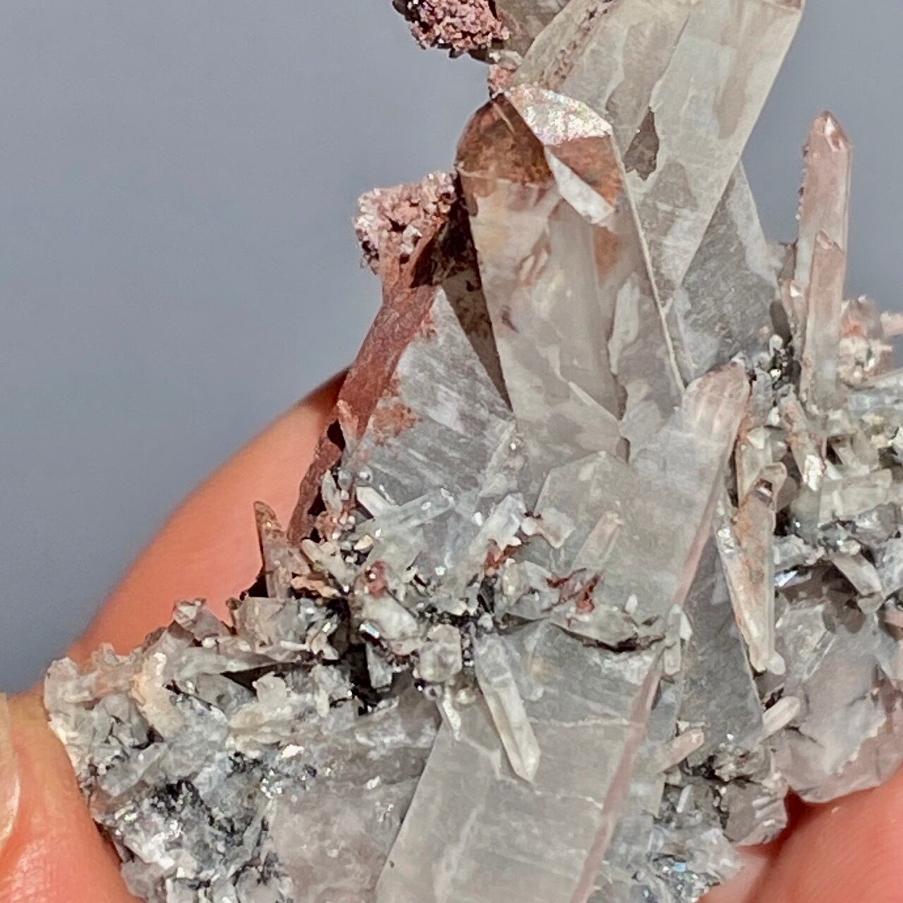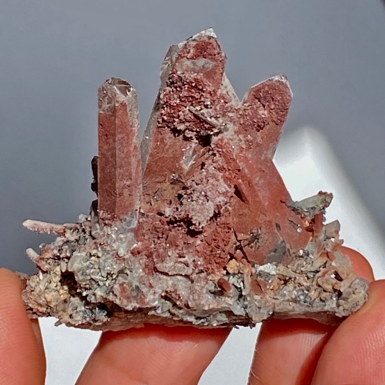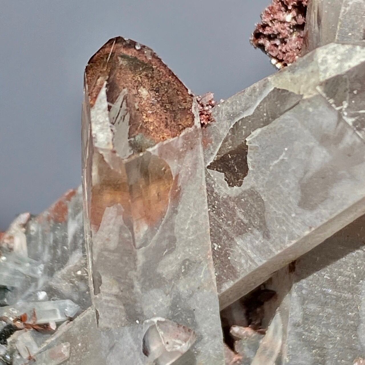 レッドヘマタイト付クォーツ(レッドクォーツとも呼ばれていいます)で下部や底面に微量のスペキュラライトが共生(拡大鏡で見て黒く光る部分で分かる程度)しています。特筆すべきは、その美しいフォーメーションとミニサイズのニードル(針の様な)ポイント達、廃墟を彷彿させるようなシルバーグレーの濃淡の不透明な箇所とファセットを含む透明な箇所のコントラスト、そしてサイドからバックにかけて付着した濃いレッドヘマタイト(画像では薄めに写っておりますが、実際はもっと濃い色味です)。