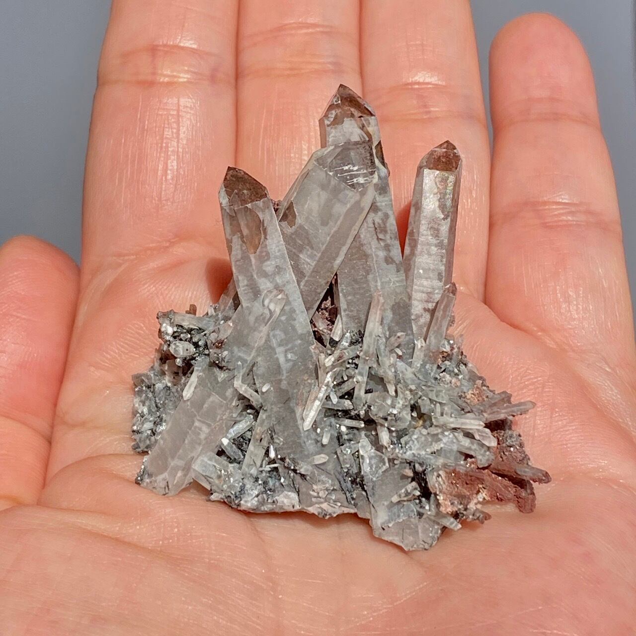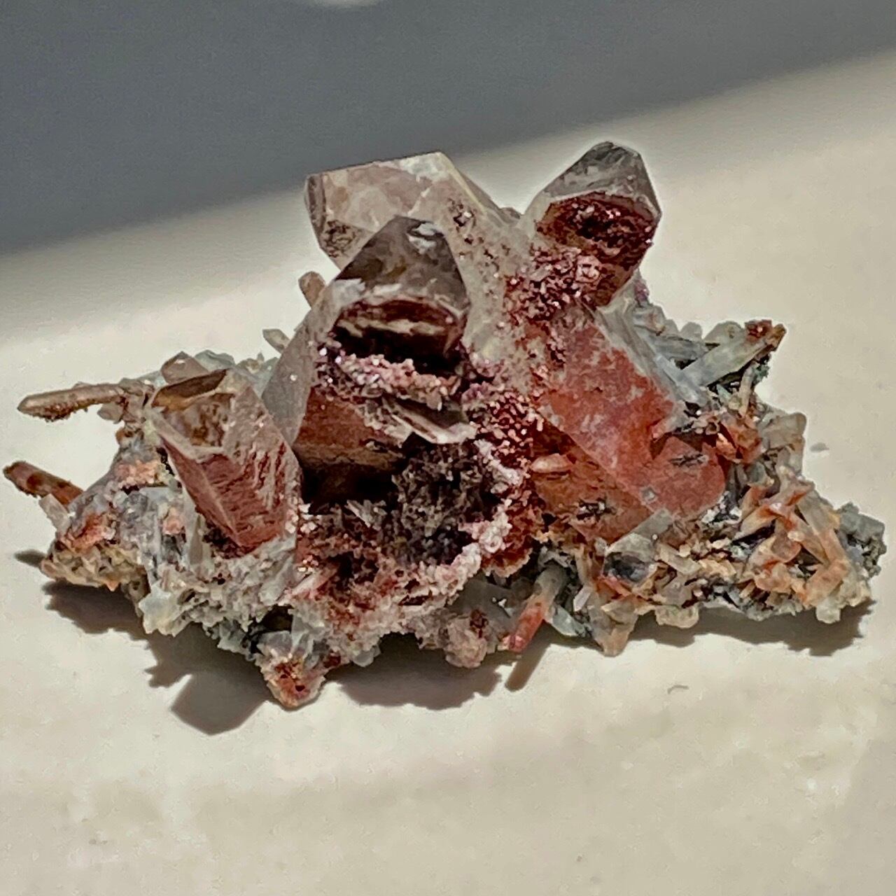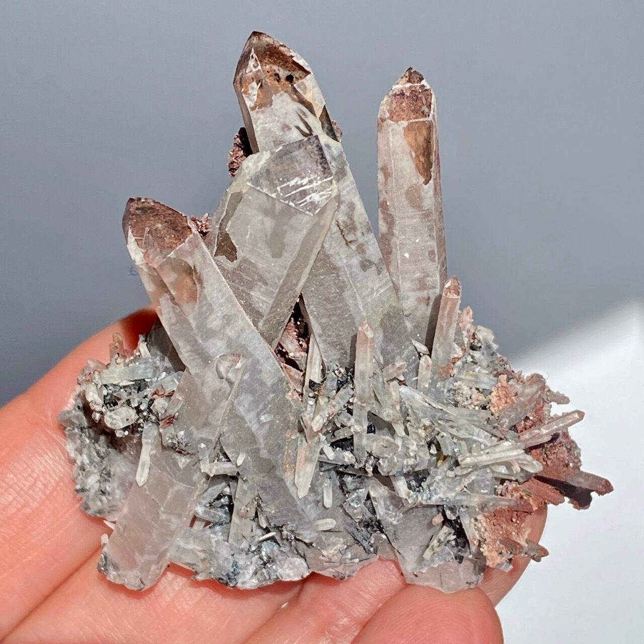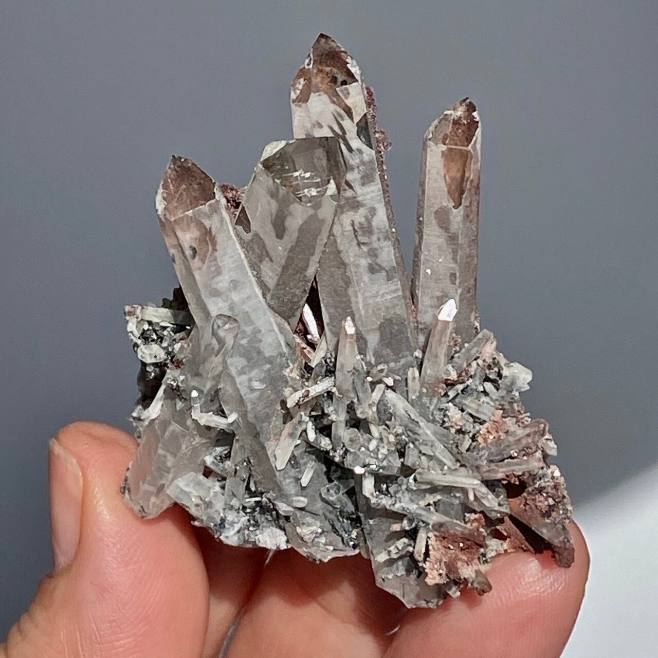 レッドヘマタイト付クォーツ(レッドクォーツとも呼ばれていいます)で下部や底面に微量のスペキュラライトが共生(拡大鏡で見て黒く光る部分で分かる程度)しています。特筆すべきは、その美しいフォーメーションとミニサイズのニードル(針の様な)ポイント達、廃墟を彷彿させるようなシルバーグレーの濃淡の不透明な箇所とファセットを含む透明な箇所のコントラスト、そしてサイドからバックにかけて付着した濃いレッドヘマタイト(画像では薄めに写っておりますが、実際はもっと濃い色味です)。
