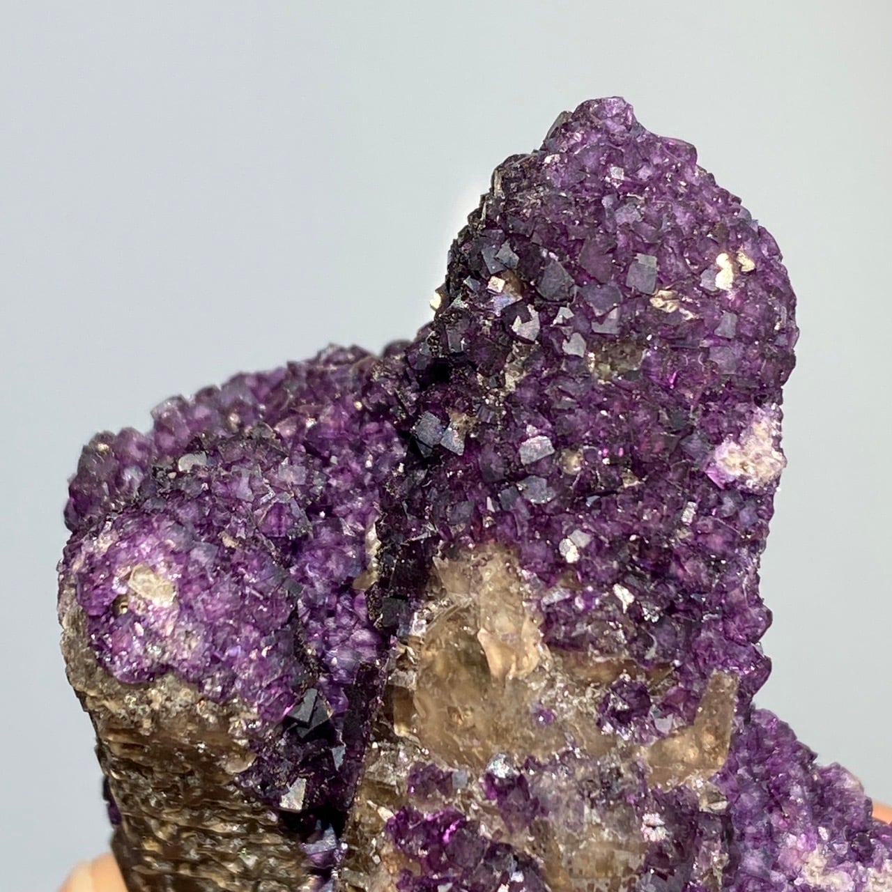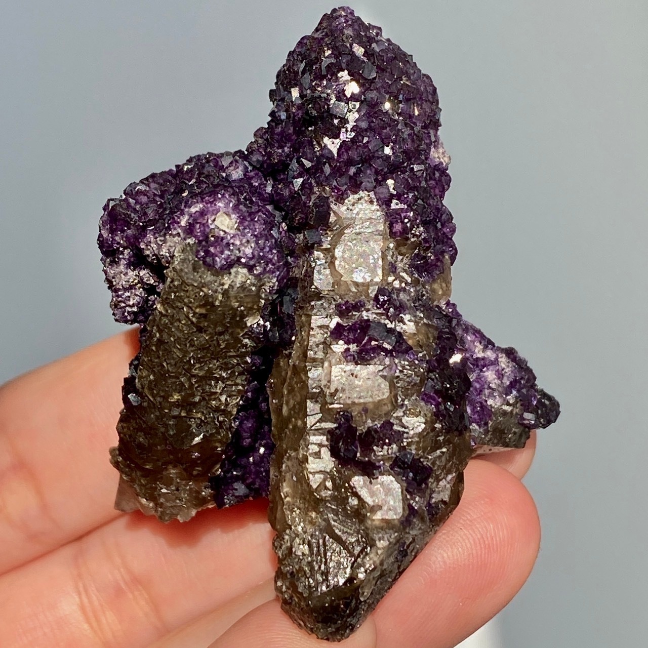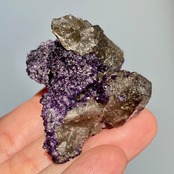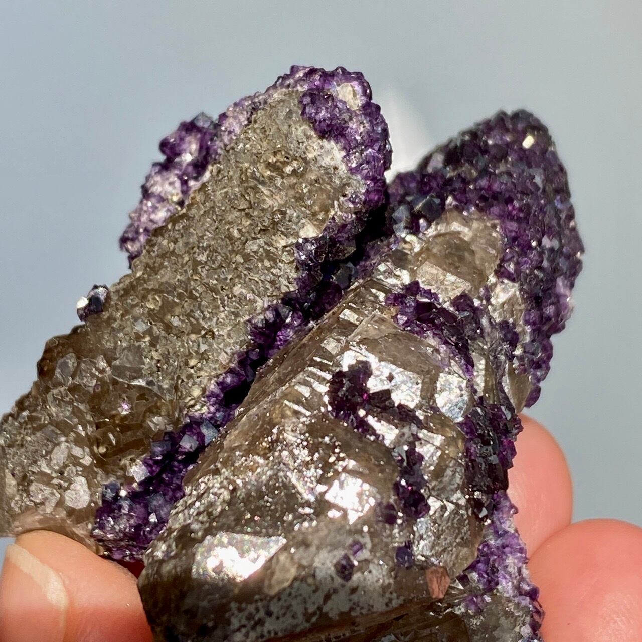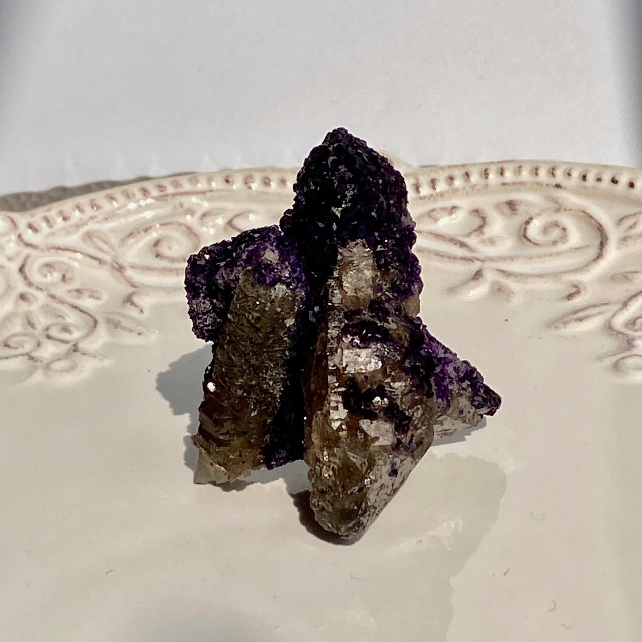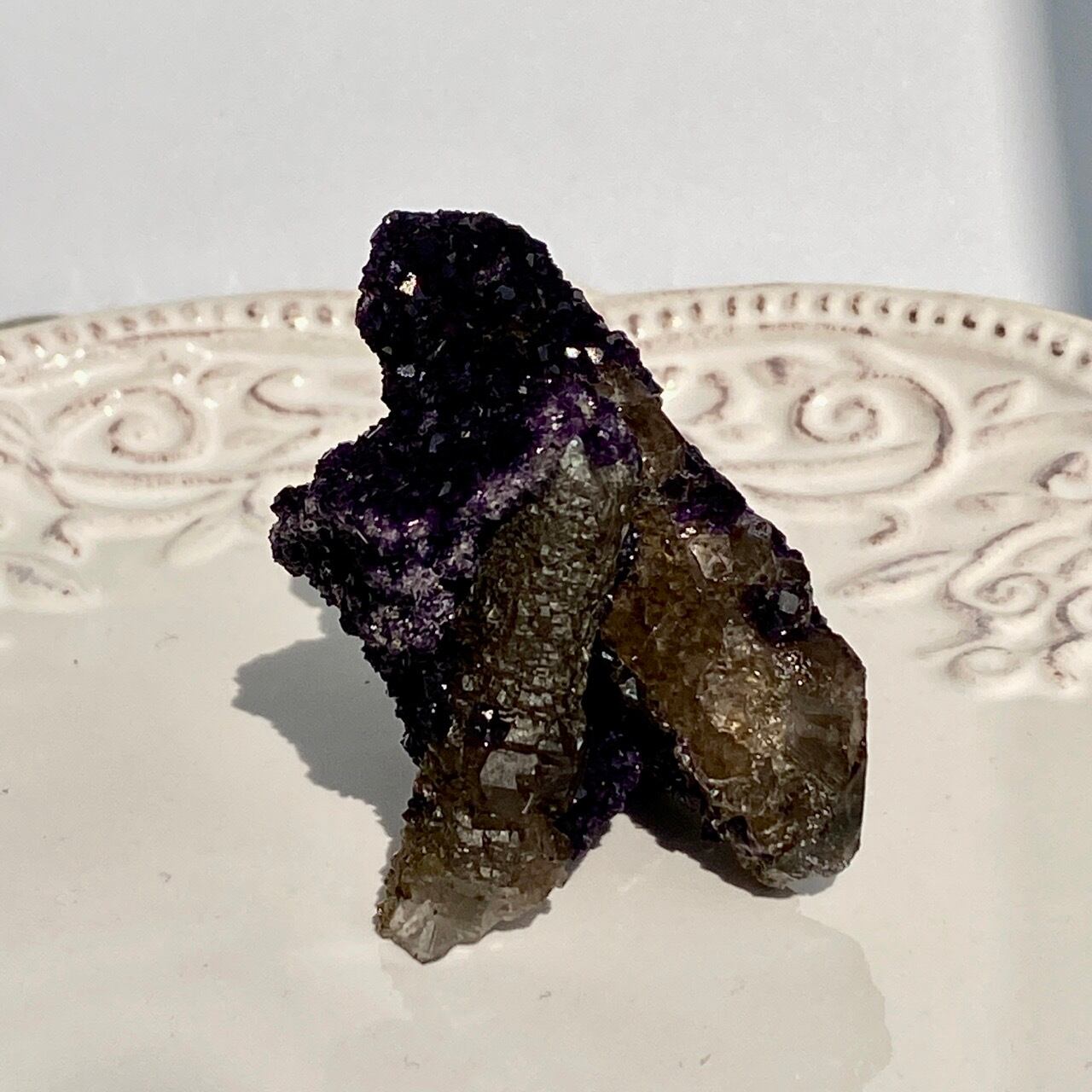 中国の内モンゴル自治区のクリスタルの素晴らしさとその鉱物共生のバリエーションに感動が止まない店主ですが、今回ご紹介するのが、スモーキークォーツにパープルフローライトが共生する子です。