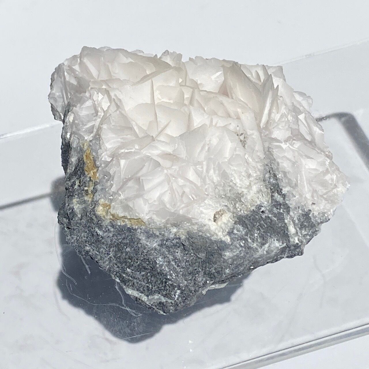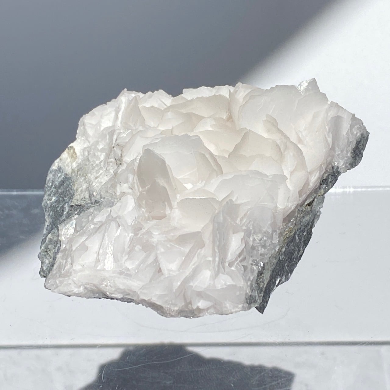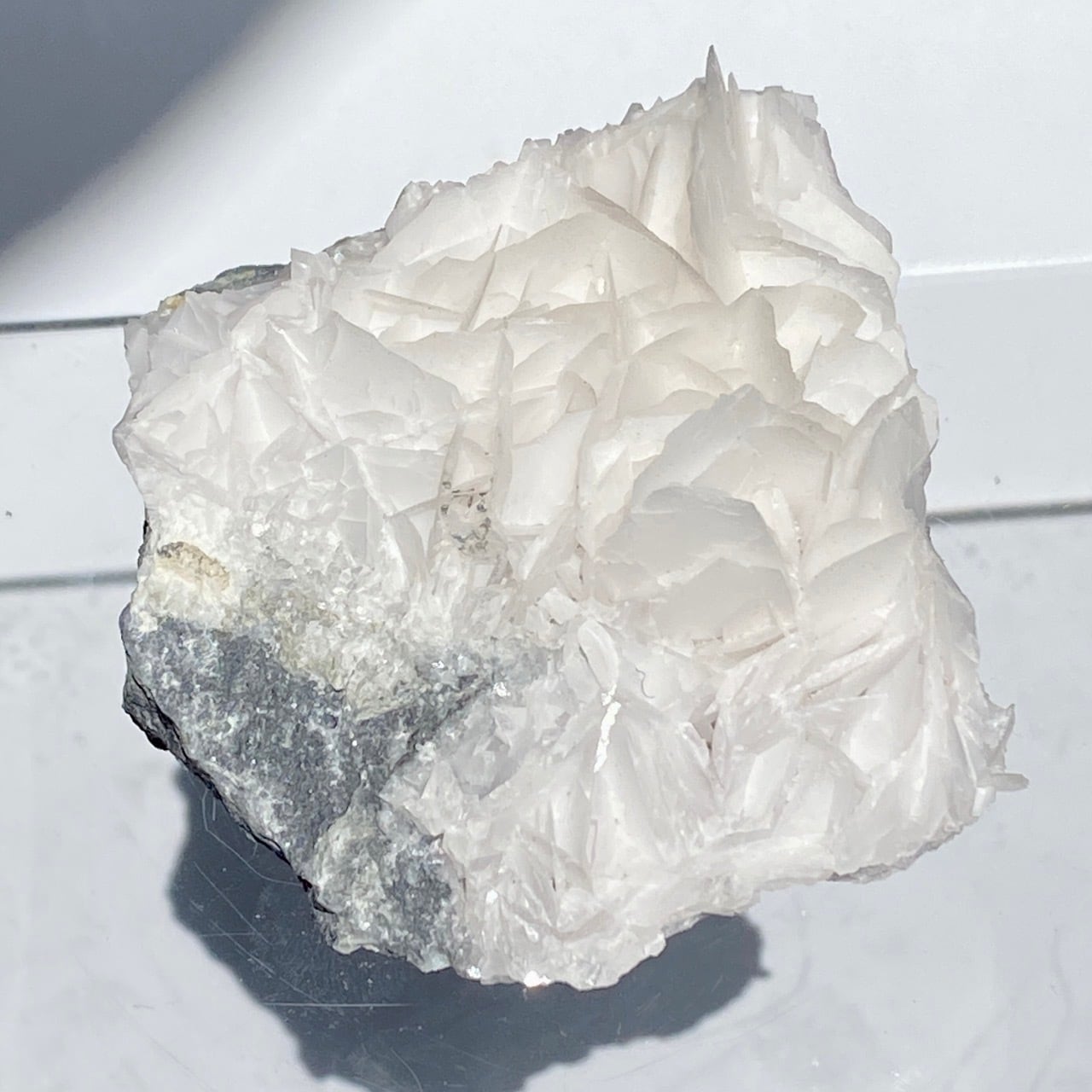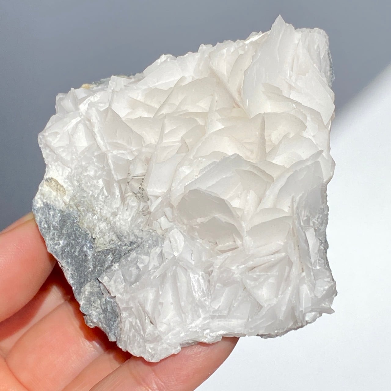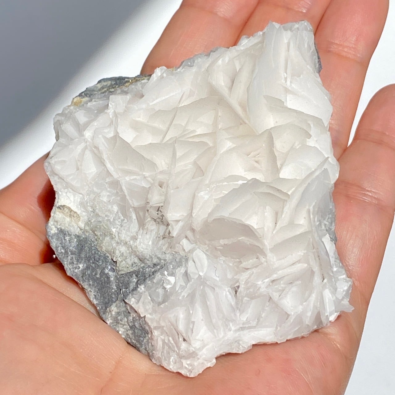 花びらような結晶が交差して形成されており、デザートローズとは異なる純白の美しさがあります。母岩部分とのコントラストも魅力的です。